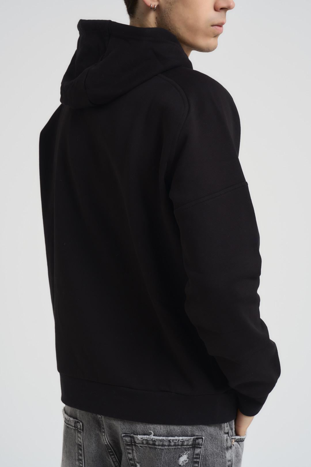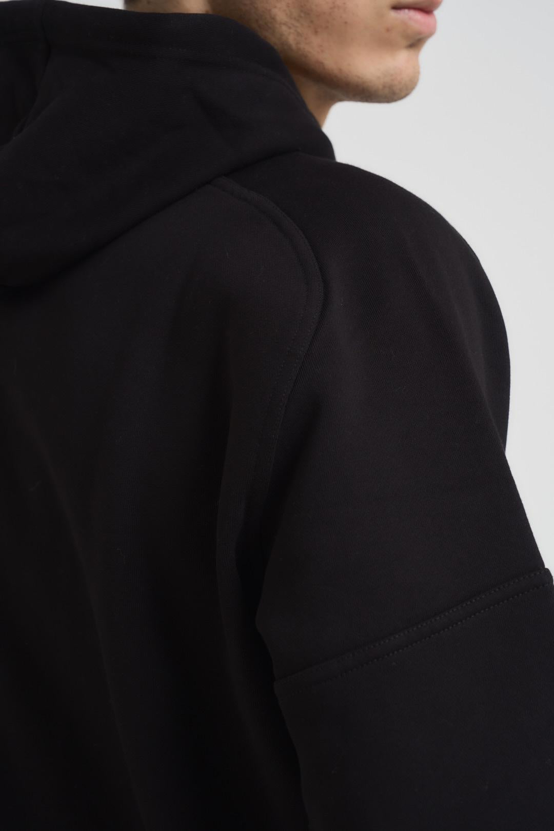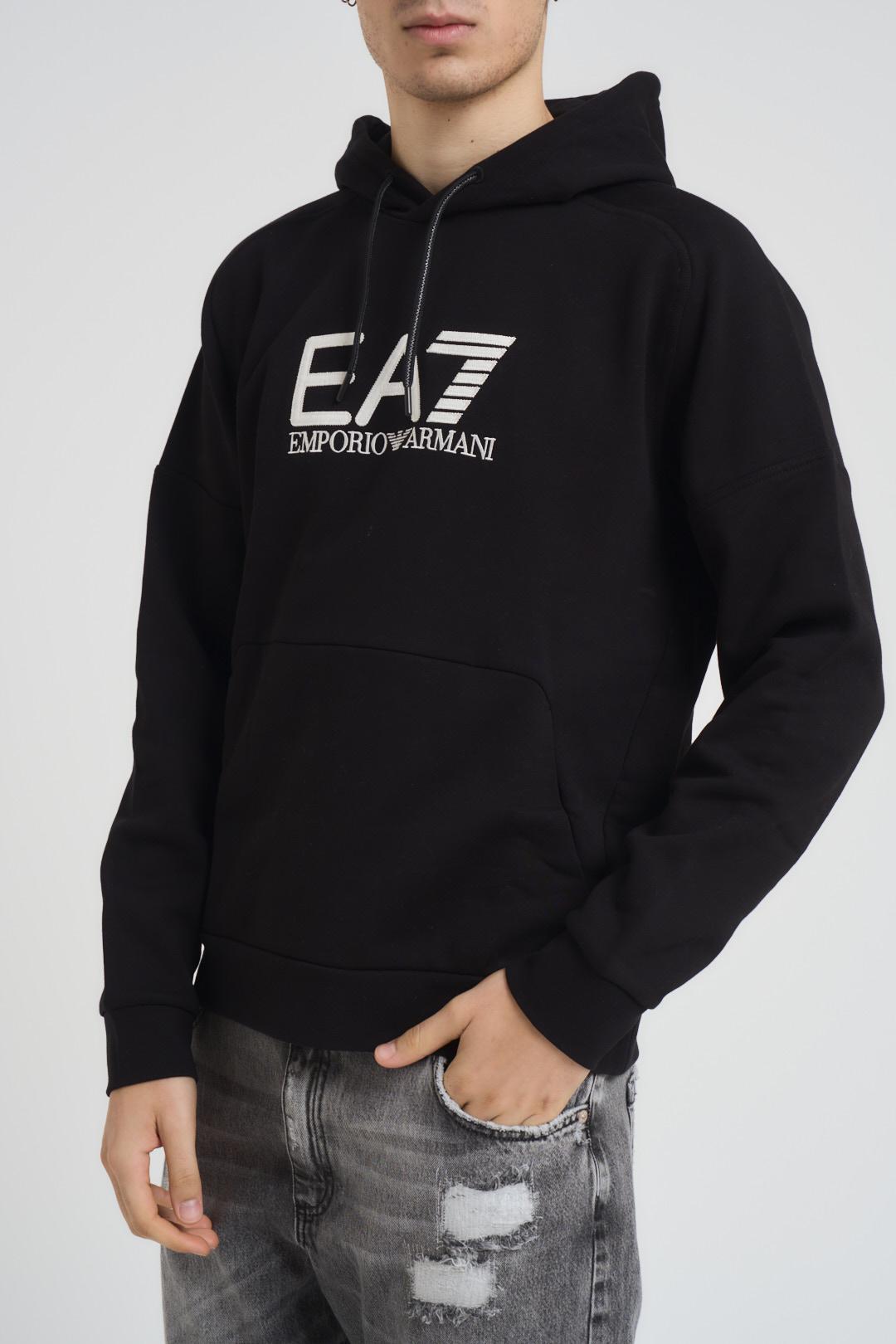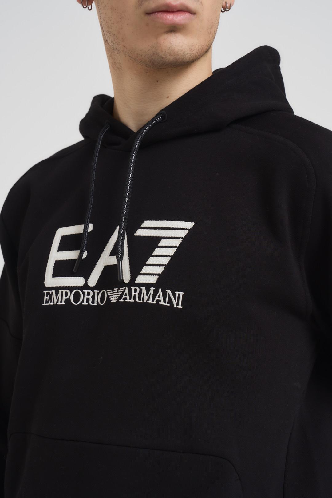 EA7 Felpa uomo con cappuccio nera. Modello con grafica brand in bianco frontale, tasca a marsupio, dettagli a costine e cappuccio con coulisse regolabile. Composizione: 85% cotone, 15% poliestere. Il modello è alto 190cm e indossa la taglia L.