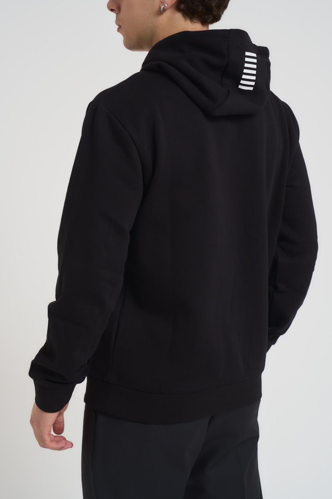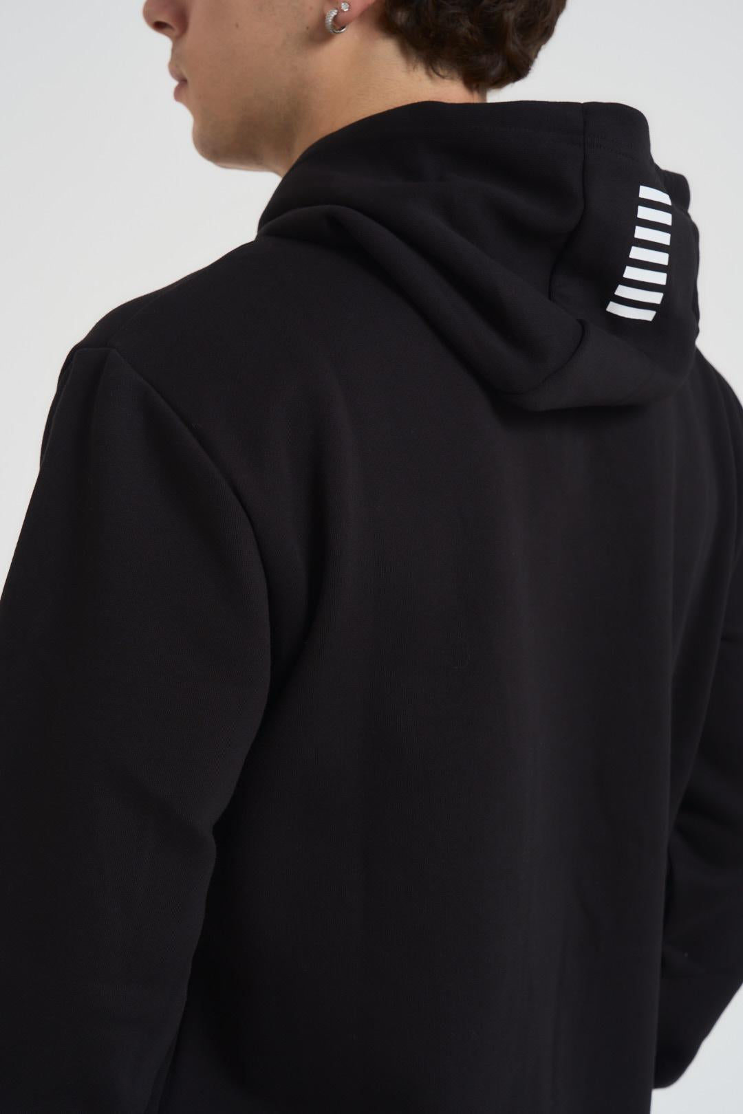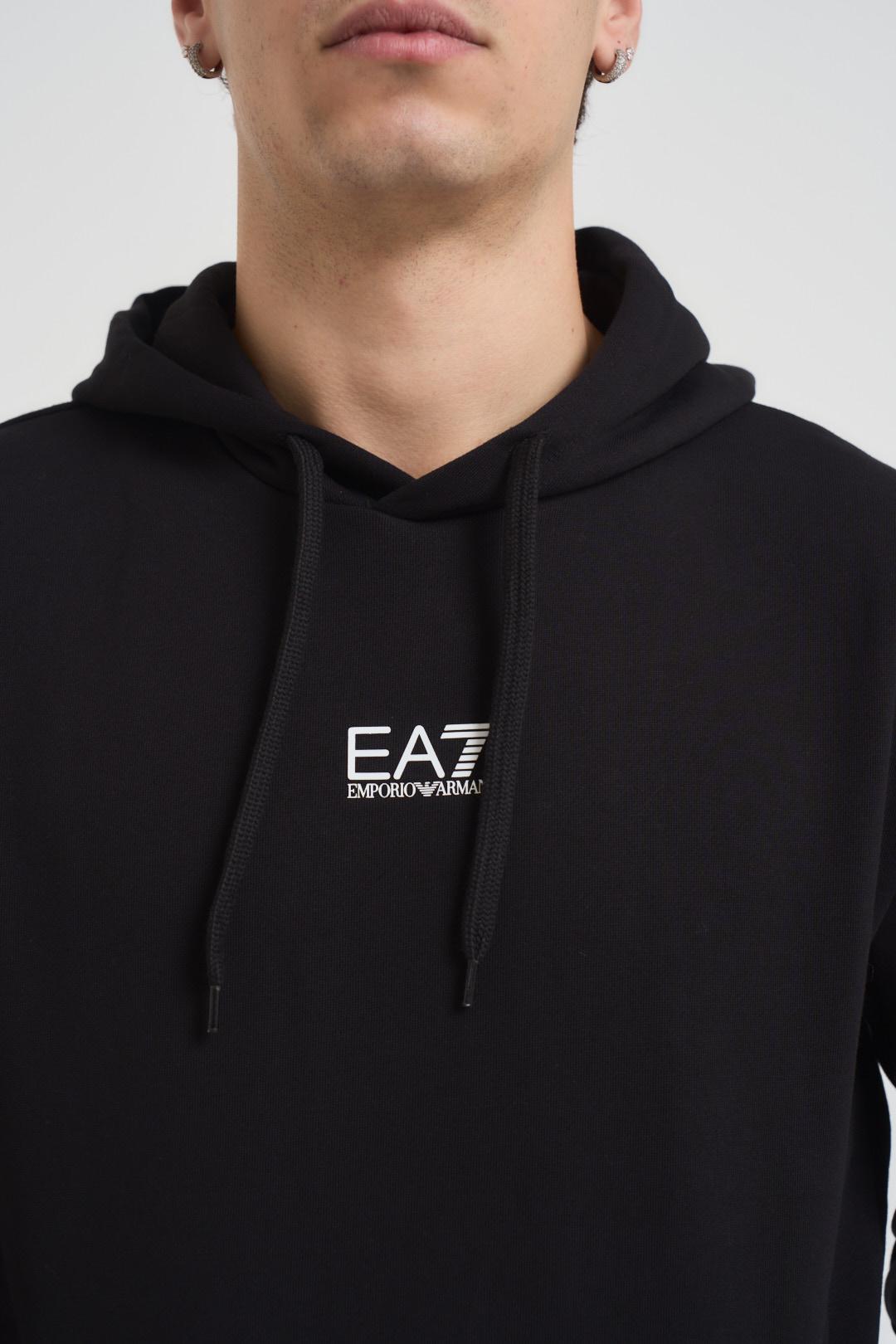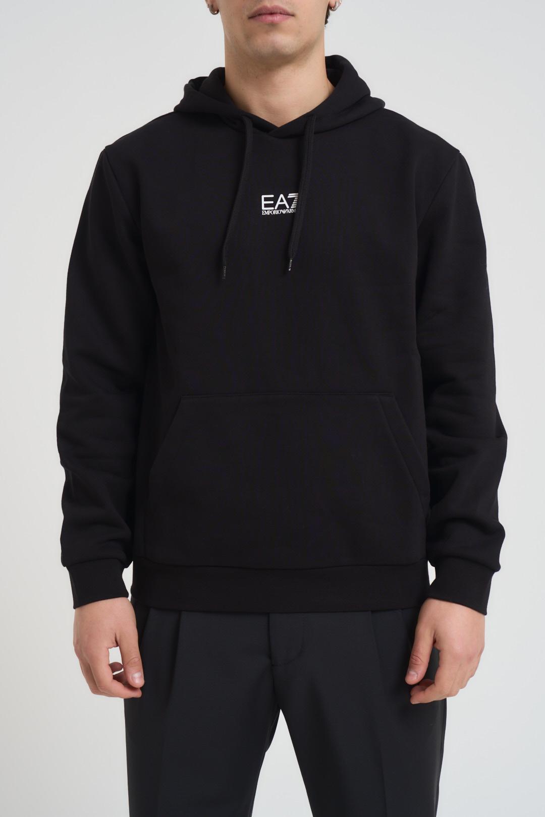 EA7 Felpa uomo con cappuccio nera. Modello con logo centrale bianco, regular fit, tasca a marsupio centrale. Composizione: 85% cotone, 15% poliestere. Il modello è alto 190cm e indossa la taglia L.