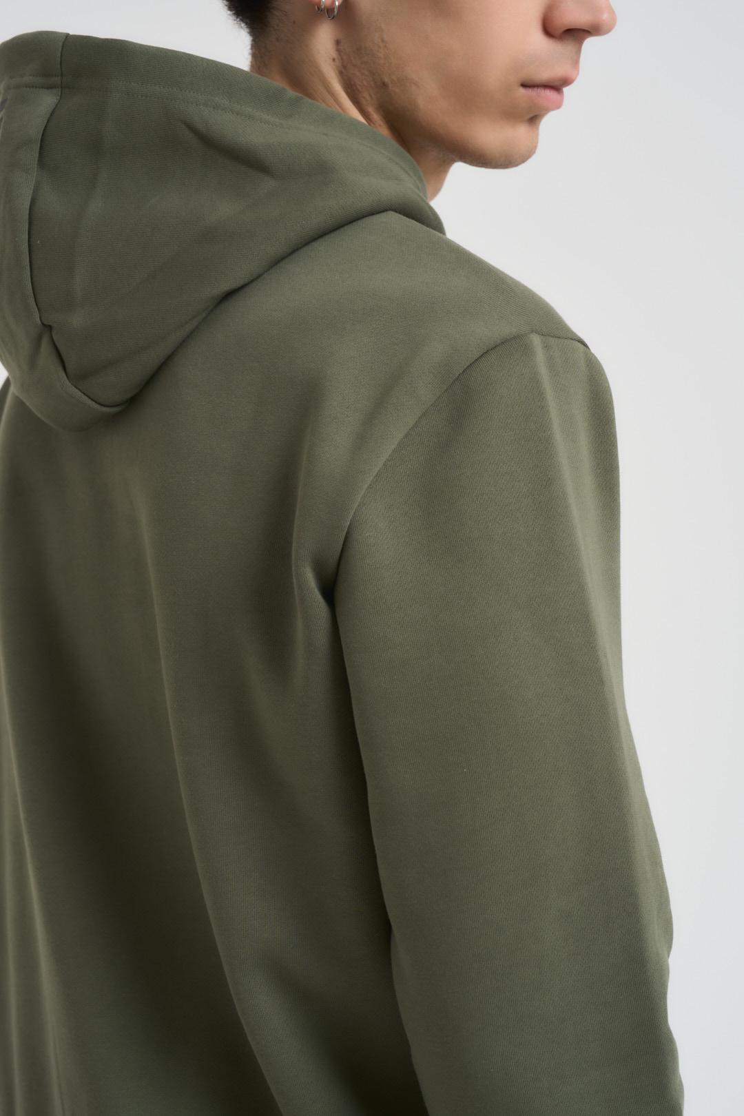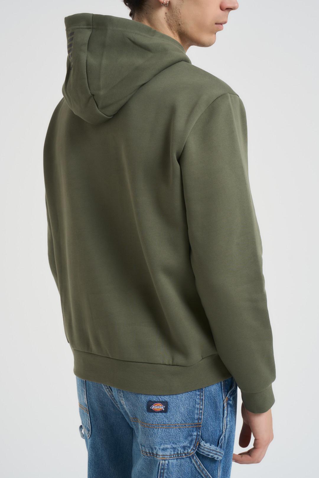EA7 Felpa uomo con cappuccio verde. Modello con logo centrale nero, regular fit, tasca a marsupio centrale. Composizione: cotone felpato. Il modello è alto 190cm e indossa la taglia L.