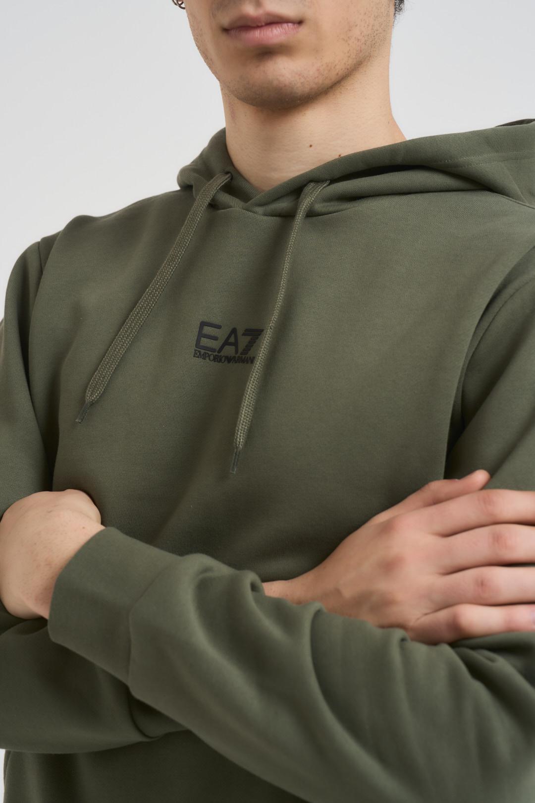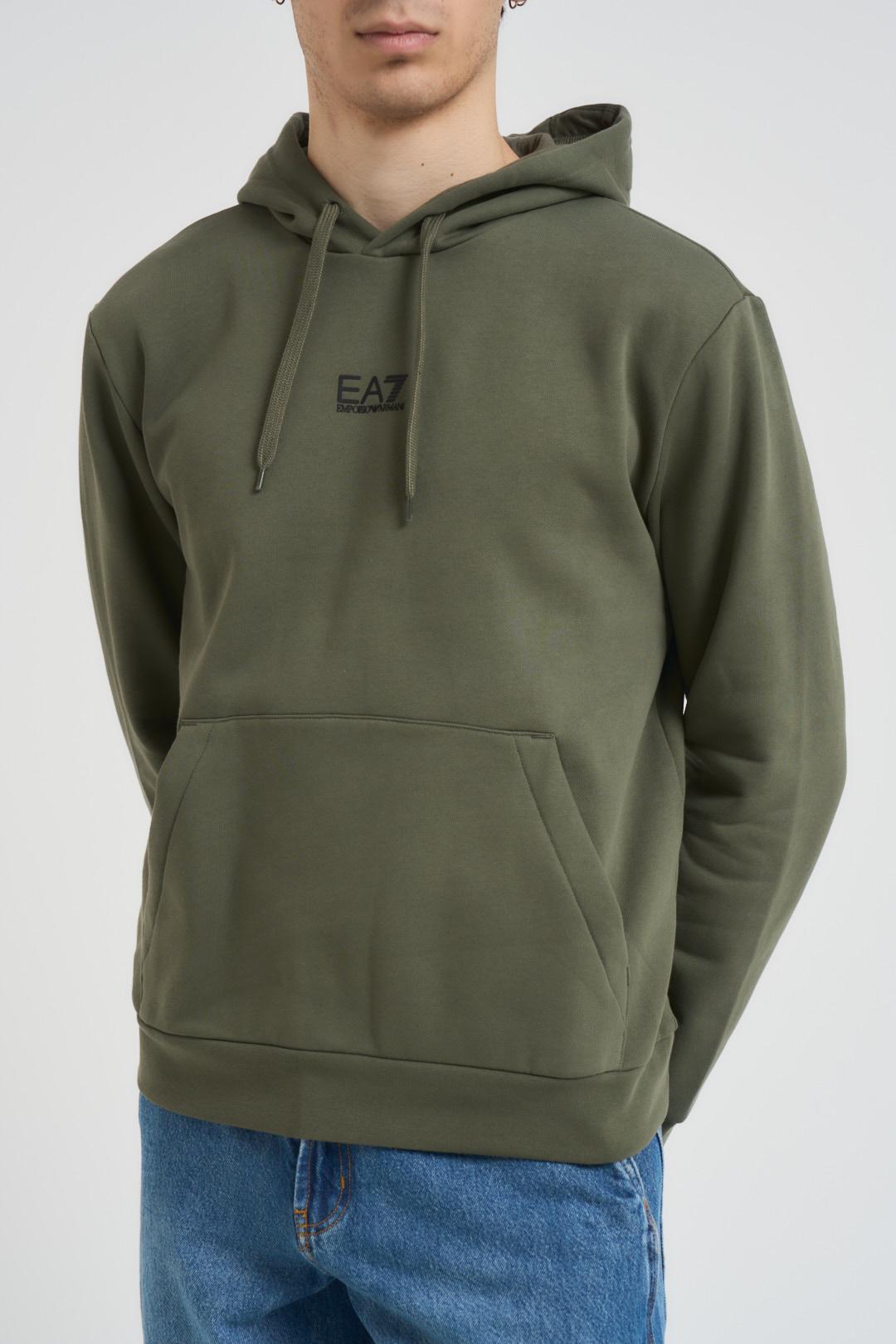 EA7 Felpa uomo con cappuccio verde. Modello con logo centrale nero, regular fit, tasca a marsupio centrale. Composizione: 85% cotone, 15% poliestere. Il modello è alto 190cm e indossa la taglia L.