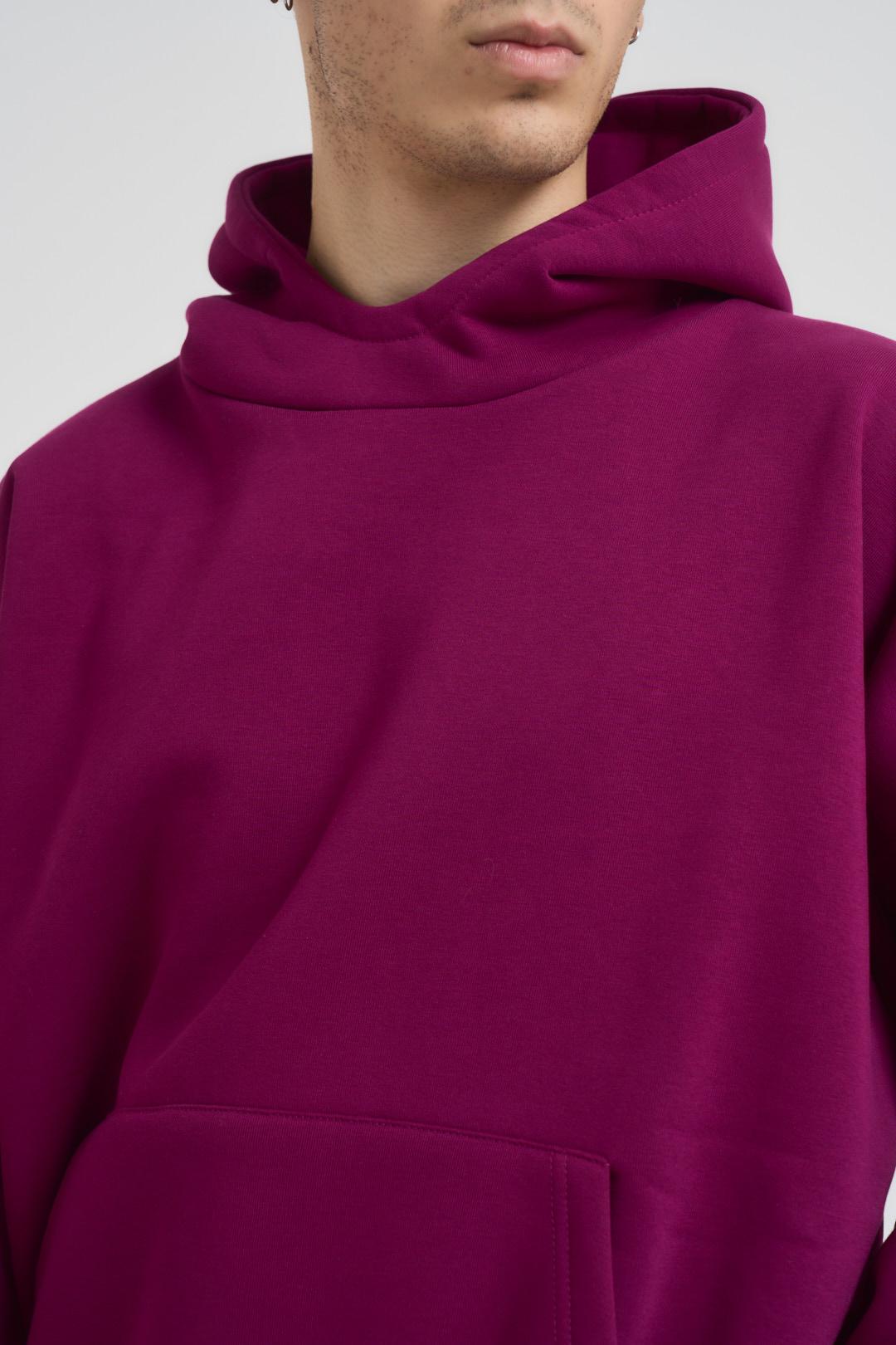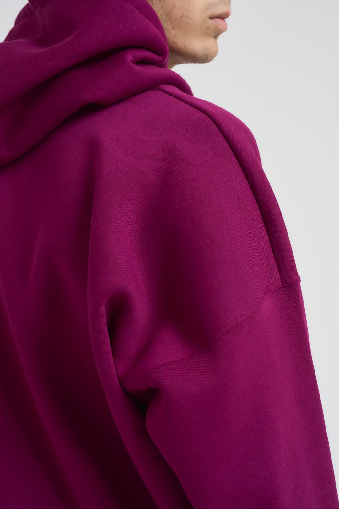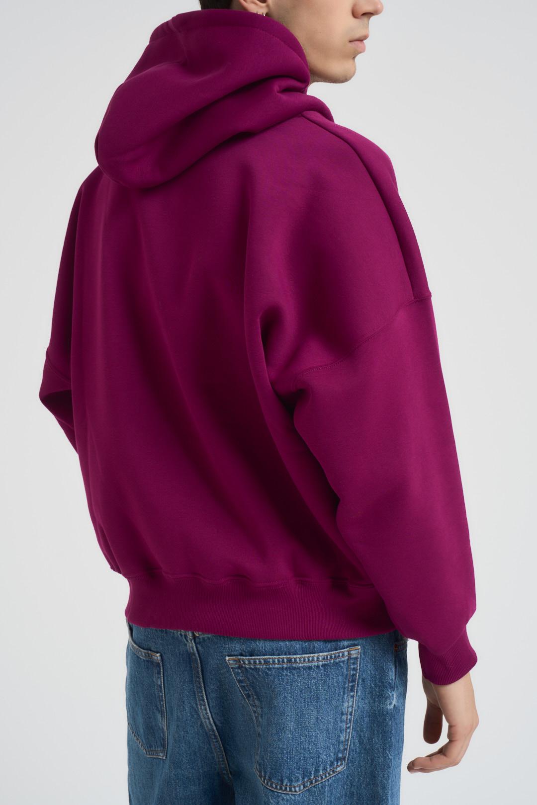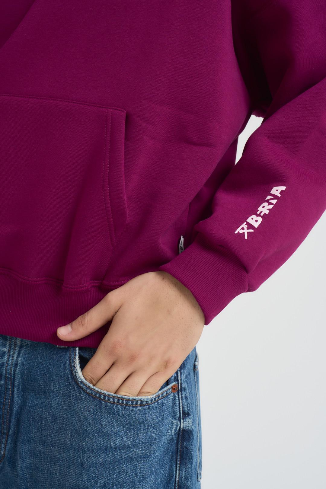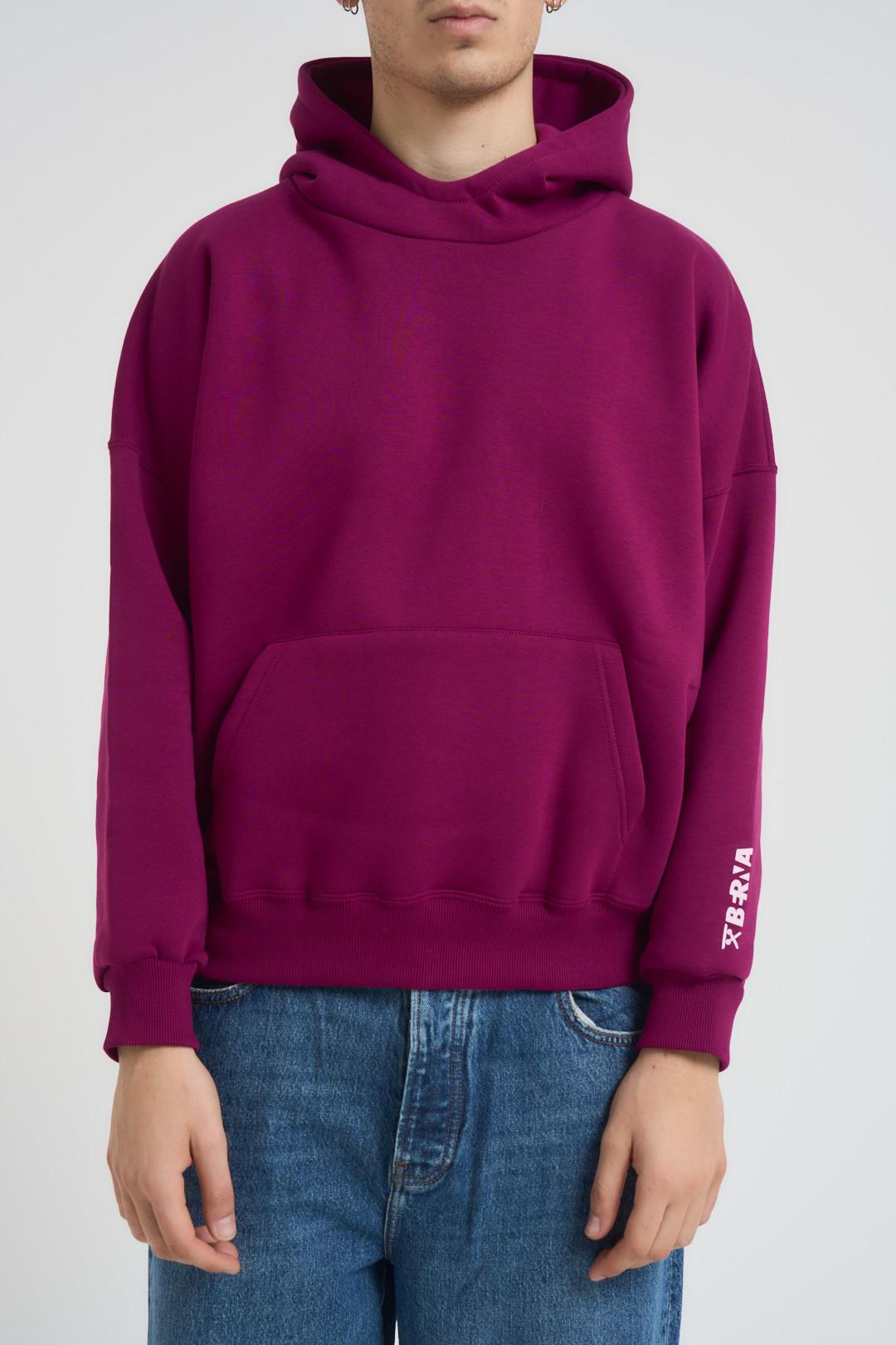 BERNA Felpa uomo con cappuccio viola. Modello boxy fit a manica lunga con dettagli a costine, stampa brand in bianco sulla manica a sinistra. Composizione: 100% Cotone. Il modello è alto 190cm e indossa la taglia L.