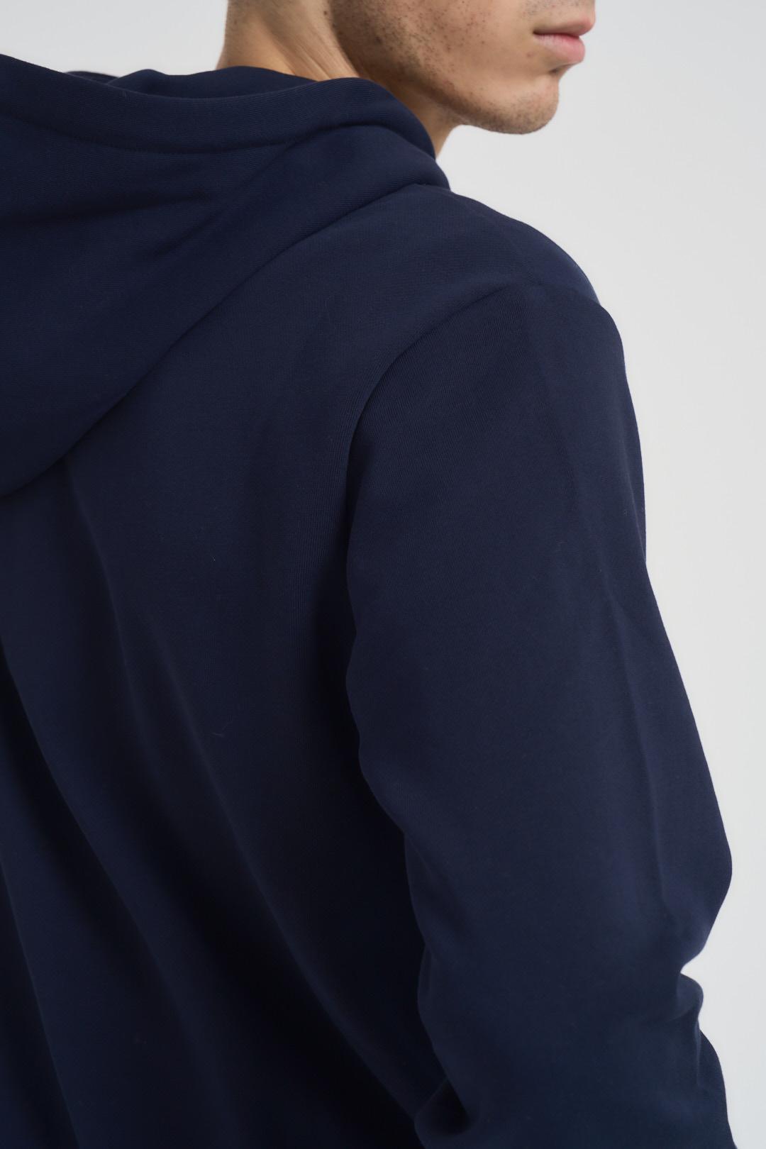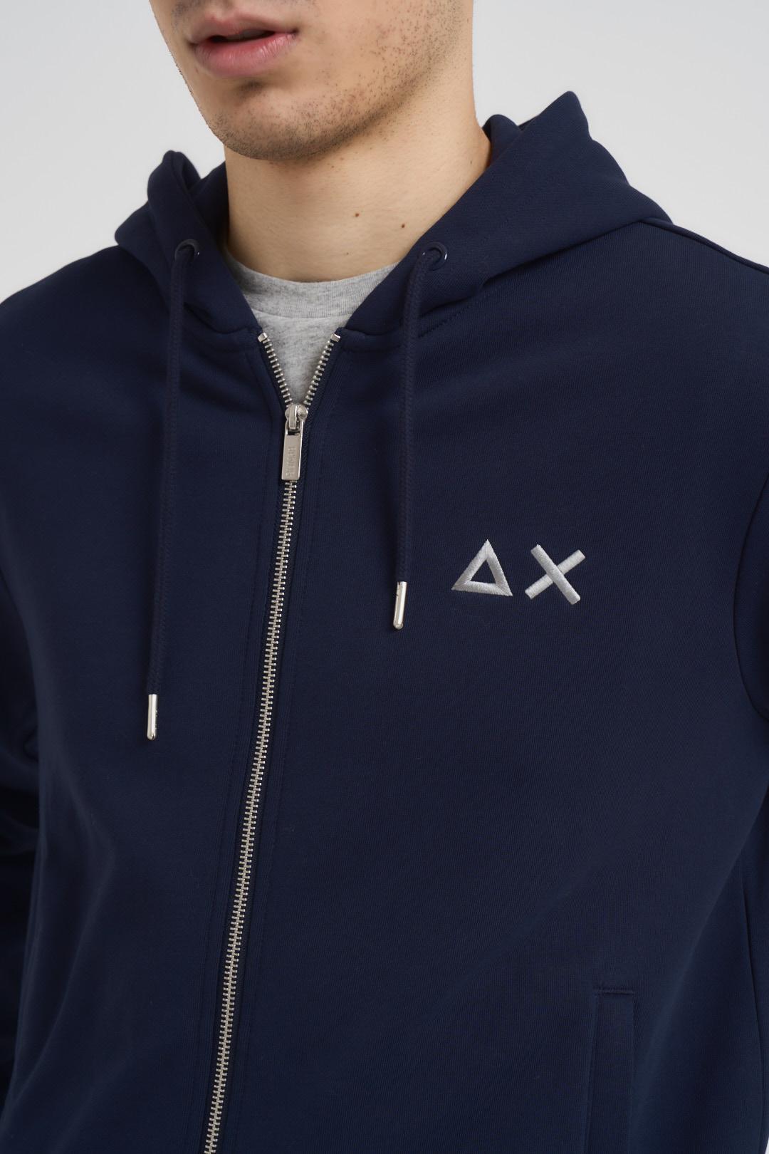 SUN68 Felpa uomo con zip blu notte. Modello con cappuccio con coulisse e full zip, logo brand ricamato sul petto a sinistra in bianco. Tasche laterali. Composizione: 84% Cotone, 16% Poliestere.