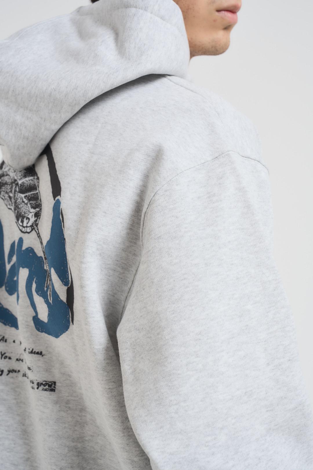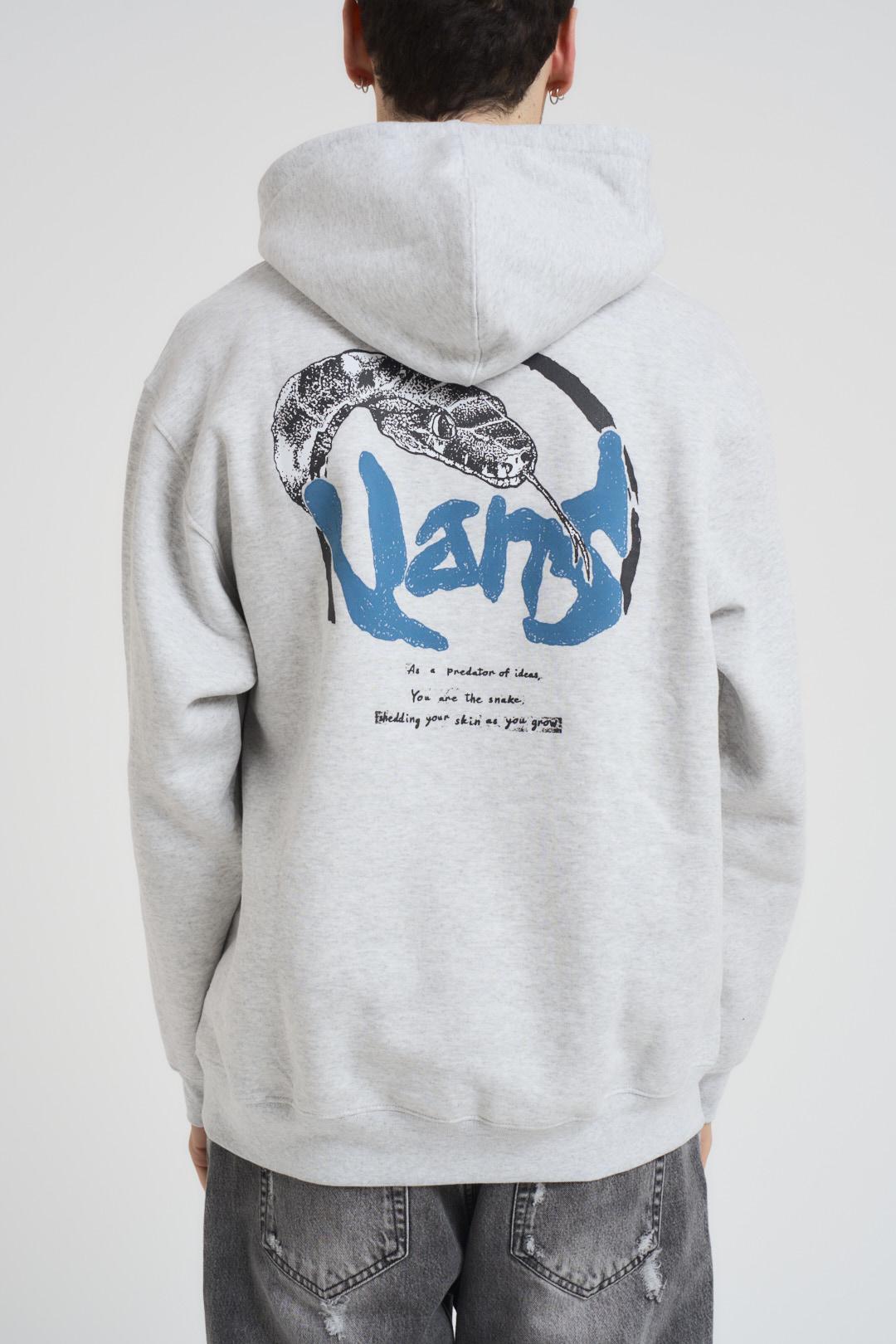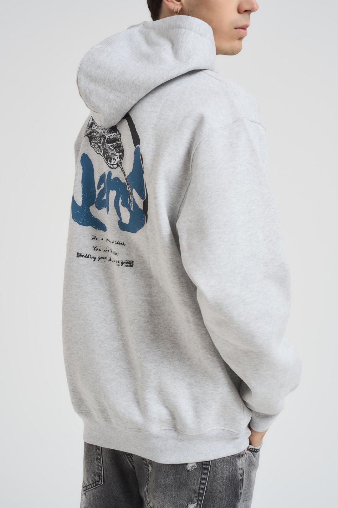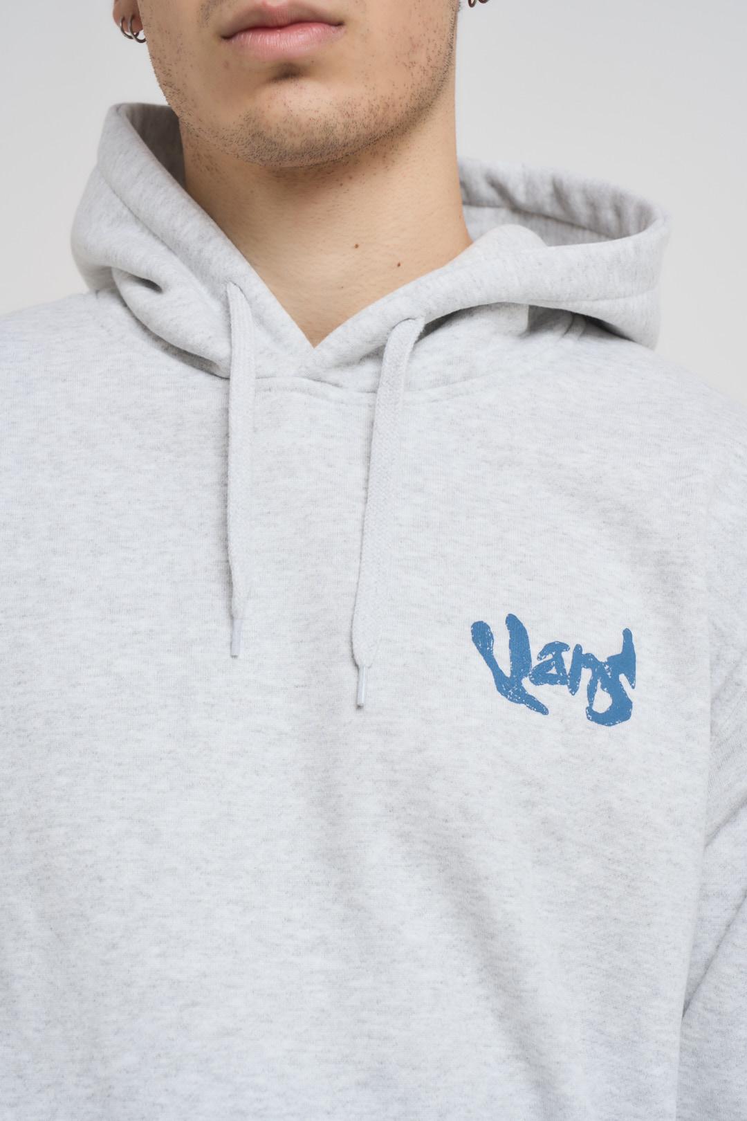 VANS Felpa uomo Evolve con cappuccio grigio chiaro. Modello con cappuccio e coulisse regolabile, stampa sul petto a sinistra e dettaglio grafica con serpente e logo Vans sul retro. Composizione: 70% cotone 30% poliestere. Il modello è alto 190cm e indossa la taglia L.