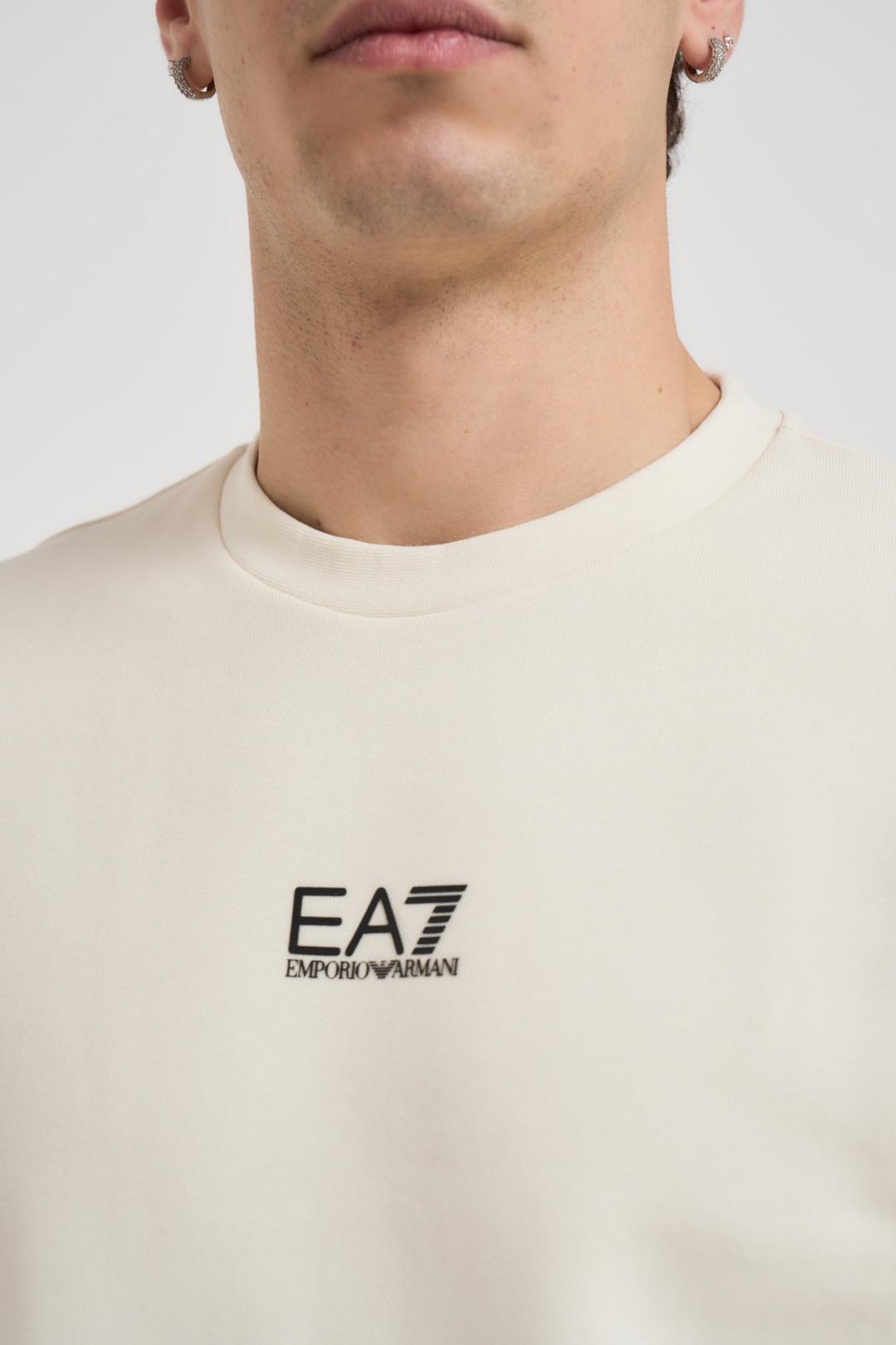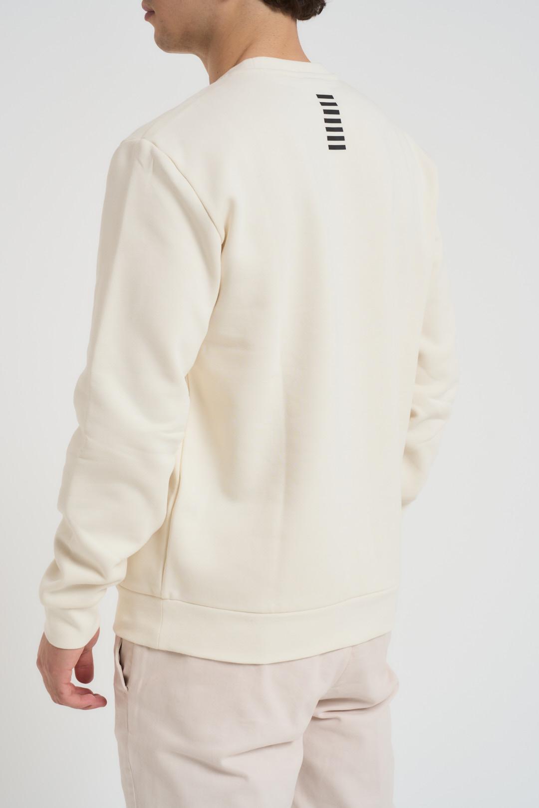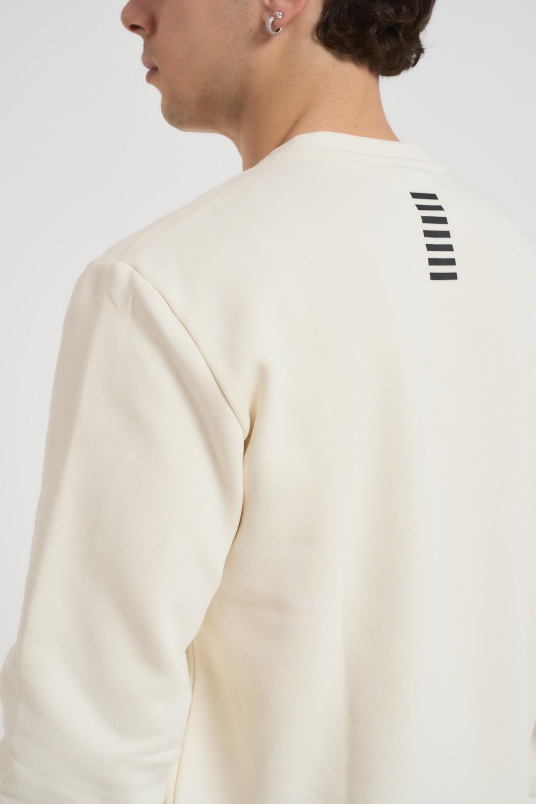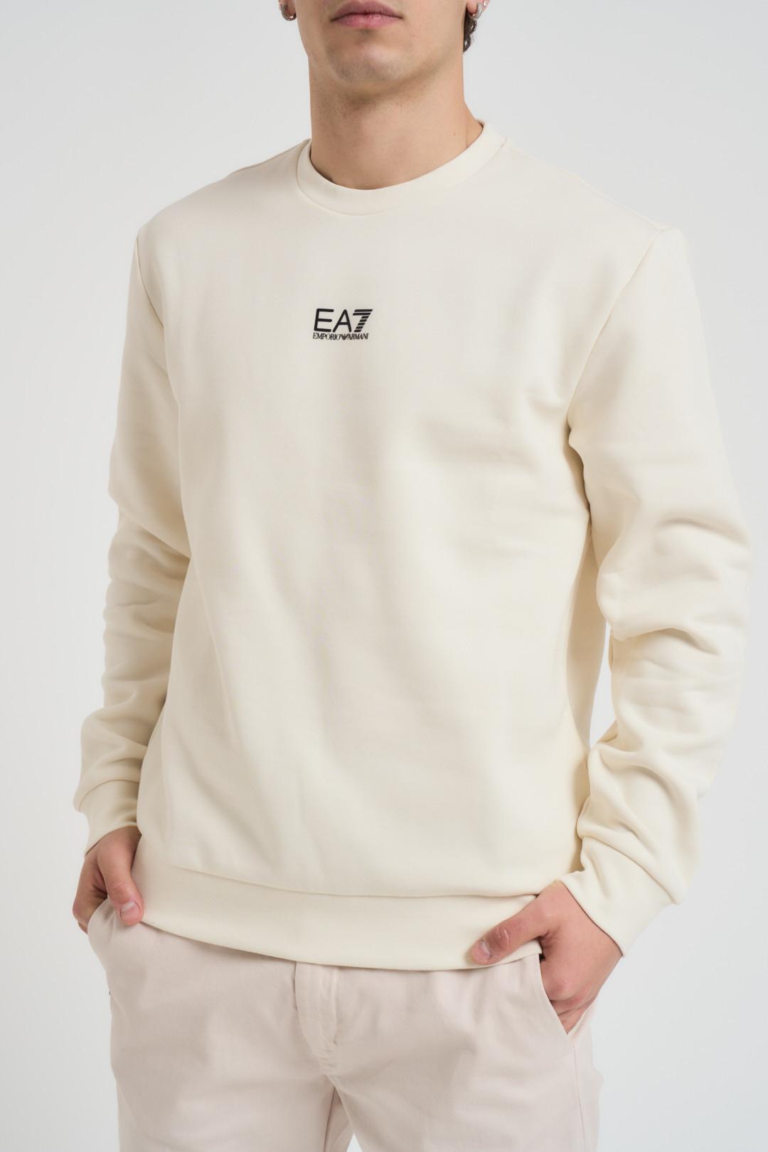 EA7 Felpa uomo girocollo burro. Modello regular fit. Manica lunga. Logo posto al centro a contrasto. Composizione: 85% cotone, 15% poliestere. Il modello è alto 190 cm e indossa la taglia L.