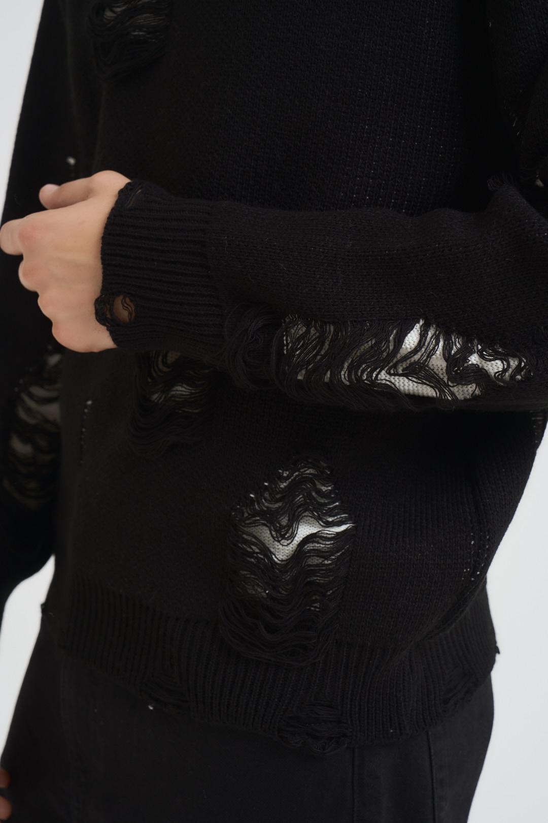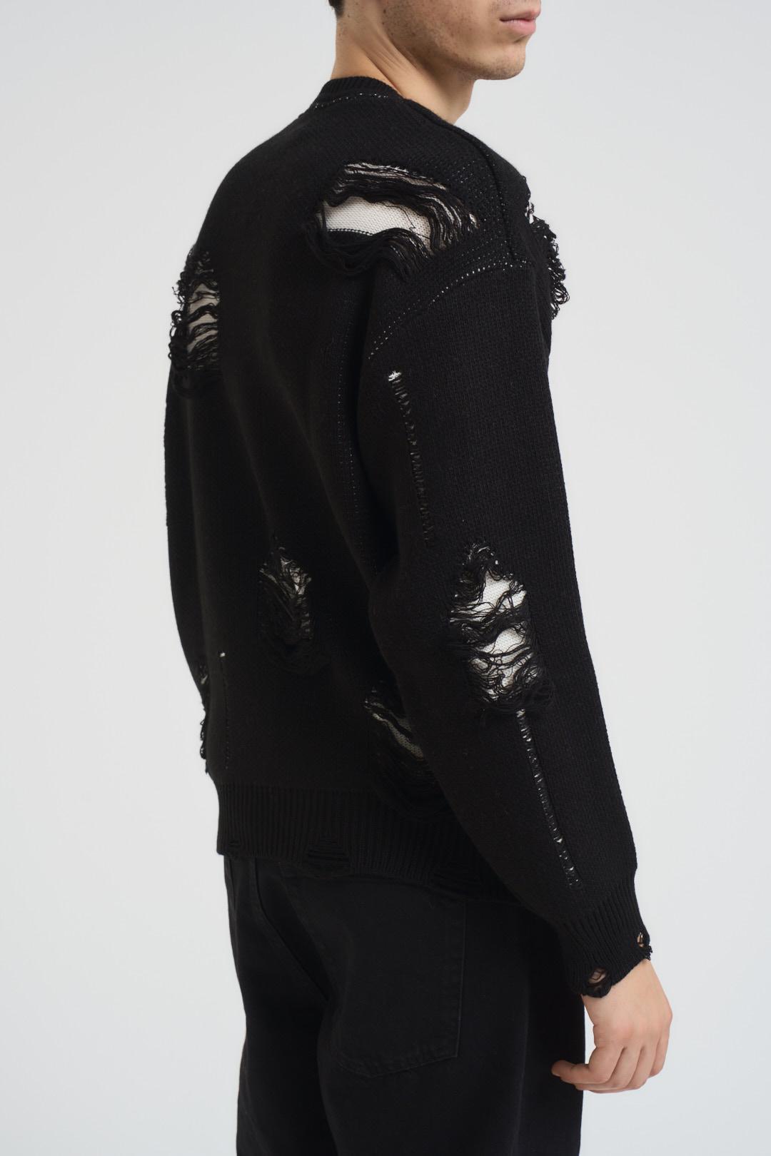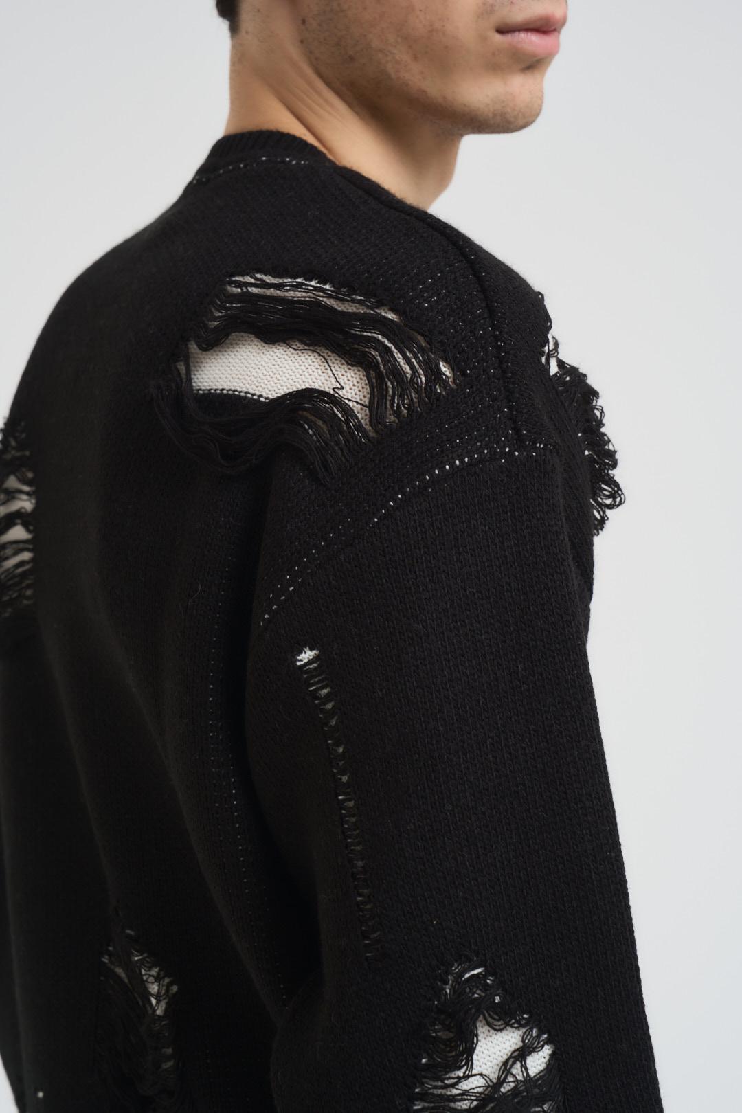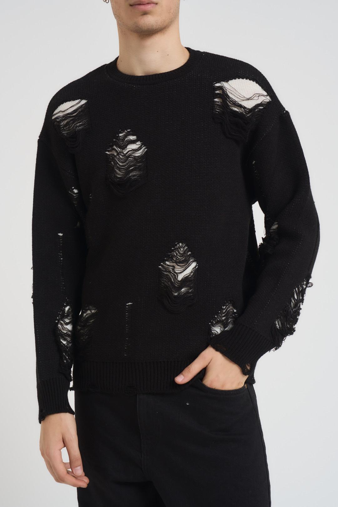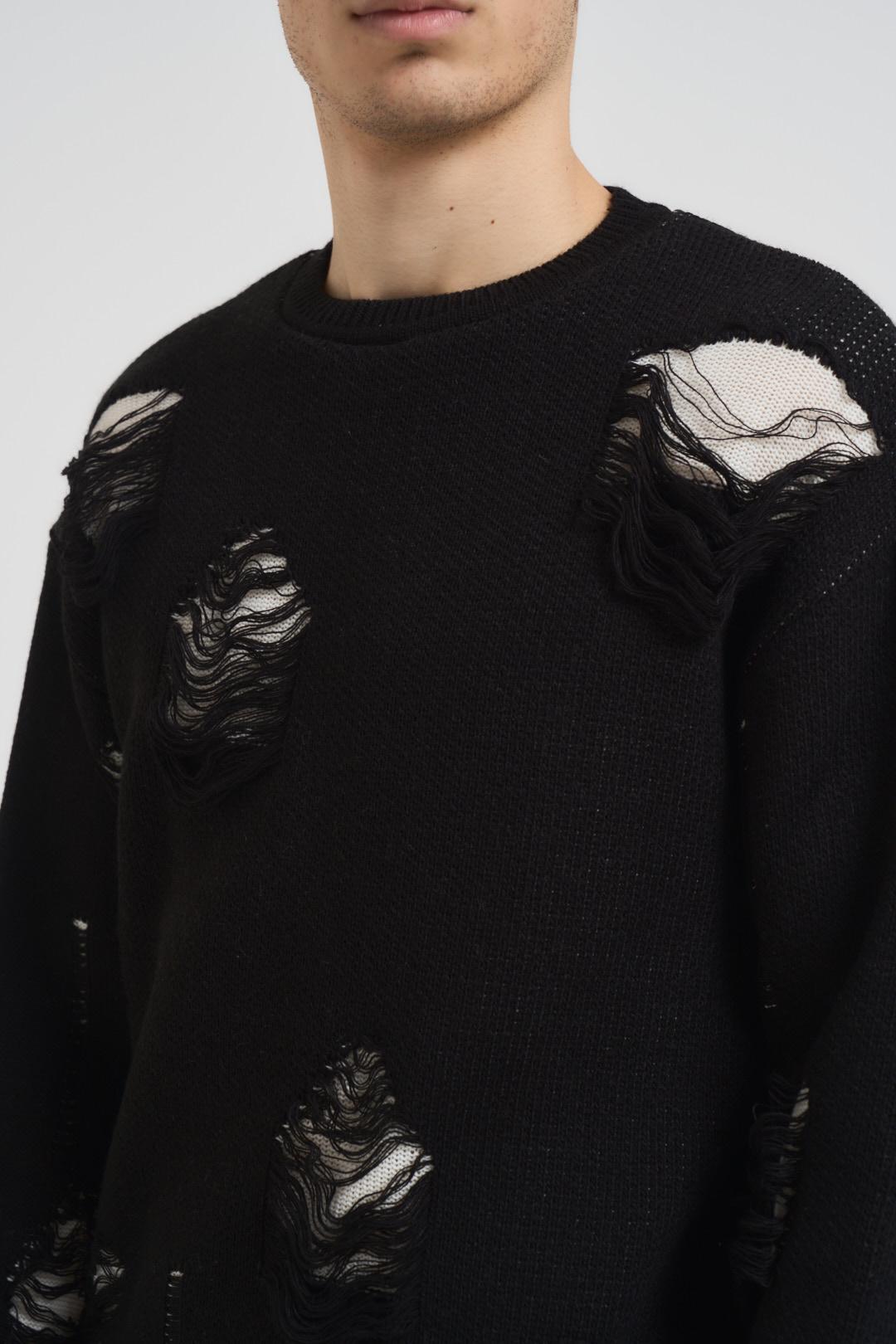 OVERD Felpa uomo girocollo con rotture nera. Modello a manica lunga, con dettagli a costine. Composizione: cotone e poliestere. Il modello è alto 190cm e indossa la taglia L.
