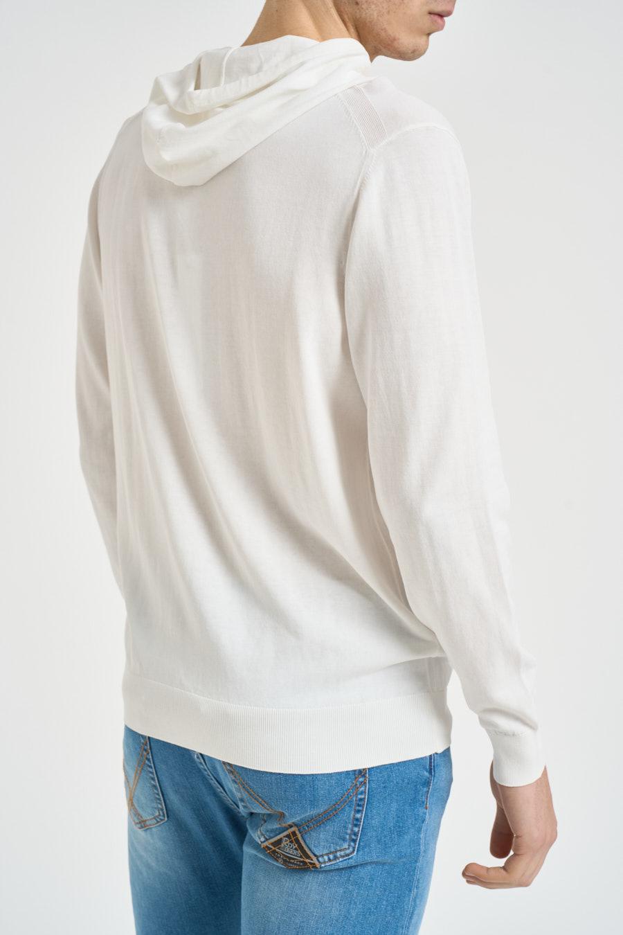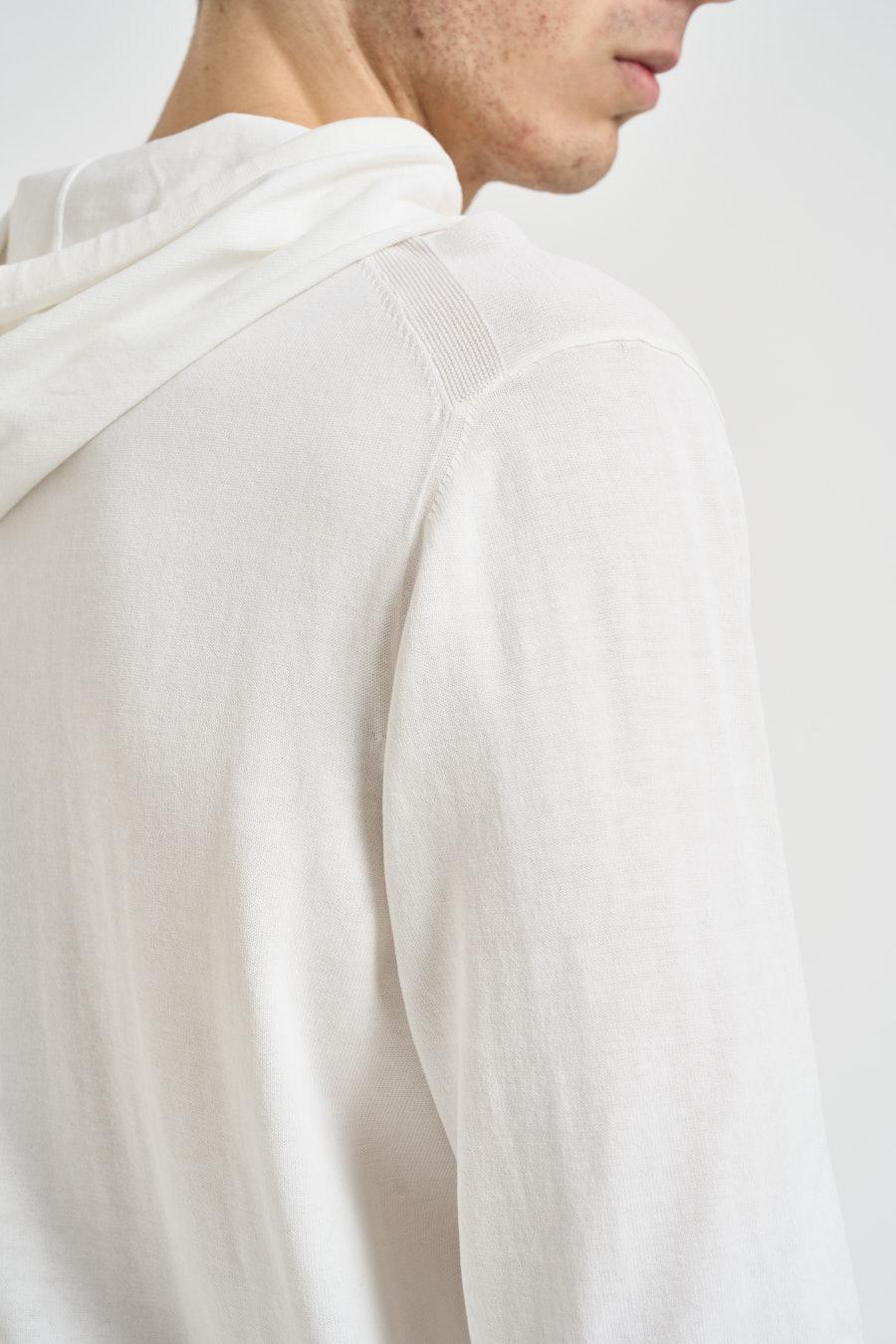 DIKTAT Felpa uomo in maglia bianca. Modello regular fit. Cappuccio. Coulisse. Chiusura frontale con cerniera. Manica lunga. Dettagli a costine. Composizione: 100% cotone. Il modello è alto 190 cm e indossa la taglia 50.