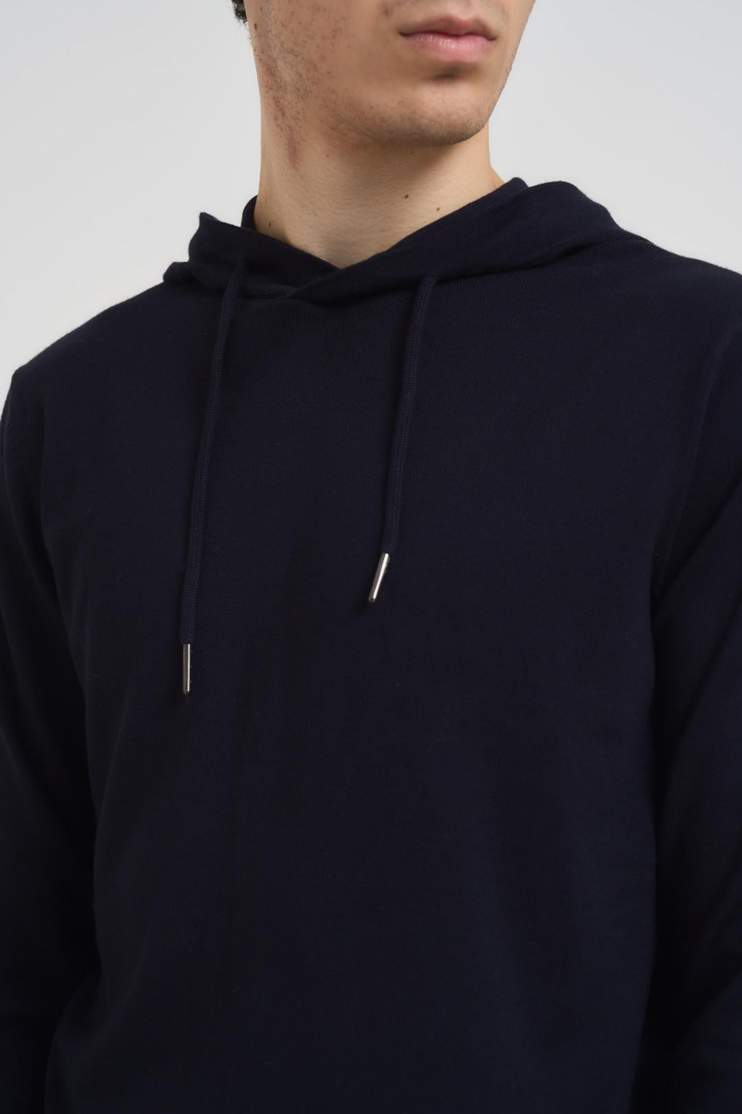 MARKUP Felpa uomo in maglia blu. Modello regular fit. Felpa con cappuccio e coulisse. Polsi e orlo con lavorazione a costine. Targhetta logo posta frontalmente a sinistra. Composizione: viscosa e poliestere. Il modello è alto 190 cm e indossa la taglia L.