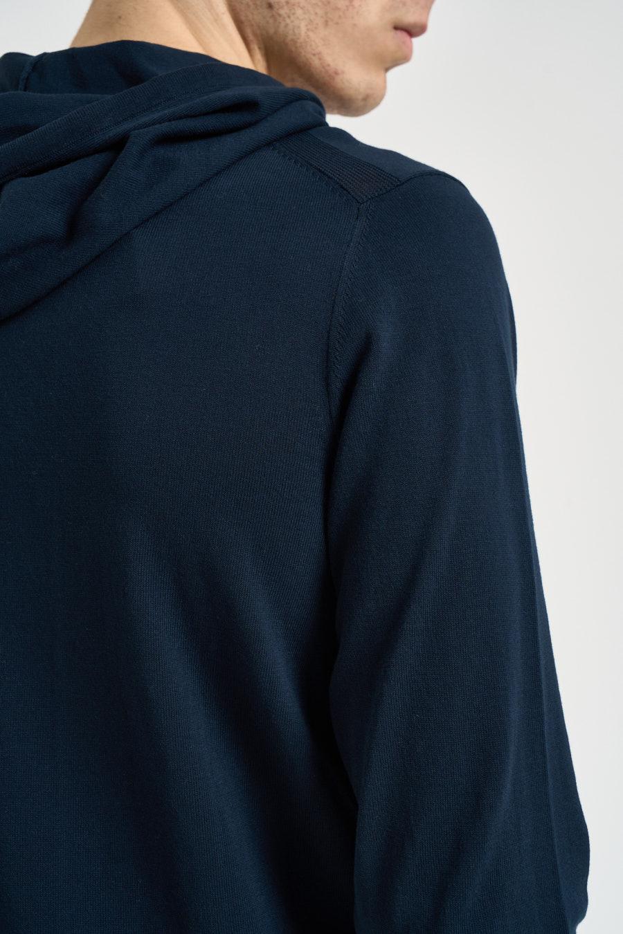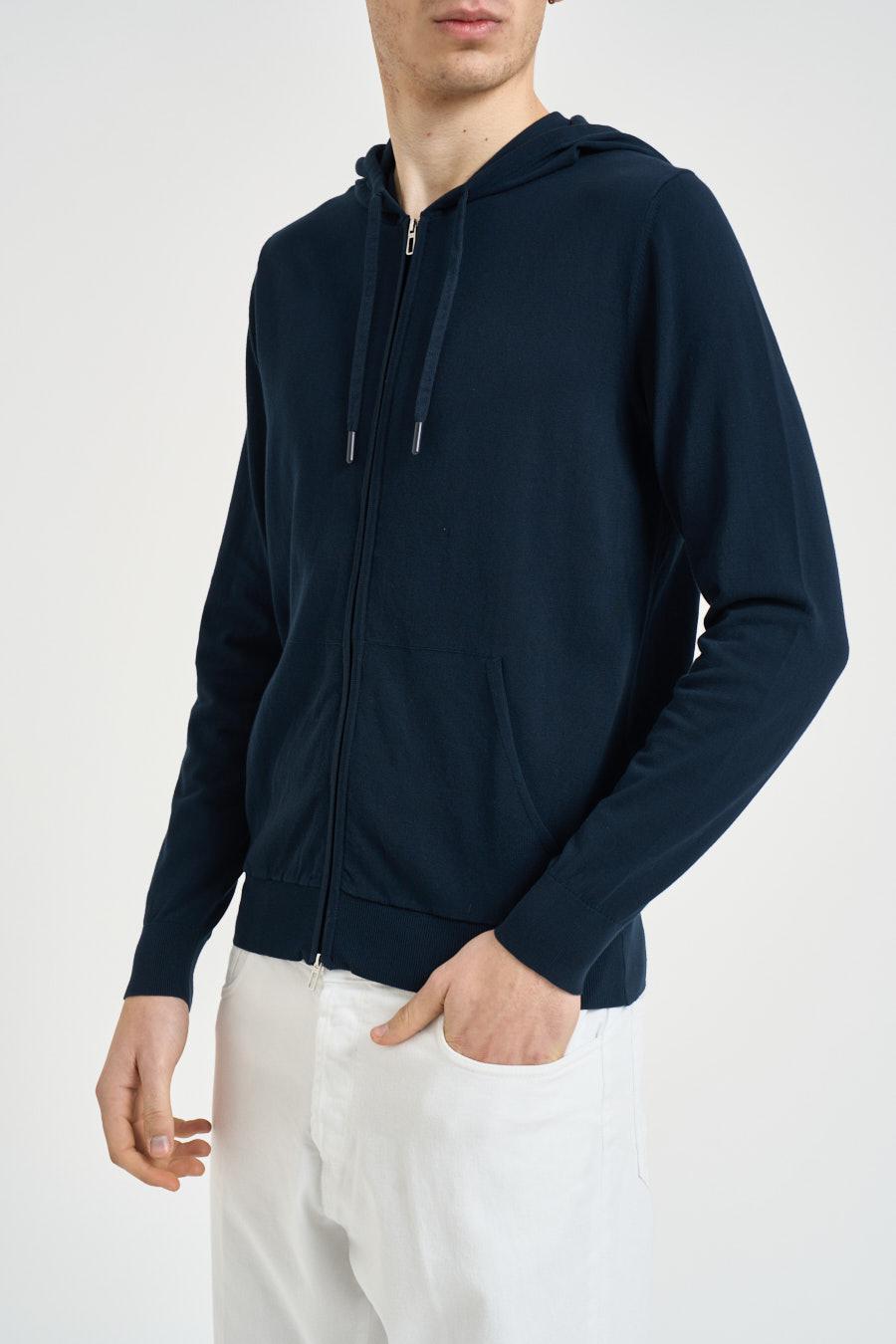 DIKTAT Felpa uomo in maglia blu notte. Modello regular fit. Cappuccio. Coulisse. Chiusura frontale con cerniera. Manica lunga. Dettagli a costine. Composizione: 100% cotone. Il modello è alto 190 cm e indossa la taglia 50.