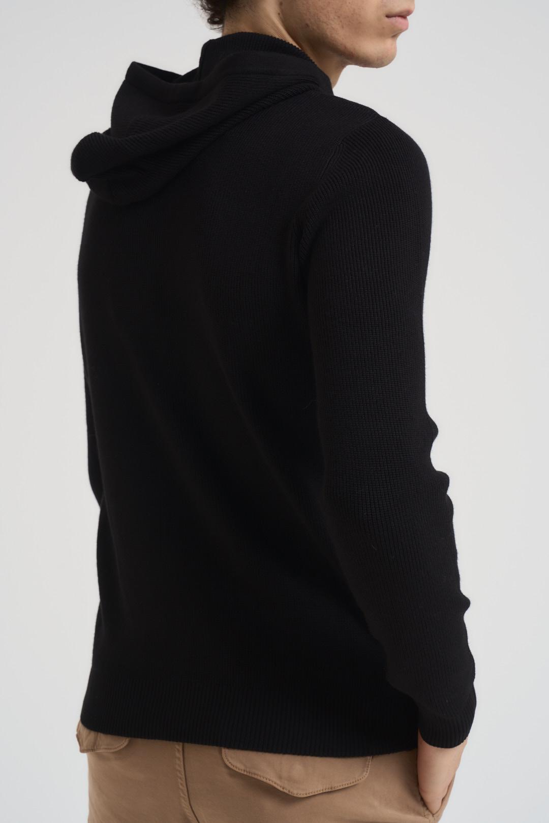 SSEINSE Felpa uomo in maglia con cappuccio nera. Modello regular fit a costine, con coulisse sul cappuccio regolabile, polsini e orli a costine. Composizione: 70% viscosa 30%nylon. Il modello è alto 190cm e indossa la taglia L.