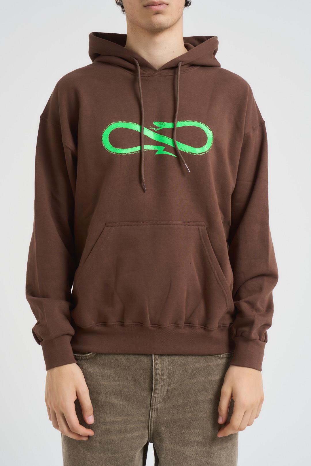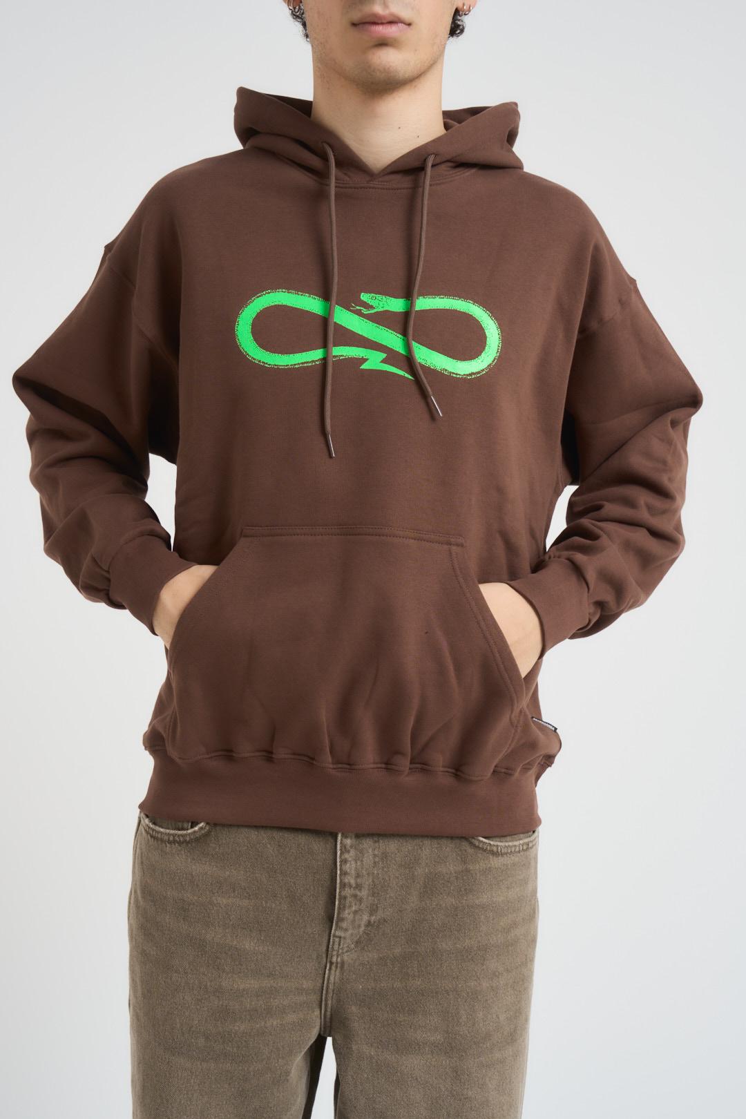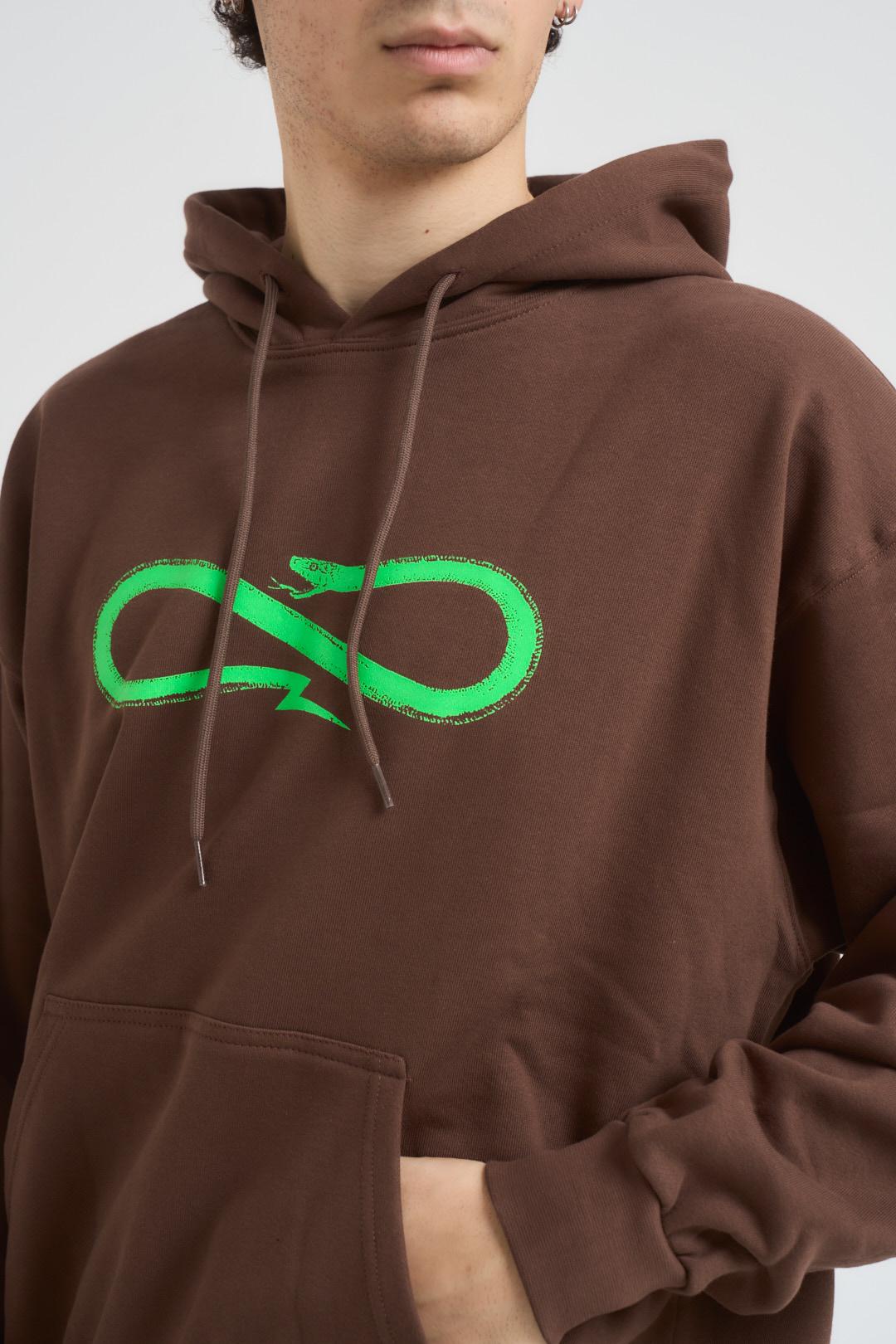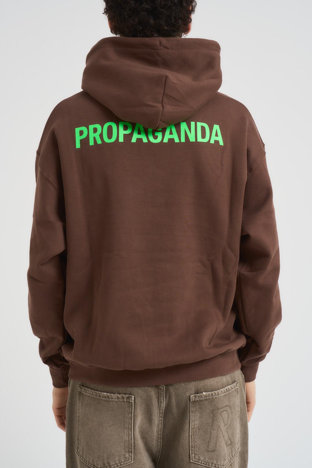 PROPAGANDA Felpa uomo Logo Classic marrone. Modello con il cappuccio. Stampa serigrafica su fronte e retro. Tasca a marsupio. Coulisse al collo. Costina ai polsi e in vita. Label personalizzata al fianco sinistro. Composizione: 100% Cotone. Il modello è alto 190 cm e indossa la taglia L.