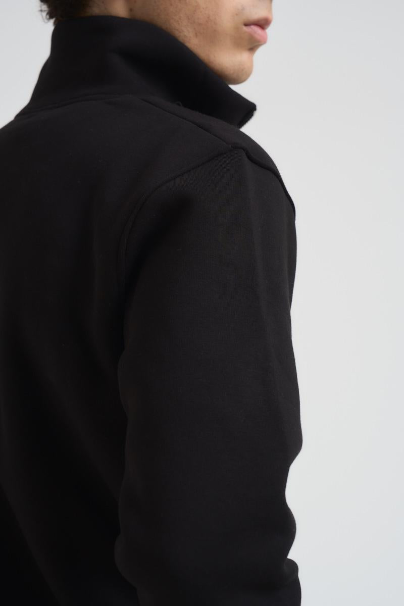 SUPERCULTURE Felpa uomo mezza zip nera. Modello con classico colletto, manica lunga con polsino a costine, brand superculture in bianco sulla manica. Composizione: 65% cotone 35% poliestere. Il modello è alto 190 cm e indossa la taglia L.