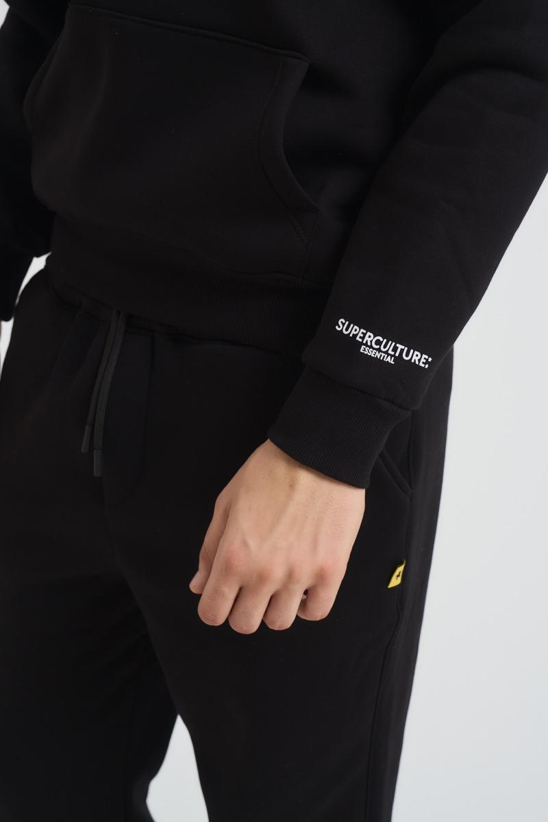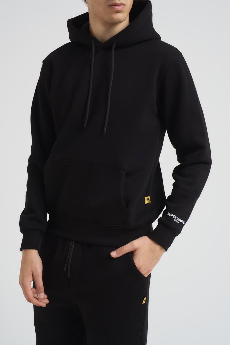 SUPERCULTURE Felpa uomo con cappuccio nera. Laccio regolabile sul cappuccio. Polsini e fondo a costine. Regular fit. Composizione: 65% Cotone 35% Poliestere. Il modello è alto 185cm e indossa la taglia L.