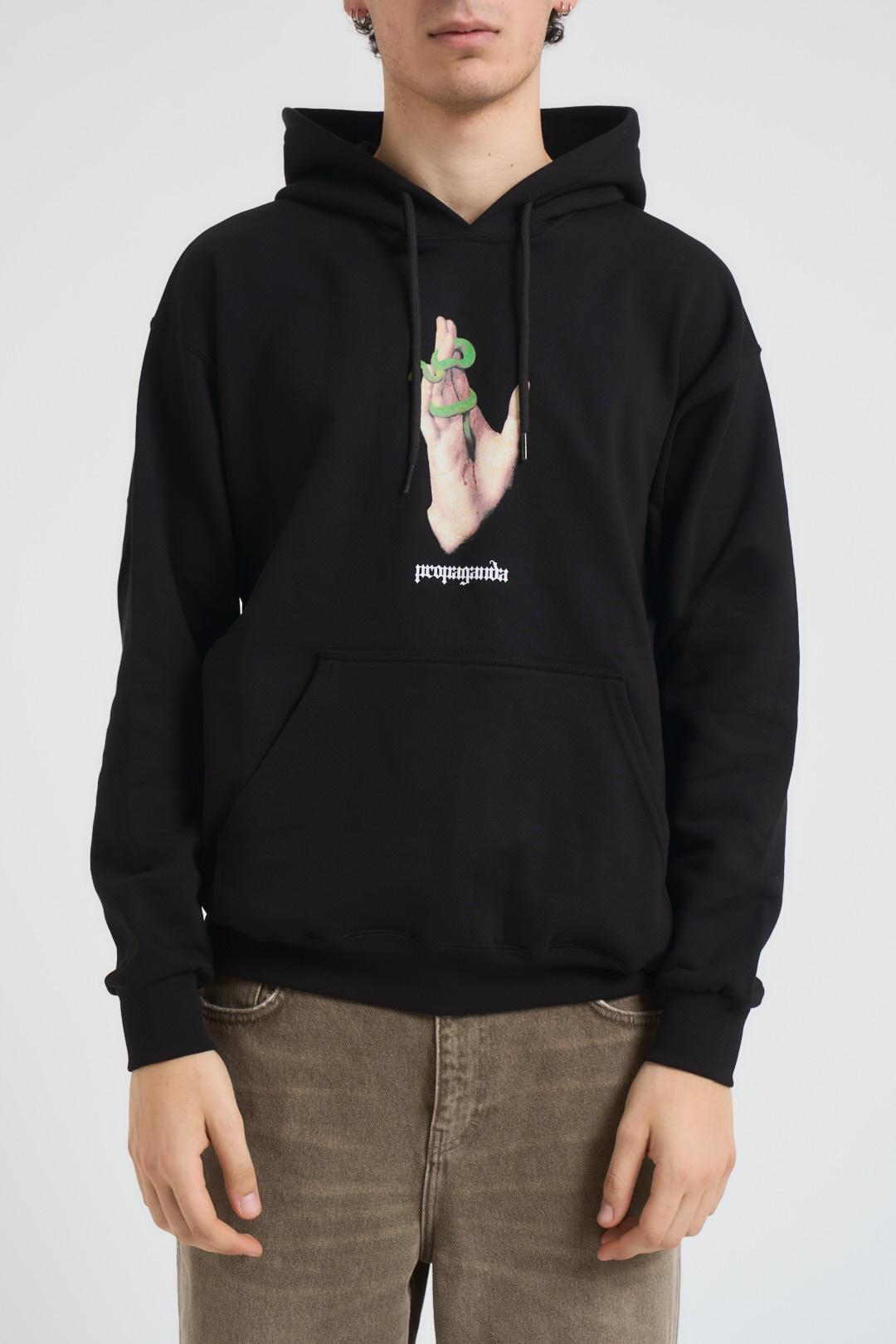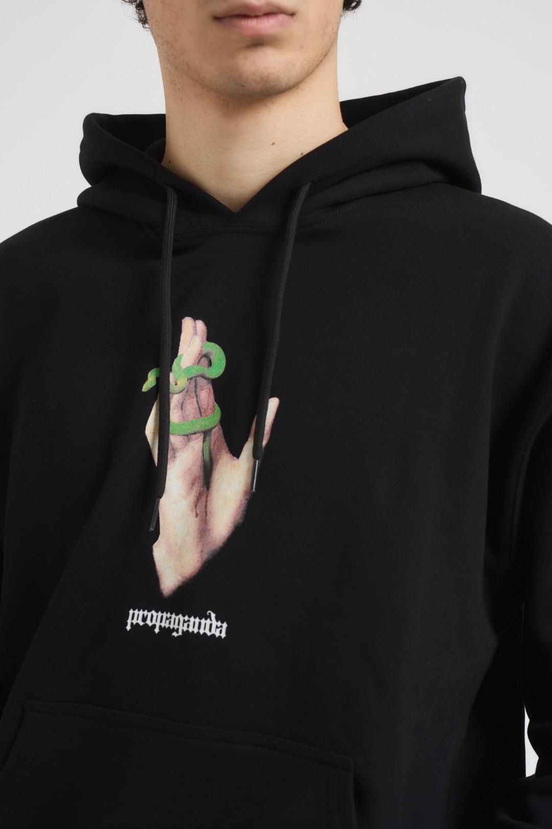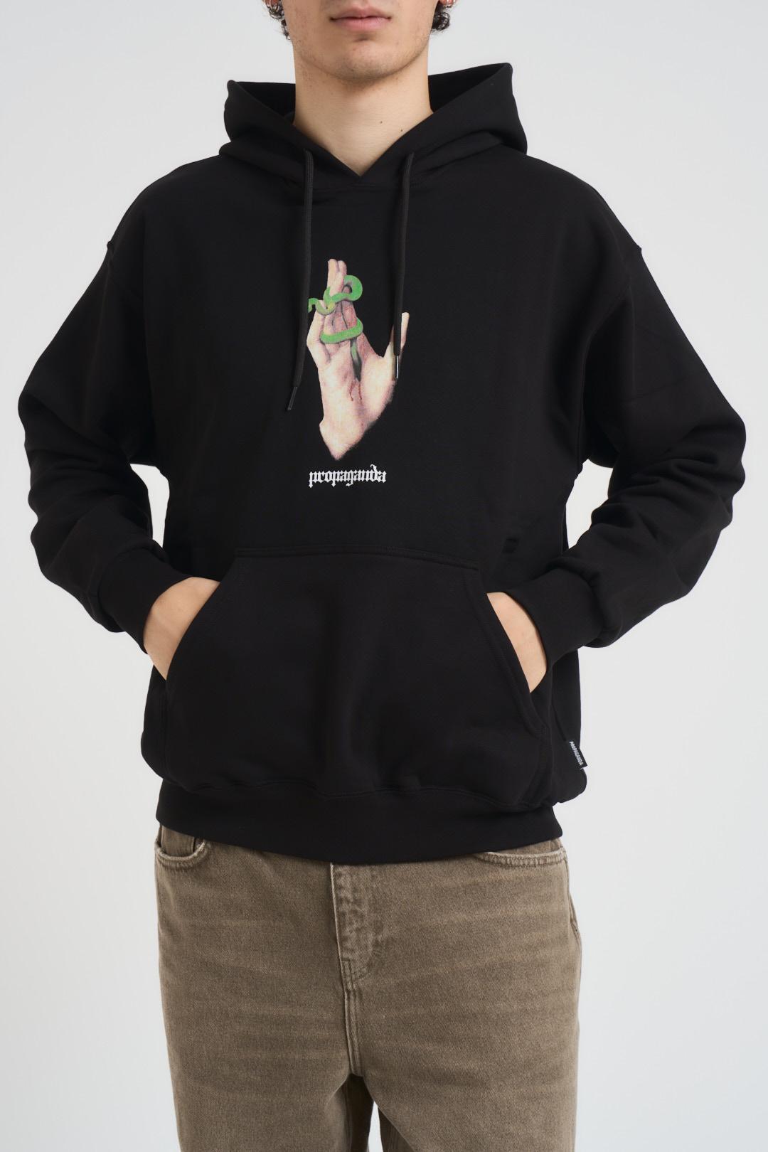 PROPAGANDA Felpa uomo Stigmata nera. Modello con cappuccio. Stampa serigrafica sul fronte. Tasca a marsupio. Coulisse al collo. Costina ai polsi e in vita. Label personalizzata al fianco sinistro. Composizione: 100% Cotone. Il modello è alto 190 cm e indossa la taglia L.