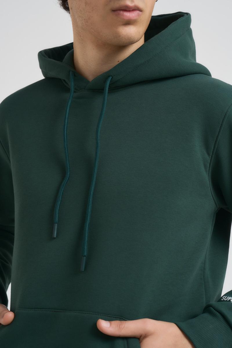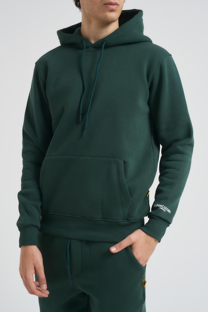 SUPERCULTURE Felpa uomo con cappuccio verde. Laccio regolabile sul cappuccio. Polsini e fondo a costine. Regular fit. Composizione: 65% Cotone 35% Poliestere. Il modello è alto 185cm e indossa la taglia L.