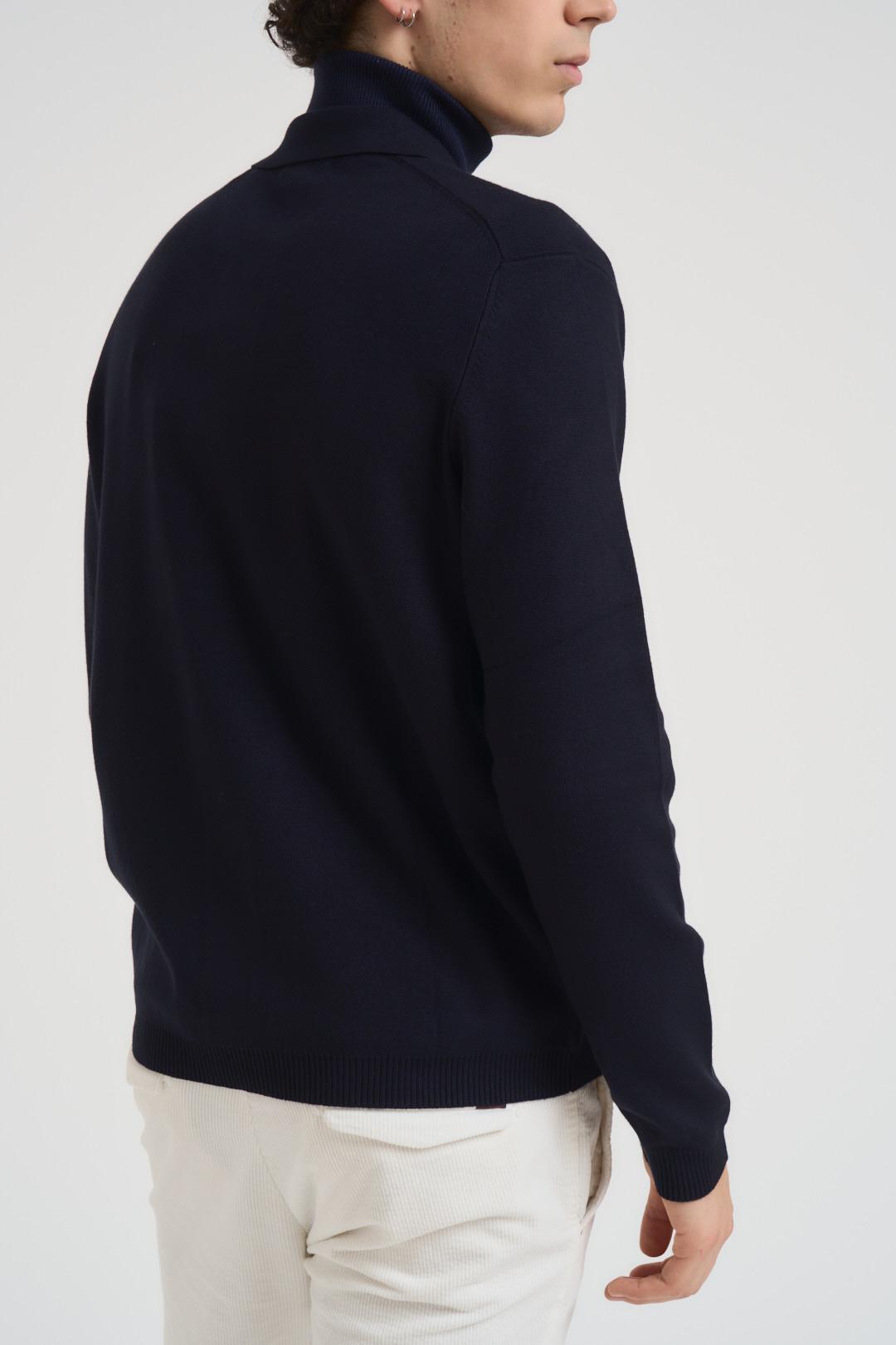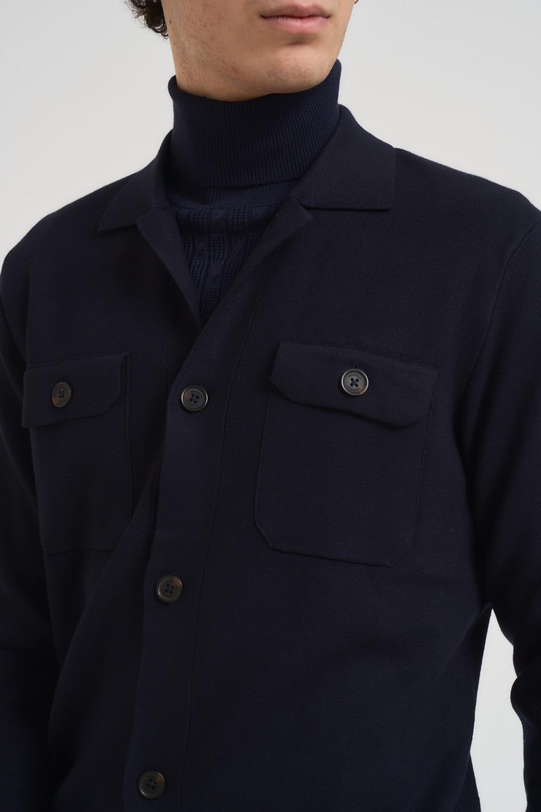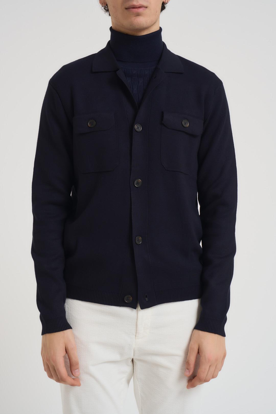MARKUP Cardigan in maglia uomo blu notte. Modello a maniche lunghe. Collo, polsi e fondo a costine. Chiusura con bottoni sul davanti. Due tasche frontali. Regular fit. Composizione: 80% Viscosa 20% Nylon. Il modello è alto 190 cm e indossa la taglia L.