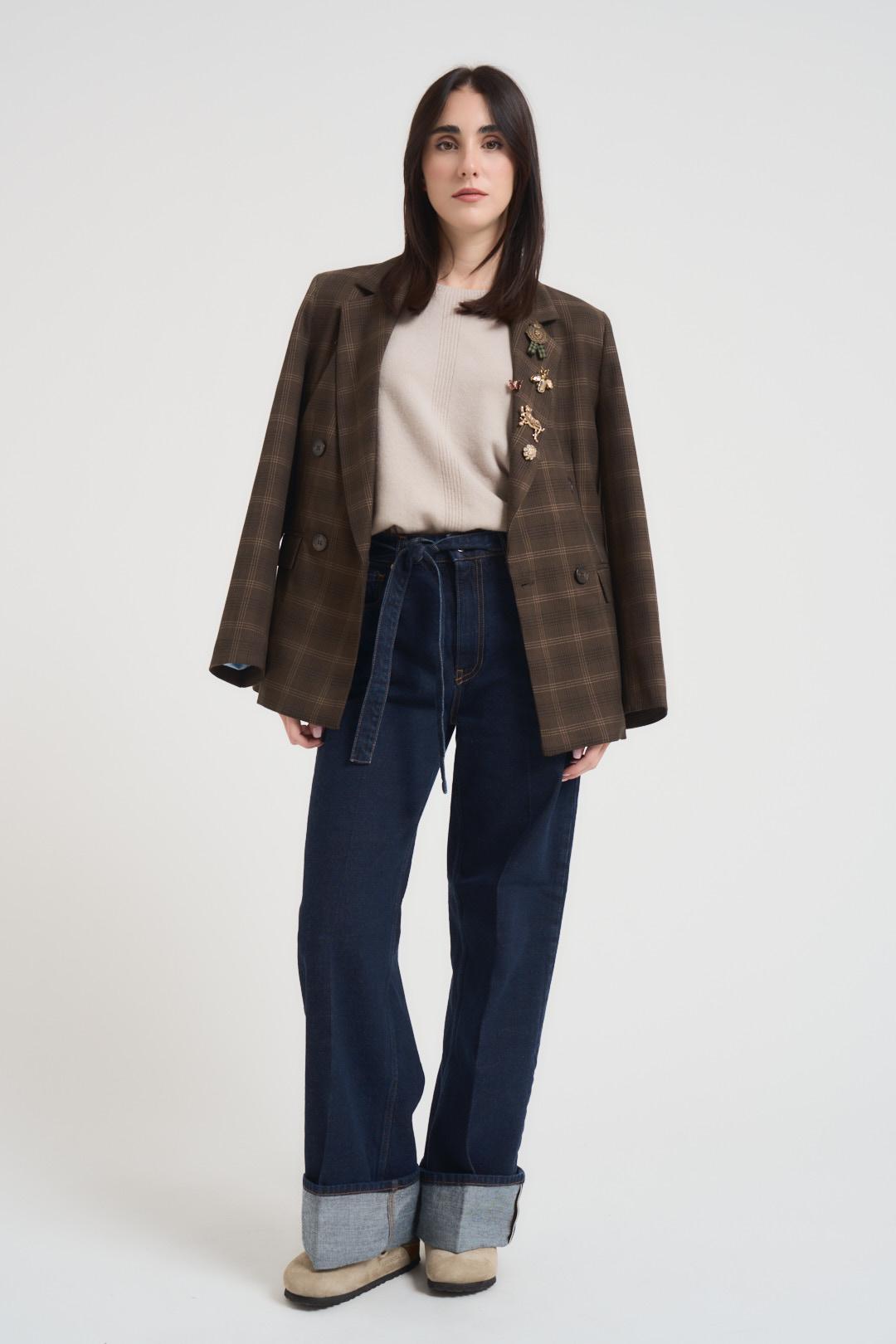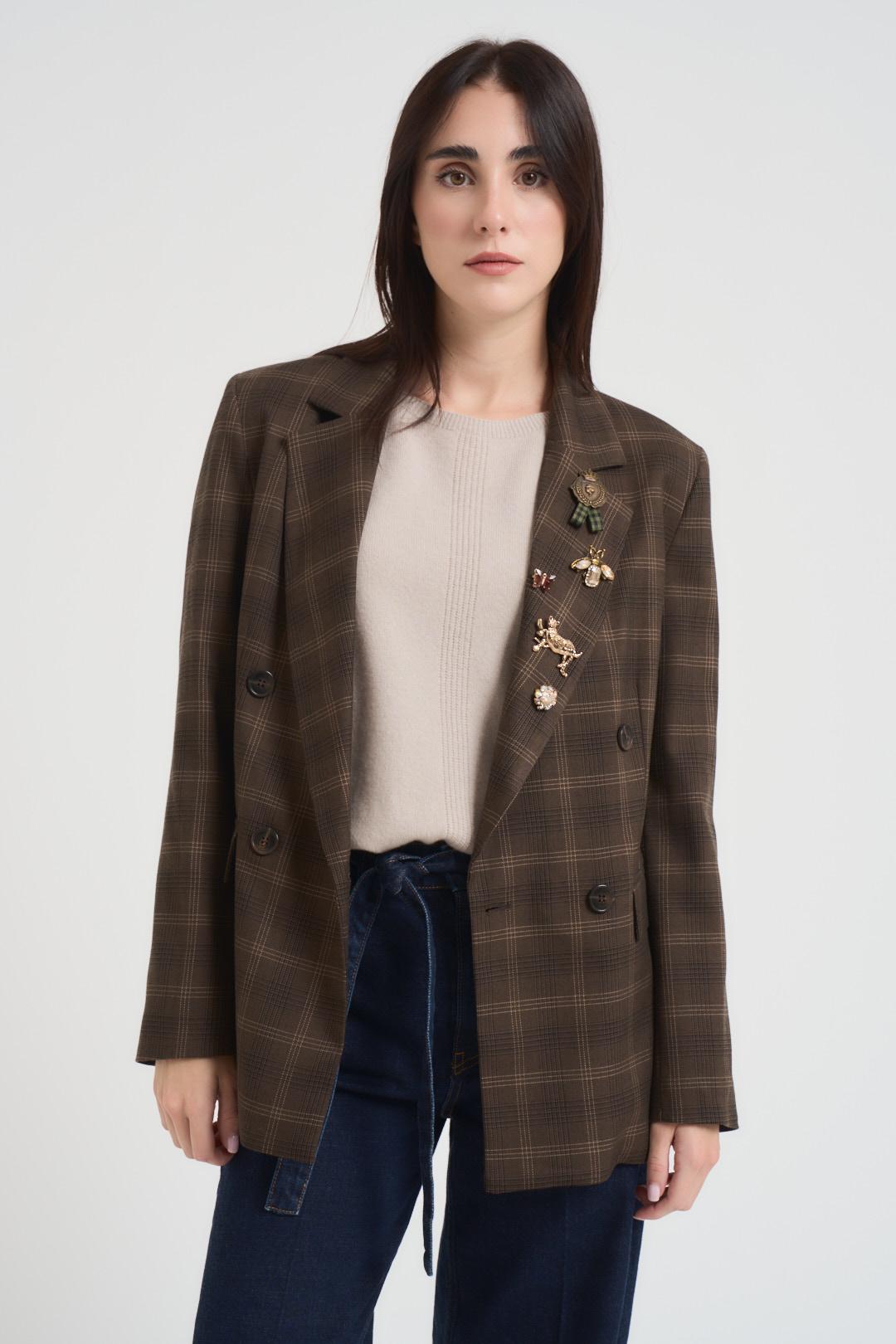 MOTEL Giacca check doppiopetto donna moro. Modello con spille removibili. Foderata. Composizione: 79% Poliestere 19% Viscosa 2% Elastan. La modella è alta 175 cm e indossa la taglia S.