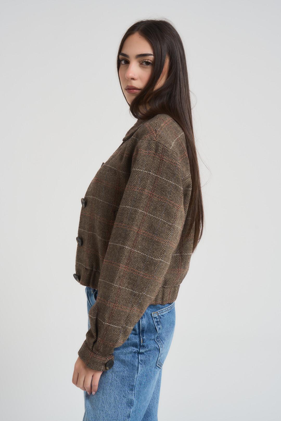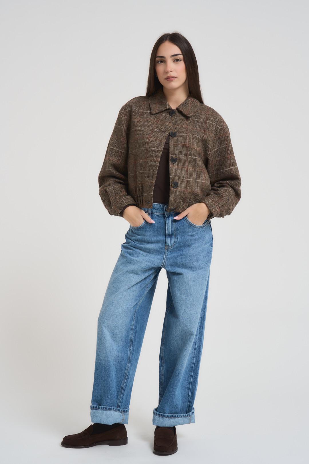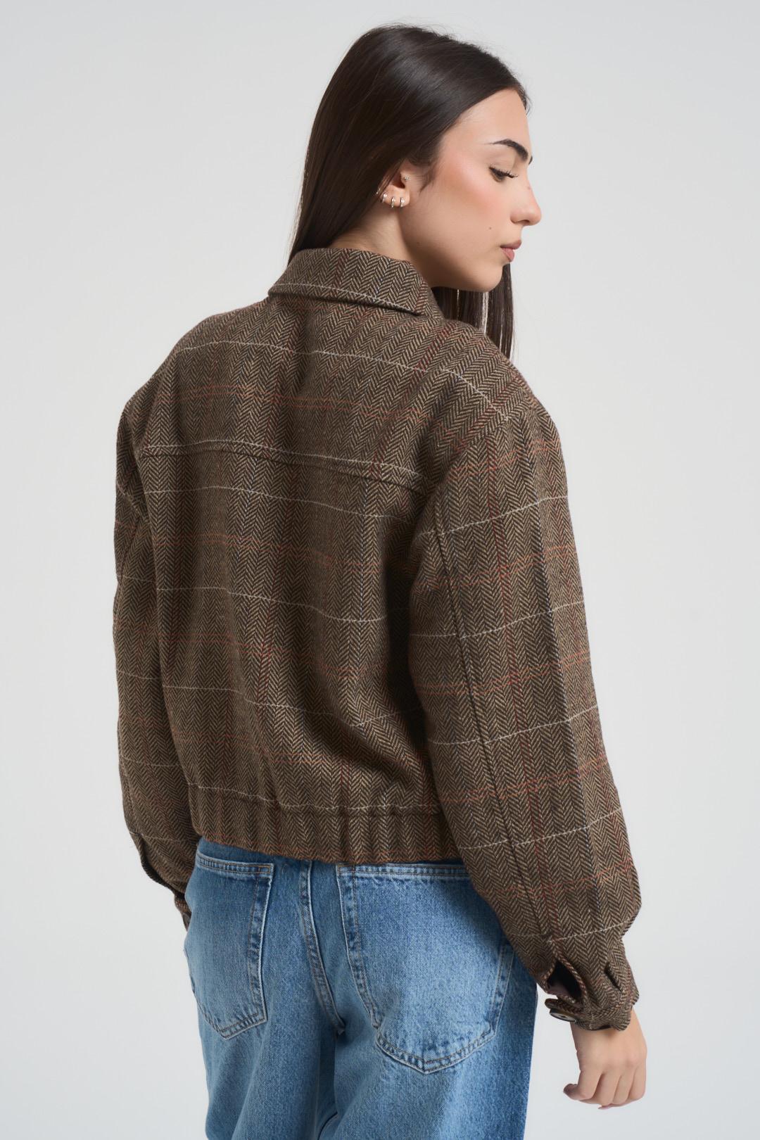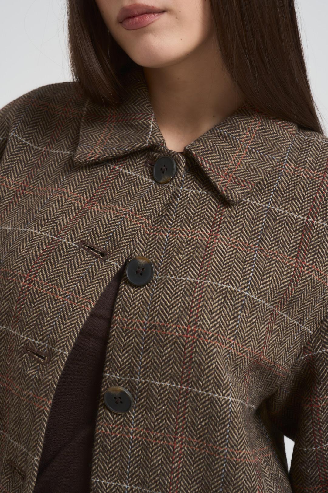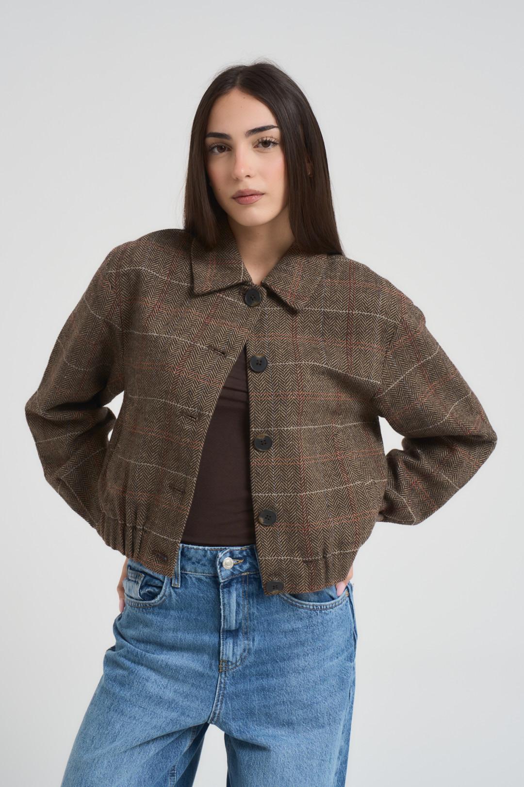 ONLY Giacca donna a scacchi marrone. Modello dalla vestibilità regolare. Colletto classico, chiusura frontale con bottoni. Tasche laterali a filetto. Composizione: 90% Poliestere, 10% Lana. La modella è alta 172 cm e indossa la taglia S.
