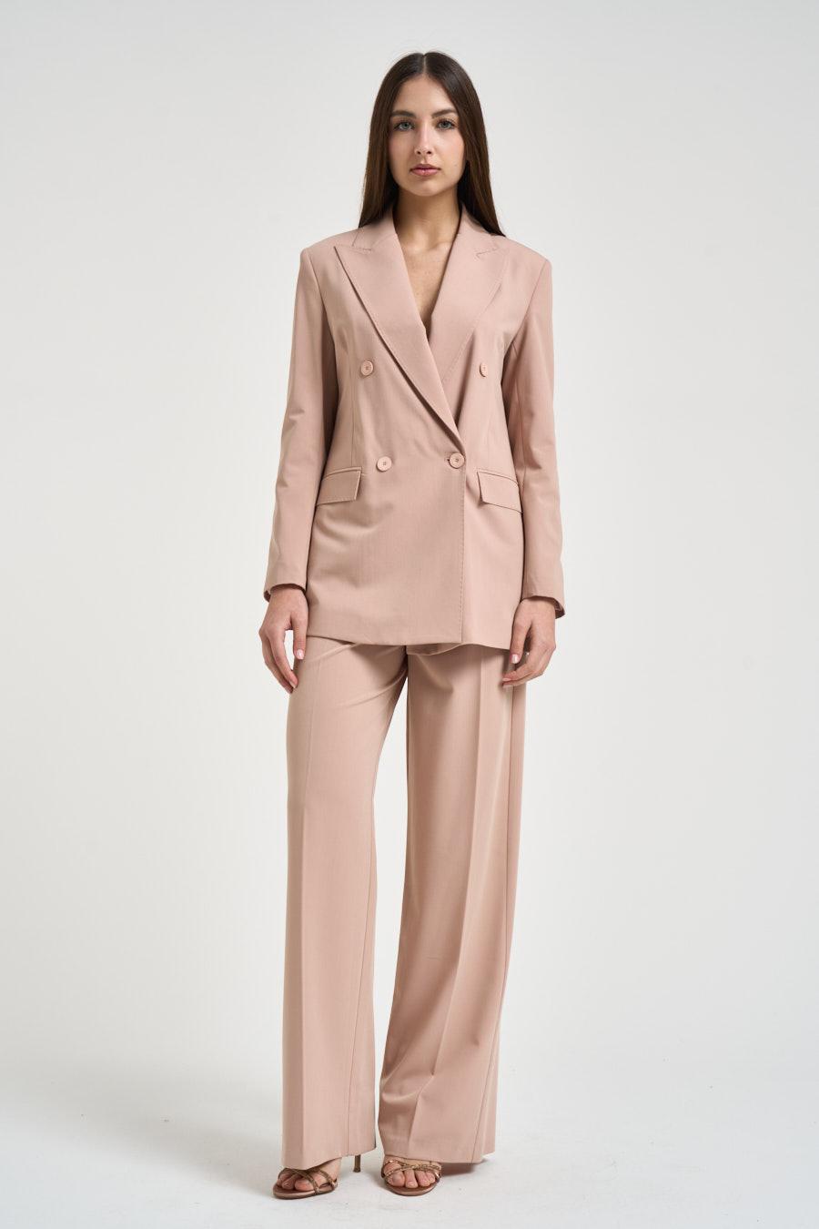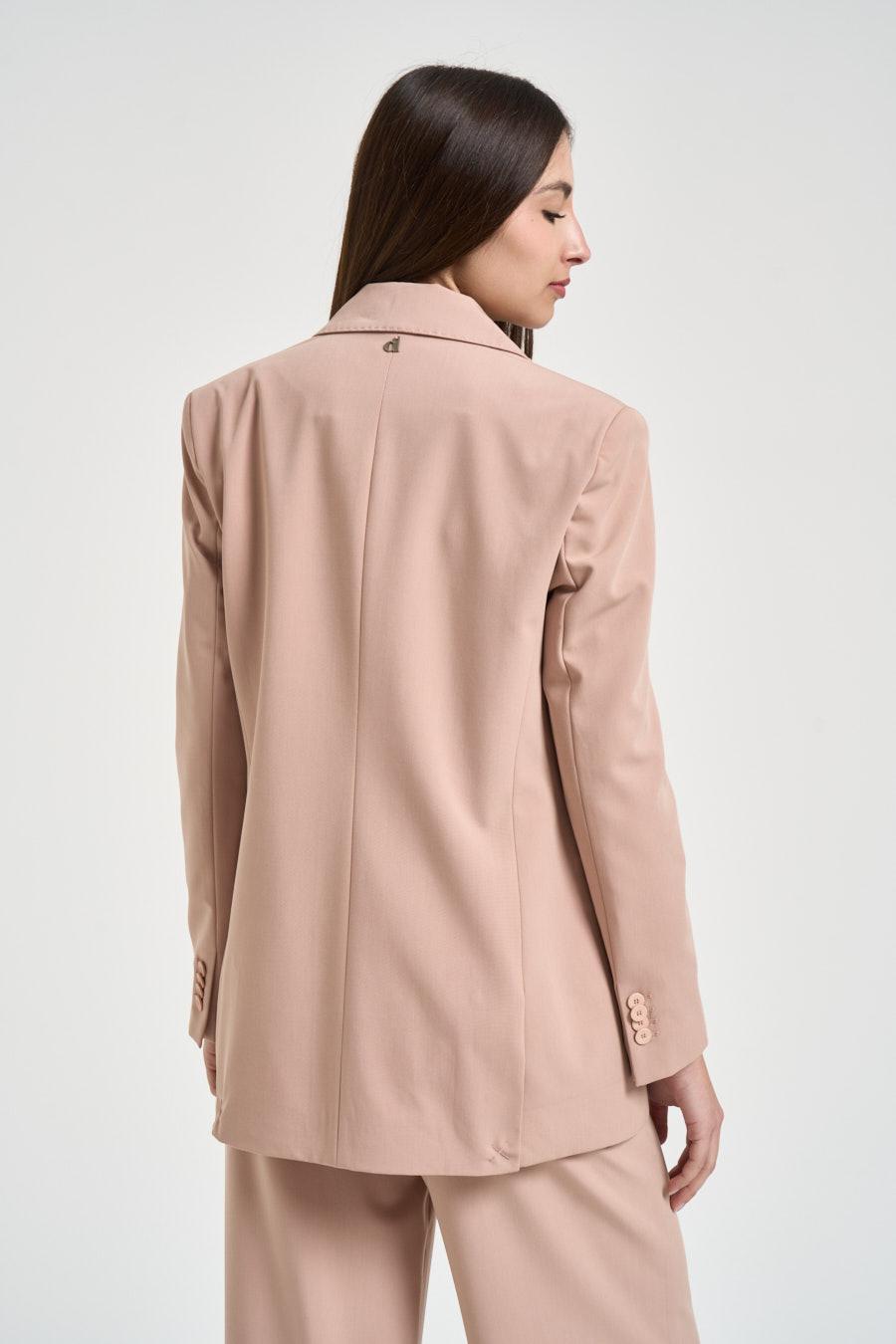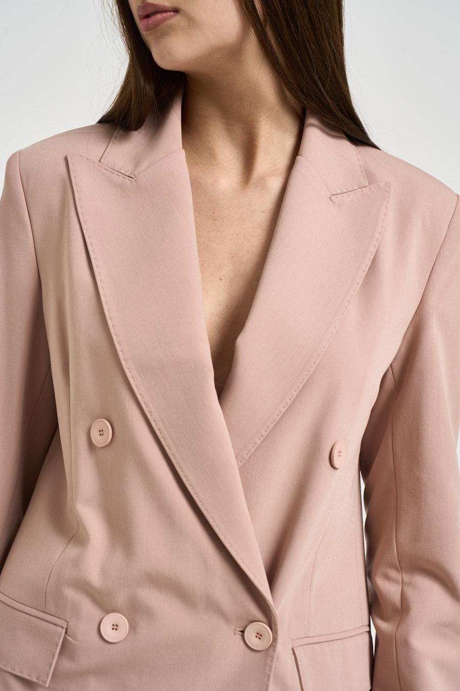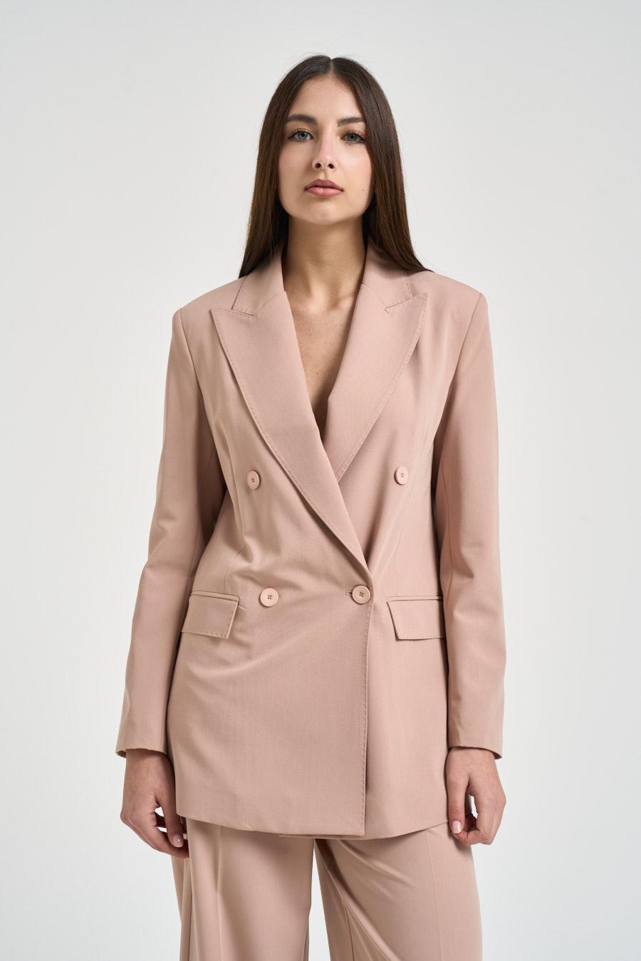 DIXIE Giacca donna doppiopetto rosa. Modello con revers classici con cuciture a contrasto, chiusura con bottoni, rifinito con tasche a patta e spalline imbottite. Composizione: 70% poliestere 26% viscosa 4% elastan. La modella è alta 176cm e indossa la taglia S.