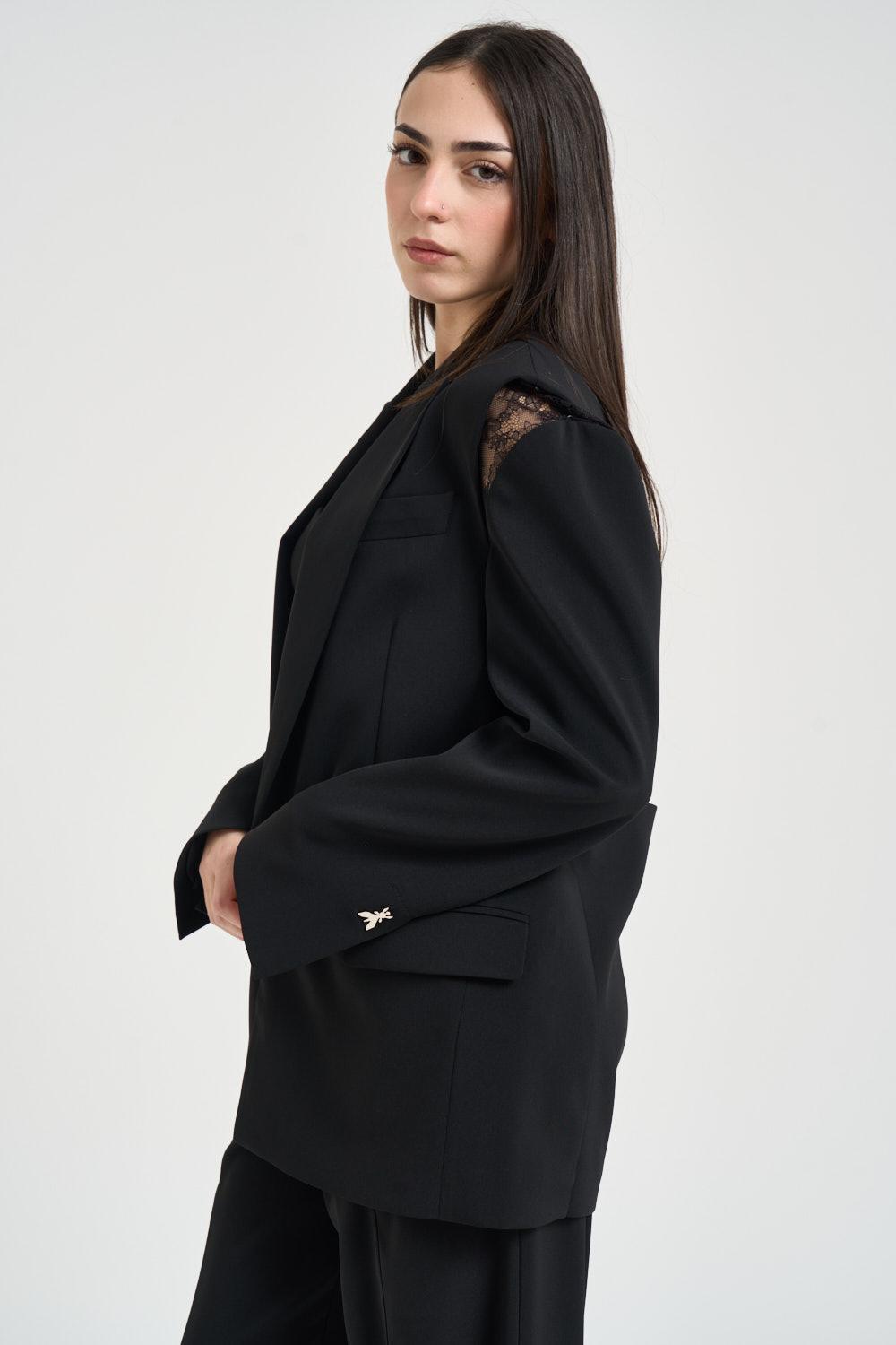 PATRIZIA PEPE Giacca donna monopetto con pizzo nera. Modello monopetto dalla linea elegante e femminile, con revers classici e spalle strutturate. Design raffinato arricchito da inserti in pizzo tono su tono sulle spalle e sulla schiena, che donano trasparenze sofisticate. Chiusura frontale con bottone singolo, tasche a pattina sul davanti e taglio sartoriale che valorizza la silhouette. Dettaglio iconico del logo Fly in metallo applicato sul polsino. Composizione: 97% poliestere, 3% elastan. La modella è alta 172cm e indossa la taglia 40.