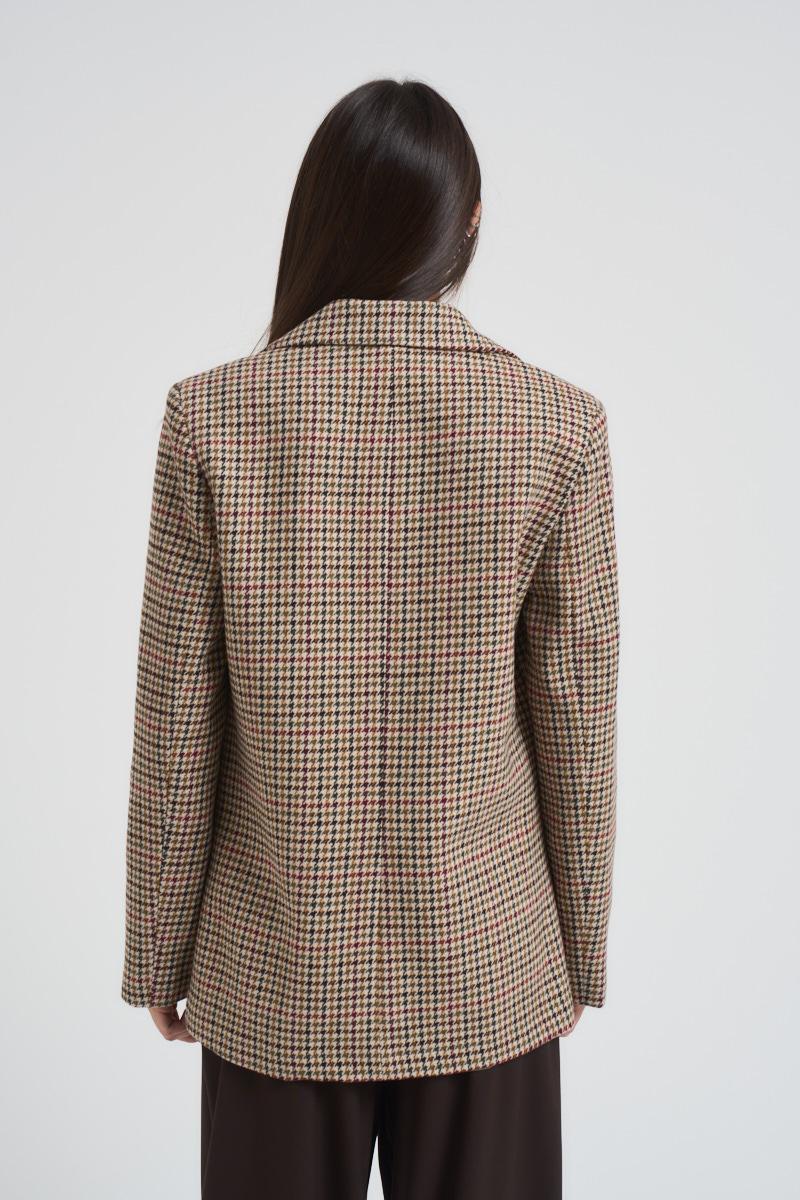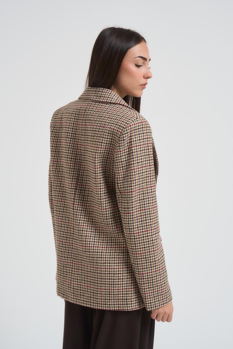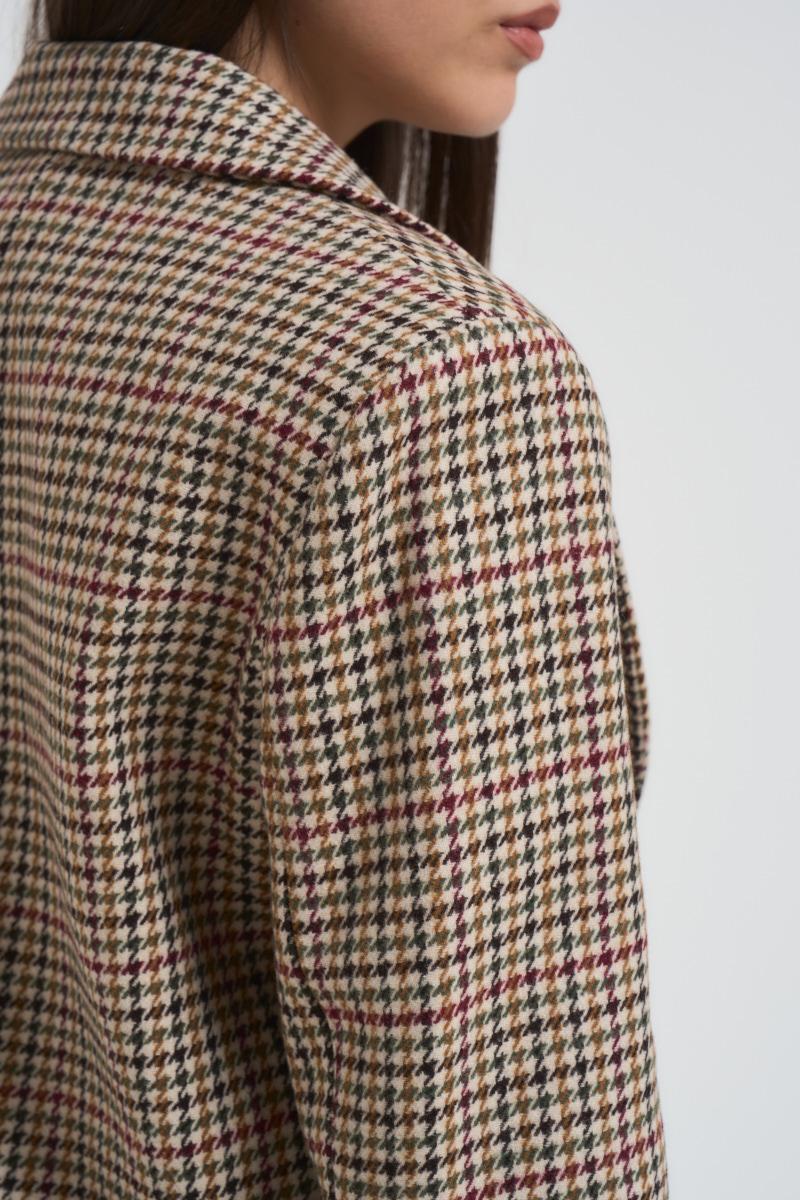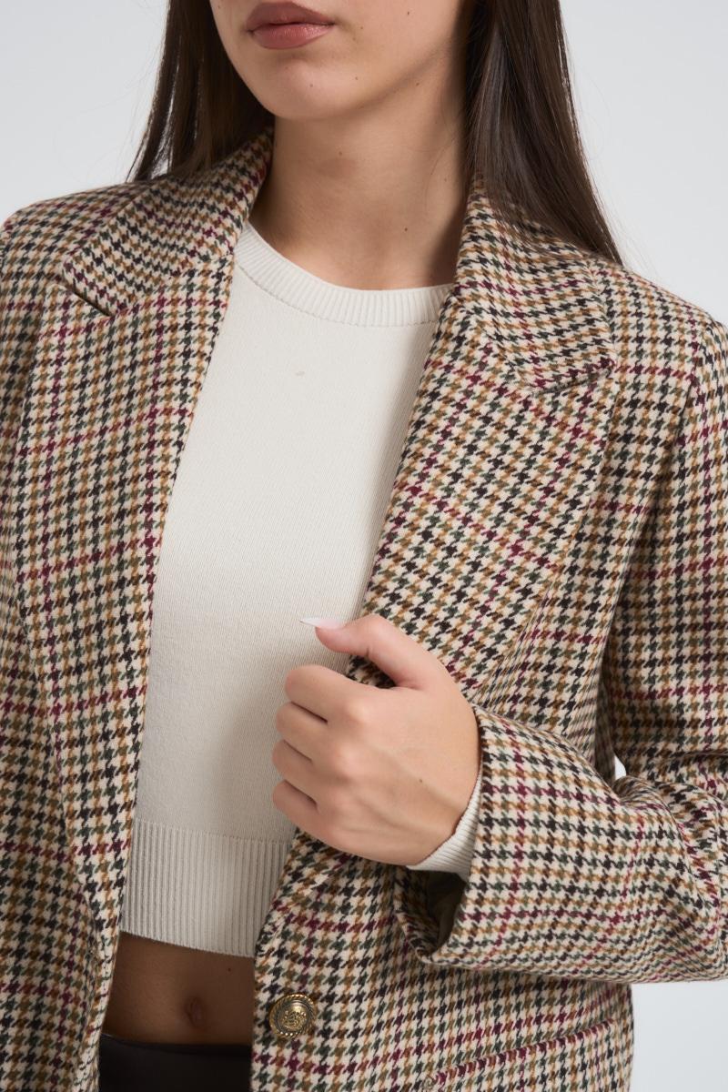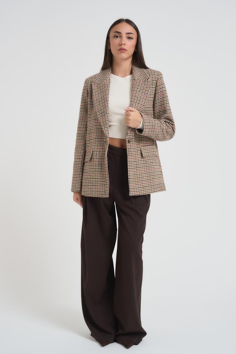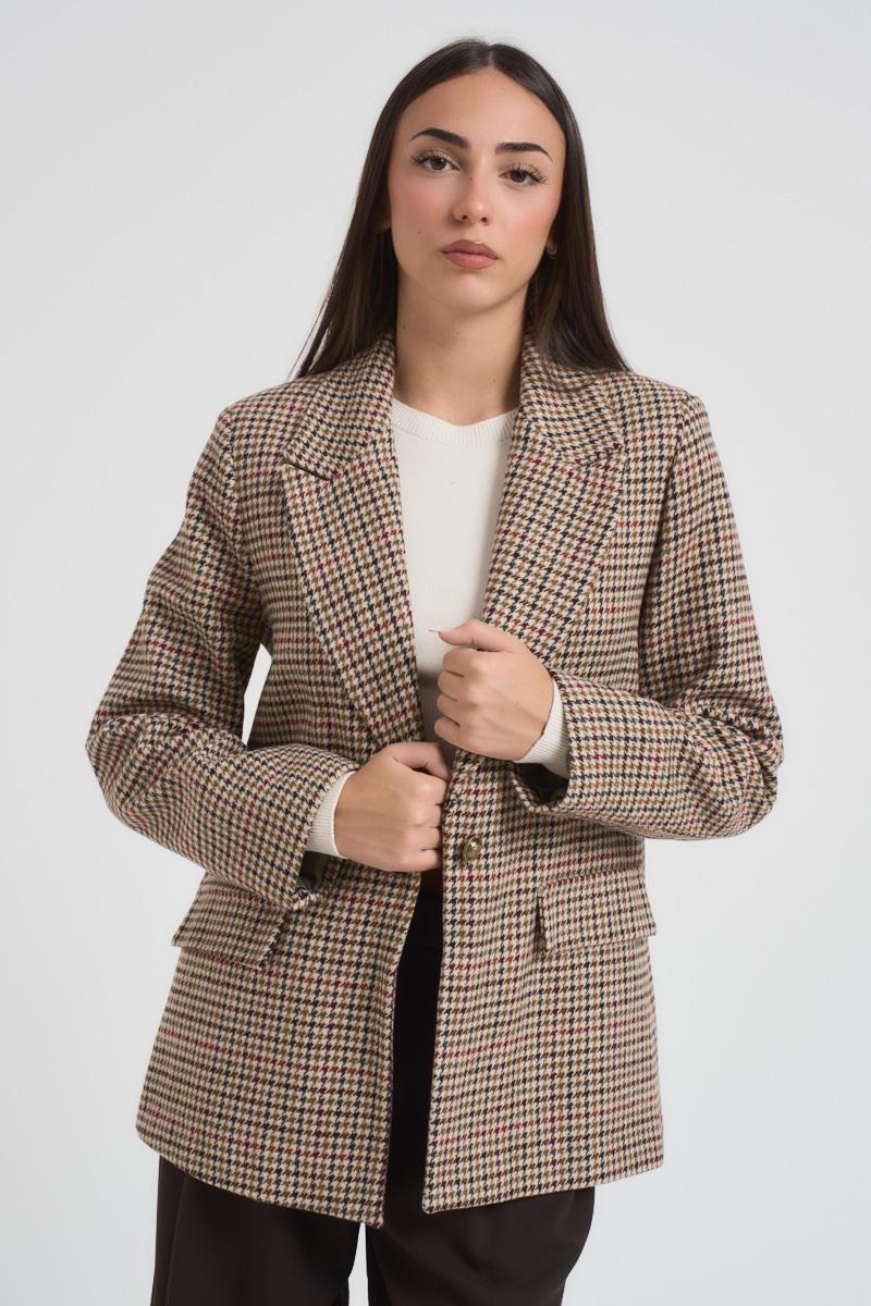 LOKITA MILANO Giacca donna monopetto pied de poule beige. Modello con chiusura a bottoni e cintura in ecopelle marrone. Modello con classico collo a rever. Composizione: 56% acetato 25% poliestere 9% altre fibre 8% cotone. Fodera: 100% poliestere. La modella è alta 176cm e indossa la taglia S.