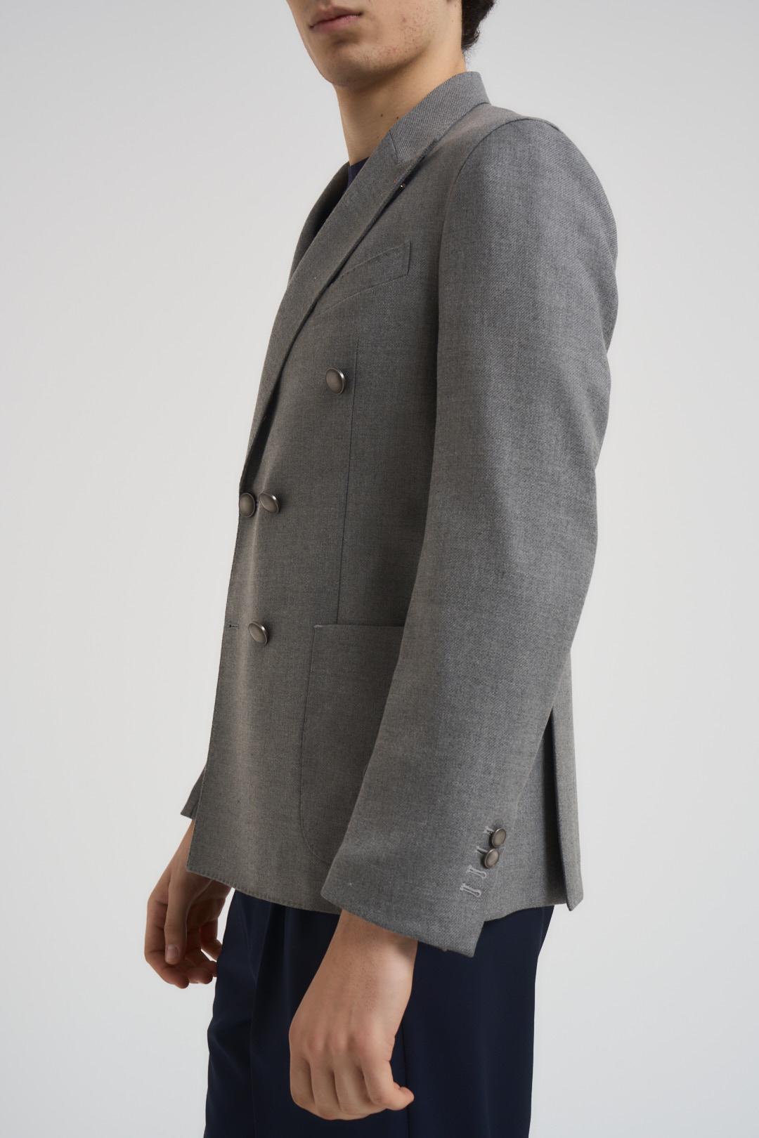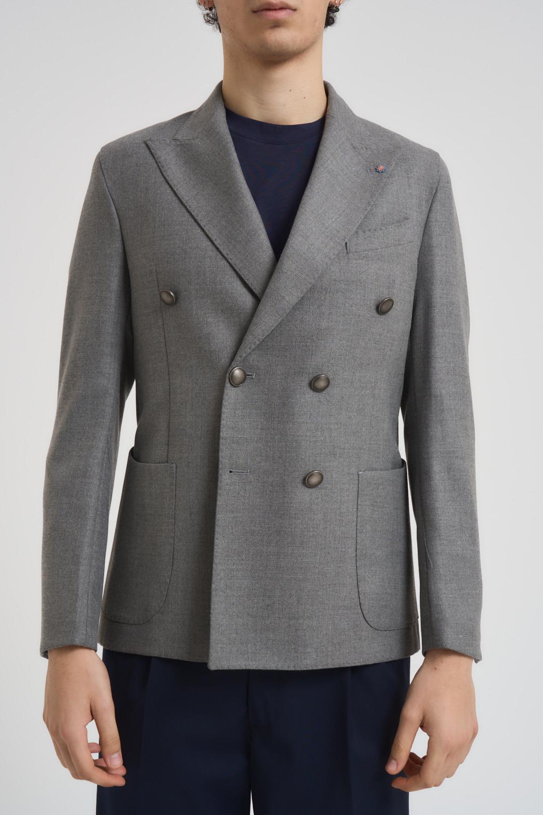 BHARNABA Giacca uomo doppiopetto grigio. Modello sfoderato con bottoni scuri a contrasto, rever a lancia, due tasche a toppa e un taschino frontale, e due spacchi sul retro. Bottoni ai polsi e finiture con impunture. Composizione: 62% lana, 18% poliammide, 10% seta, 8% poliestere, 2% elastan. Il modello è alto 190cm e indossa la taglia 50.
