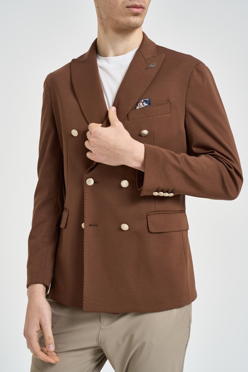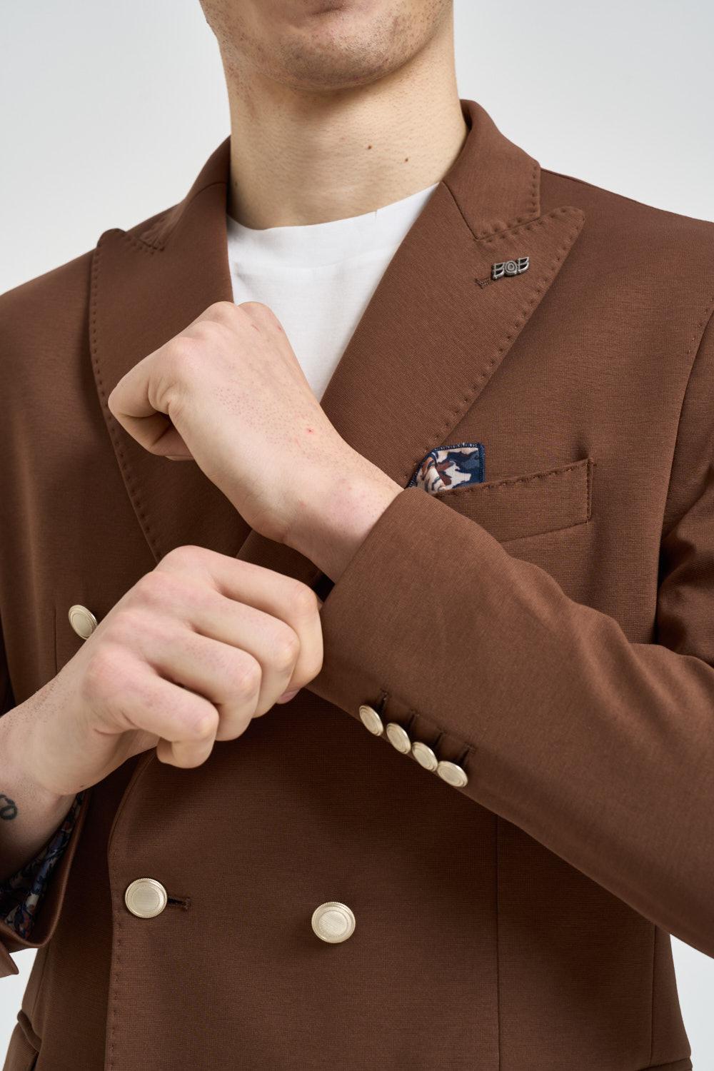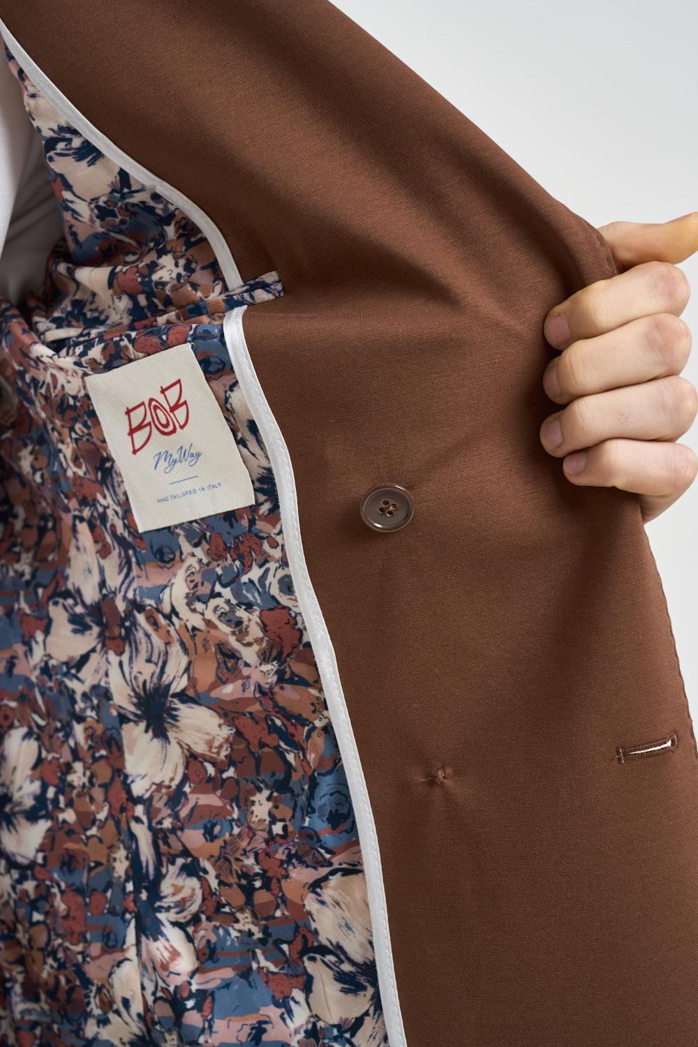 BOB Giacca uomo doppiopetto tabacco. Modello dalla vestibilità regolare. Manica lunga. Bottoni su fondo manica. Rever classico. Tasche a patta frontali. Taschino sul petto. Chiusura frontale con bottoni. Rever classico. Composizione: 56% cotone, 37% poliammide, 7% elastane. Il modello è alto 190cm e indossa la taglia 50.