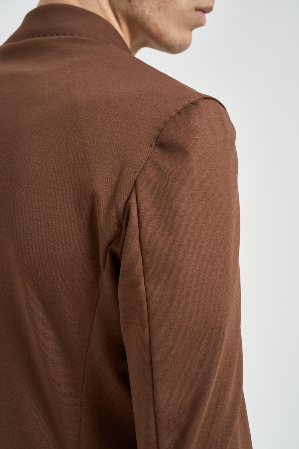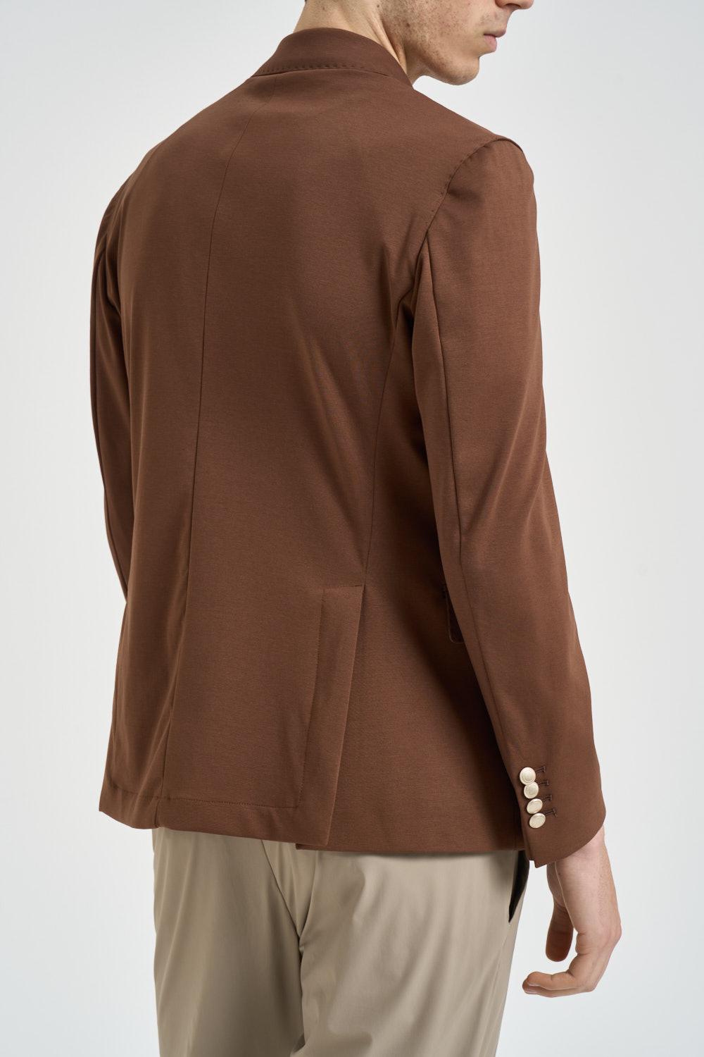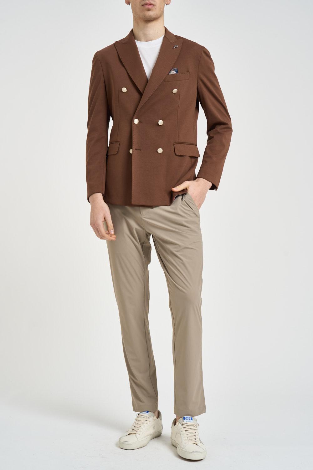 BOB Giacca uomo doppiopetto tabacco. Modello dalla vestibilità regolare. Manica lunga. Bottoni su fondo manica. Rever classico. Tasche a patta frontali. Taschino sul petto. Chiusura frontale con bottoni. Rever classico. Composizione: 56% cotone, 37% poliammide, 7% elastane. Il modello è alto 190cm e indossa la taglia 50.
