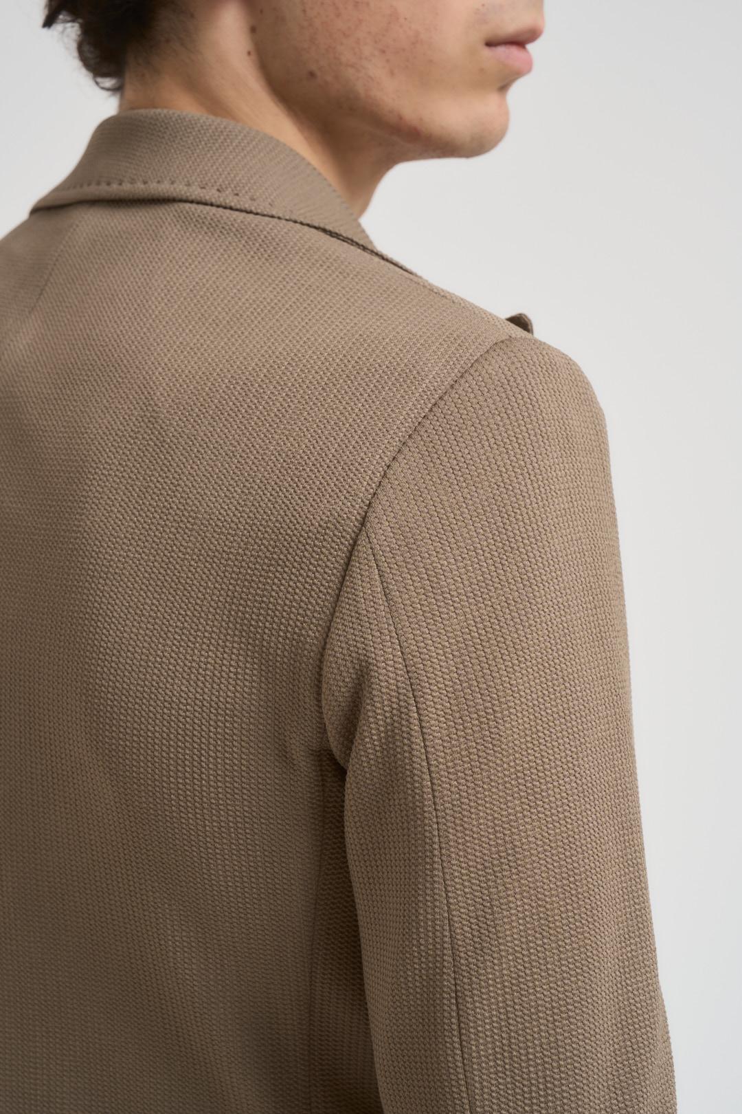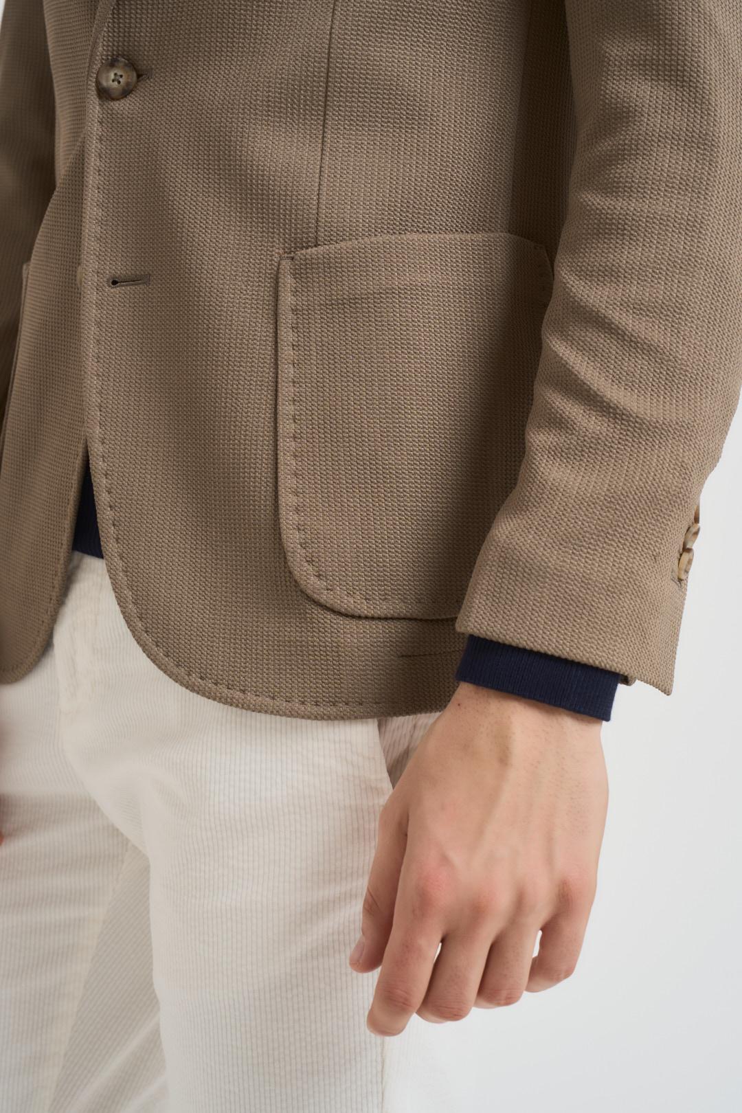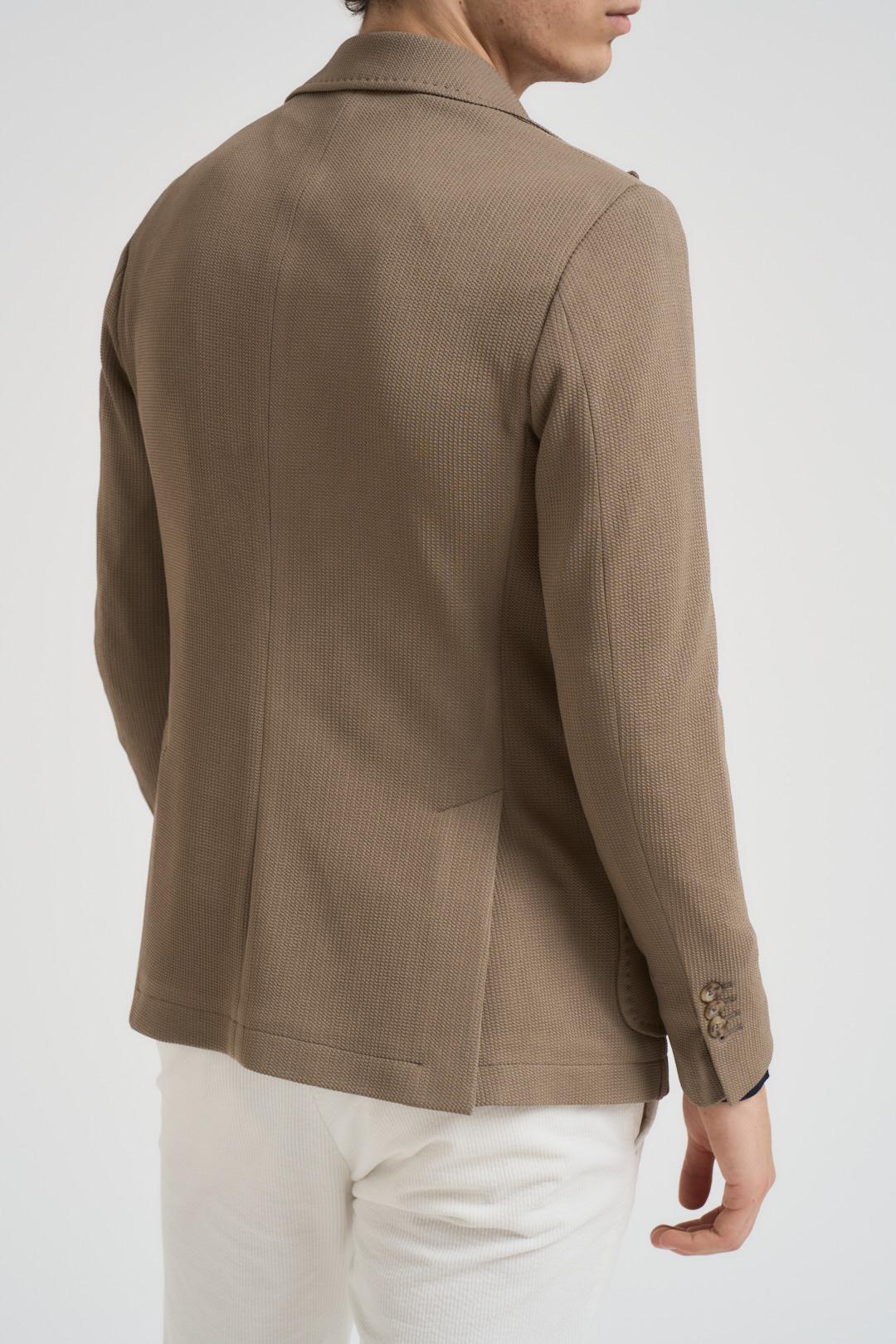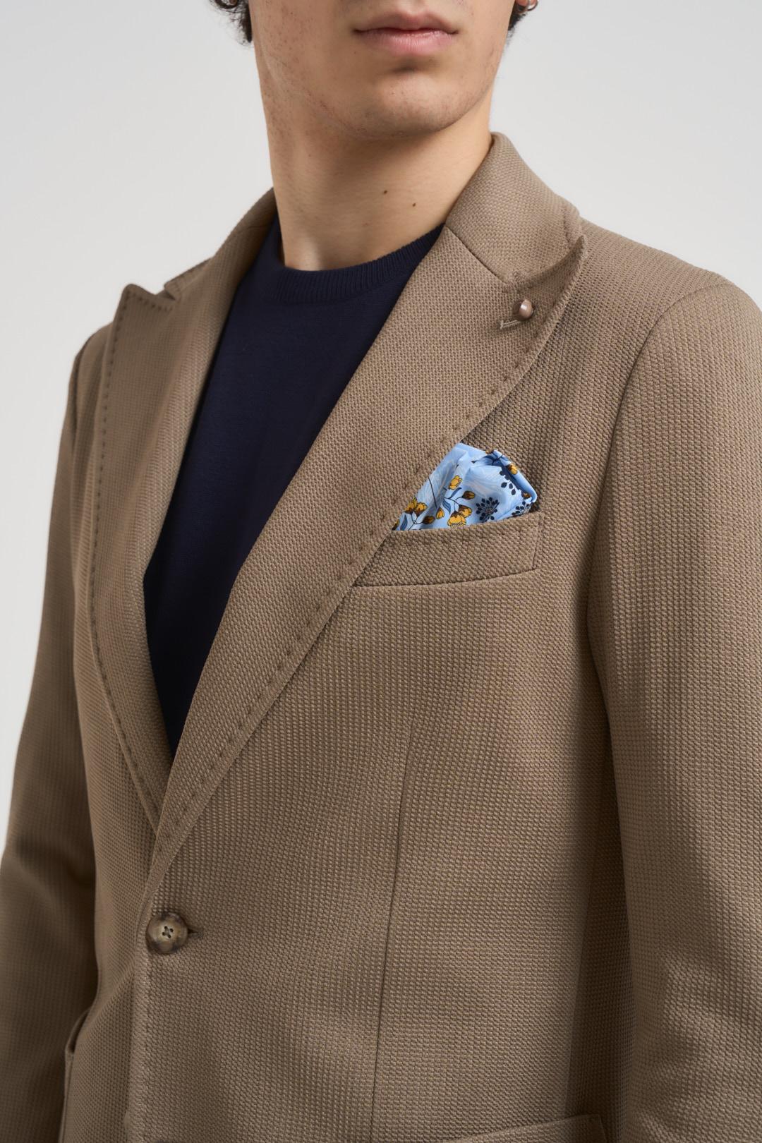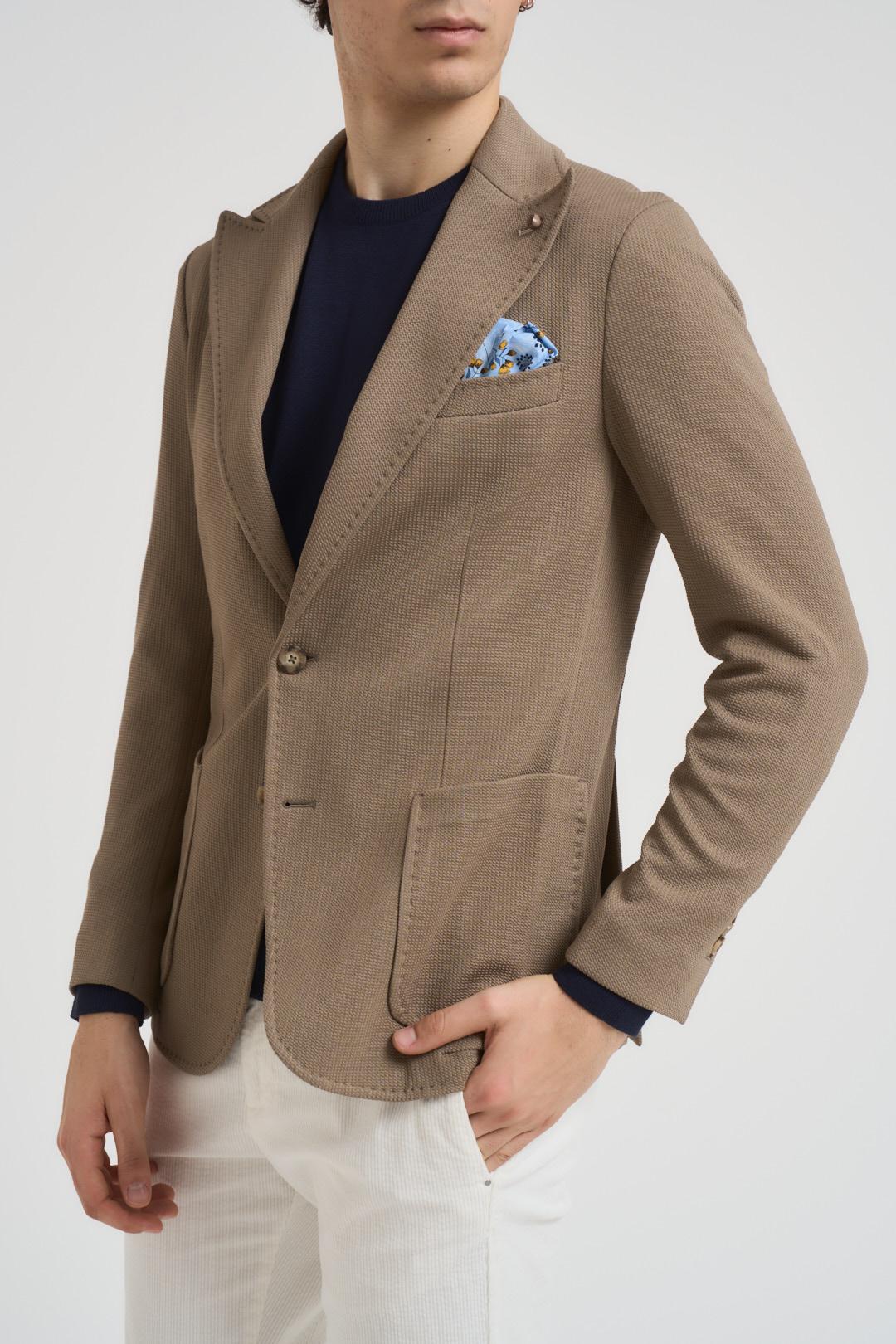AGOEFILO Giacca uomo monopetto tortora. Modello classico collo con revers, chiusura a due bottoni, taschino sul petto pochette. Composizione: misto cotone. Il modello è alto 190cm e indossa la taglia 50.