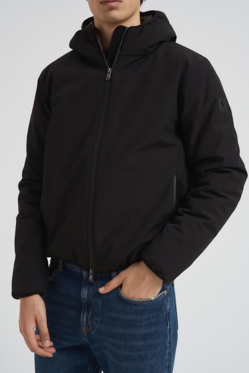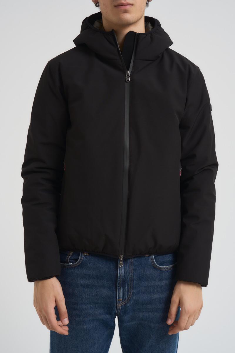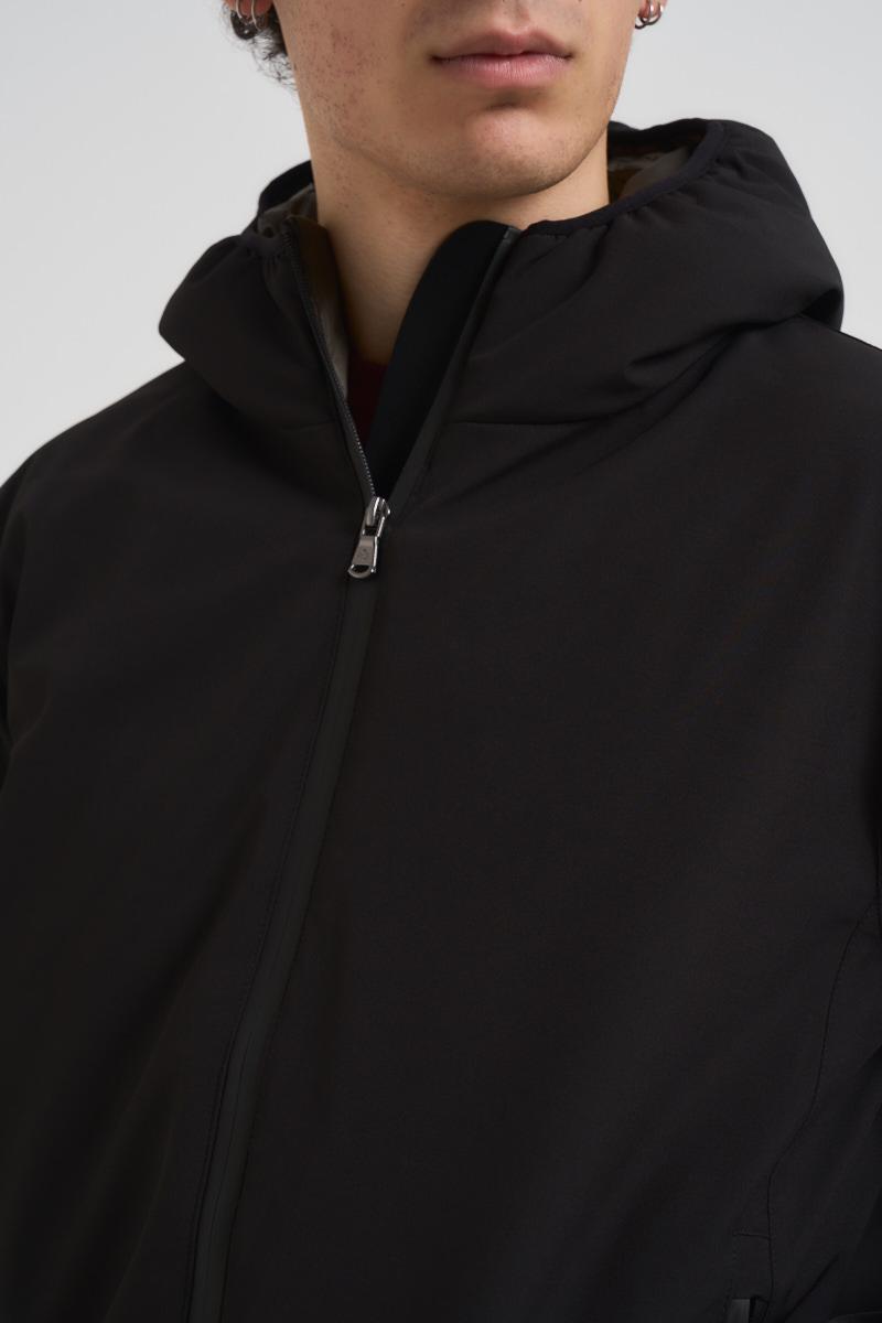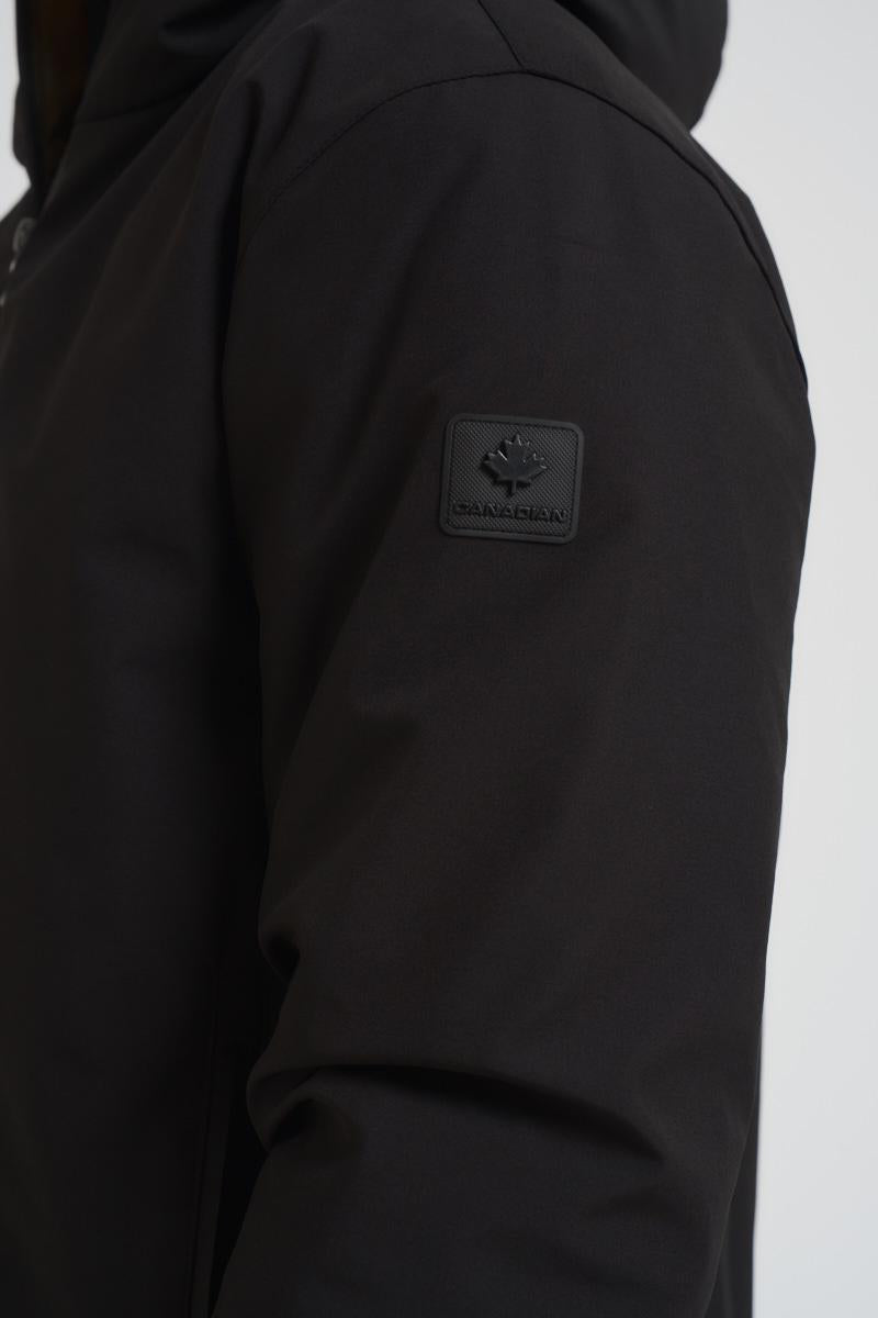 CANADIAN Giacca uomo Yorkton 5 nera. Modello con cappuccio e due tasche a filetto con zip laterali. Patch logo sulla manica a sinistra, tasca interna con zip. Composizione: poliestere. Il modello è alto 190 cm e indossa la taglia 50.