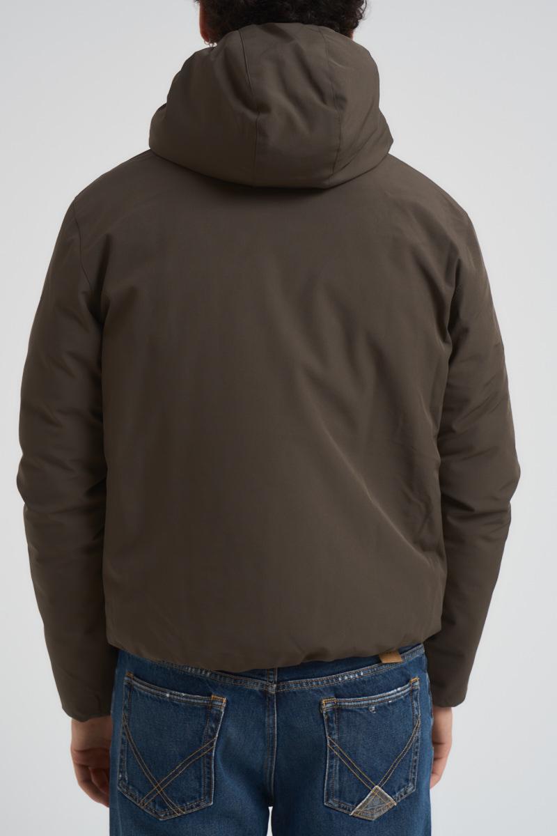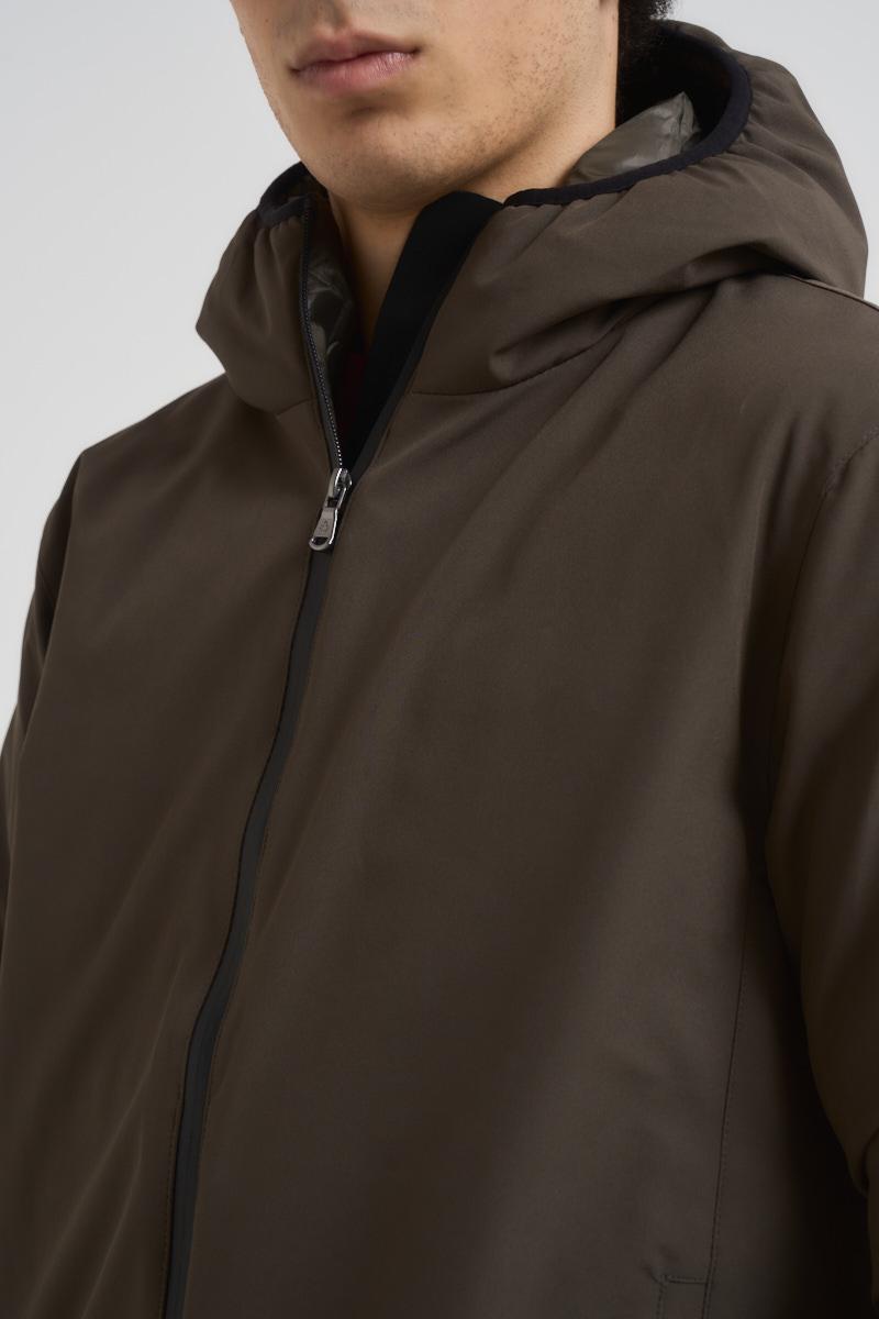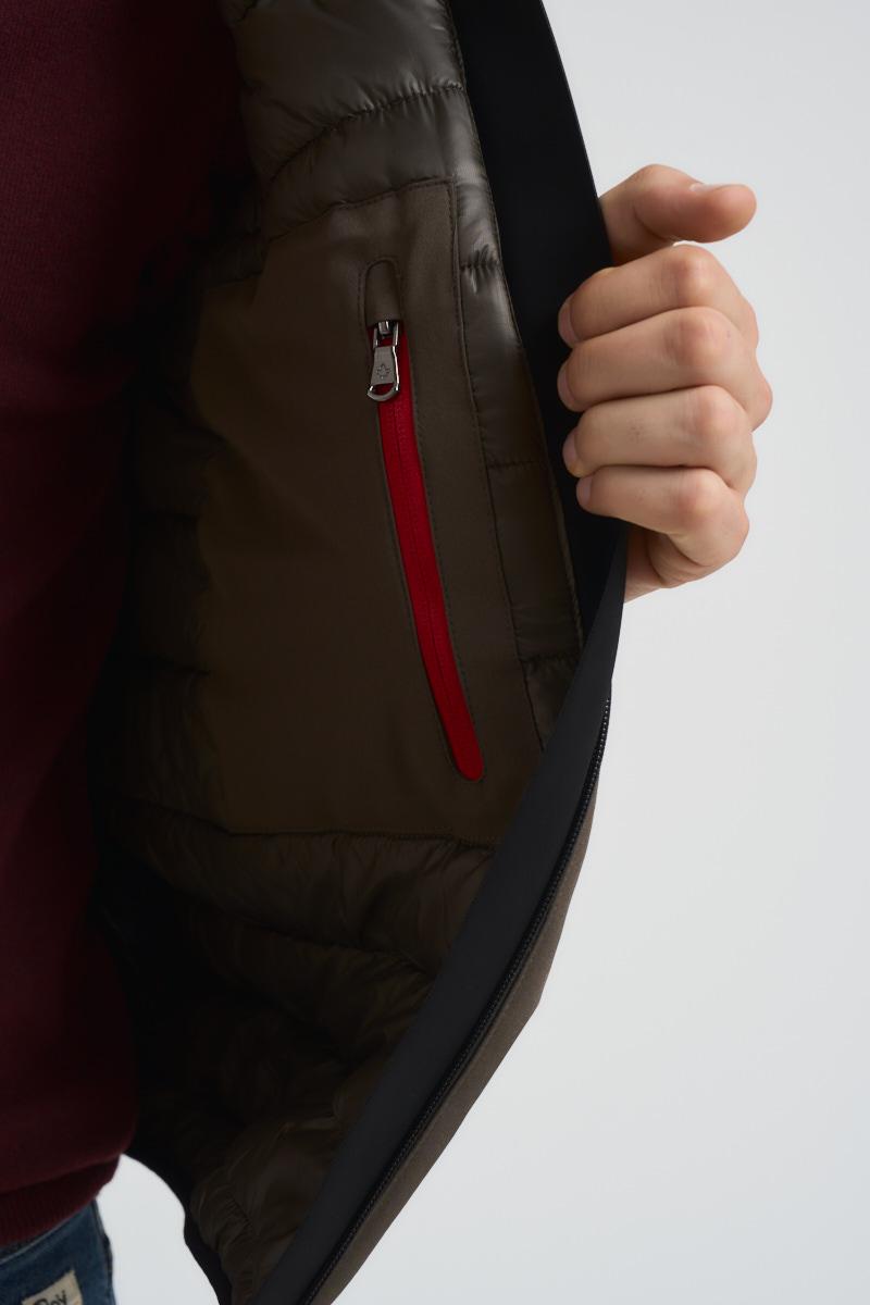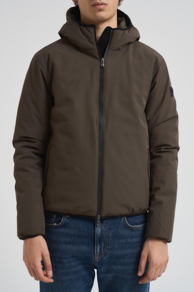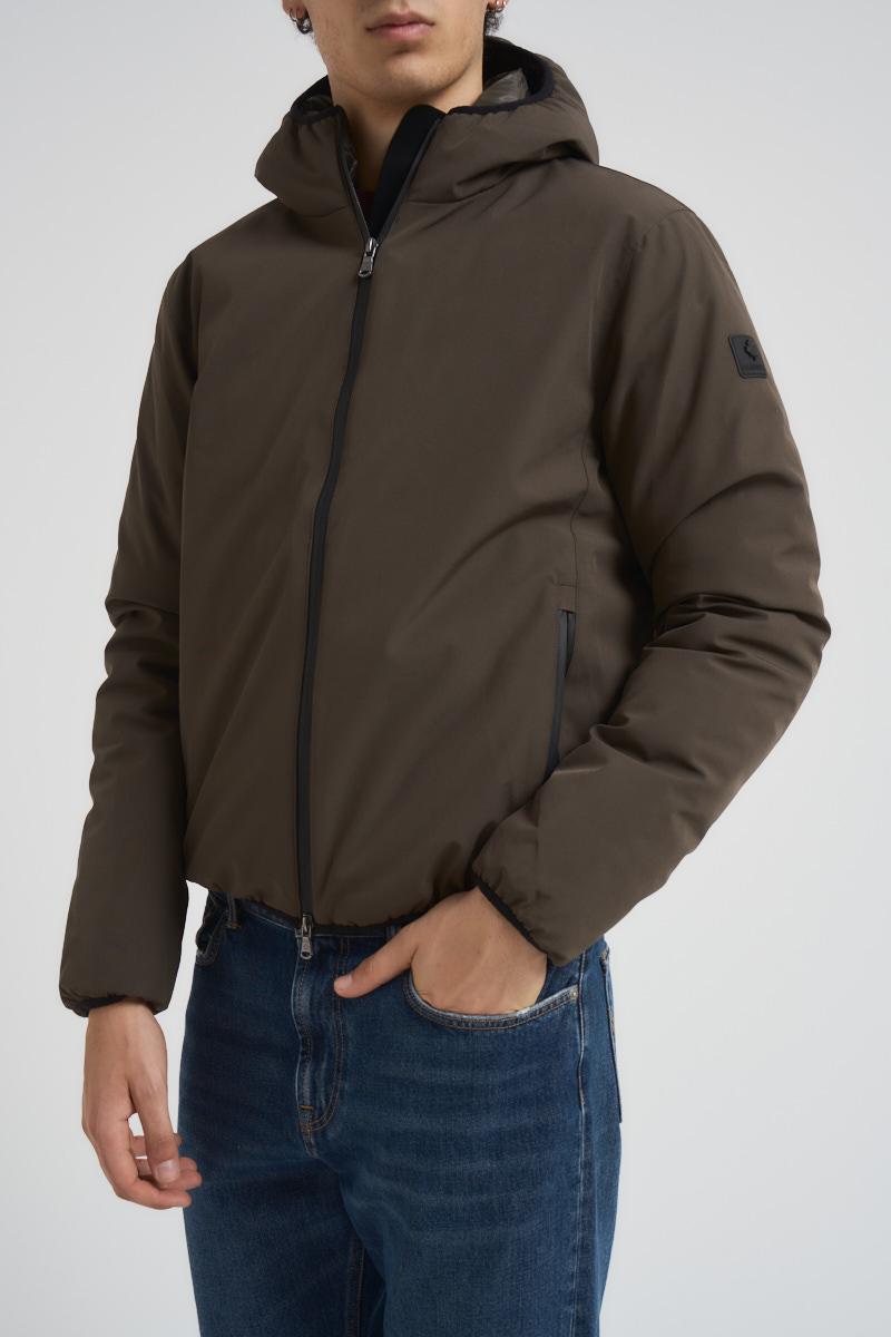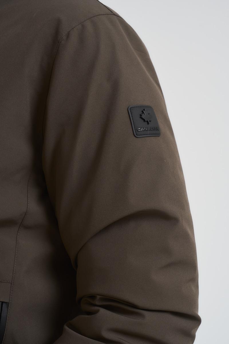 CANADIAN Giacca uomo Yorkton 5 verde. Modello con cappuccio e due tasche a filetto con zip laterali. Patch logo sulla manica a sinistra, tasca interna con zip. Composizione: poliestere. Il modello è alto 190 cm e indossa la taglia 50.