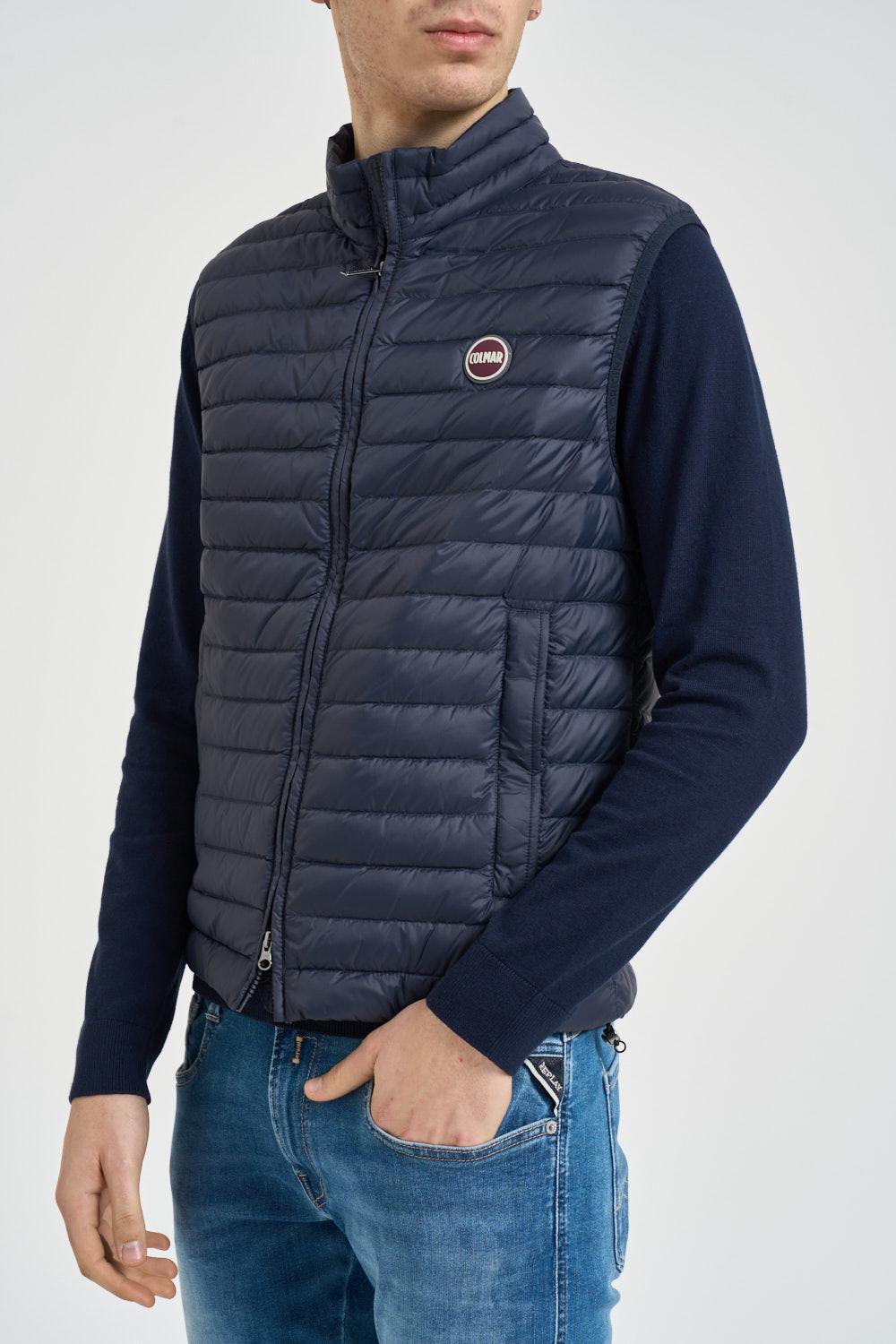 COLMAR Gilet uomo piumino trapuntato blu. Modello dalla finitura morbida e opaca, con fodera a contrasto, imbottitura leggera in piuma certificata, collo alto, giromanica in elastico nastrato, chiusura centrale e tasche a filo con zip a scomparsa, logo gommato a rilievo patch sulla manica lunga e sul retro bordo e fondo regolabile da coulisse. Composizione:100% poliammide. Imbottitura: 90% piumino 10% piuma. Il modello è alto 190 cm e indossa la taglia 50.
