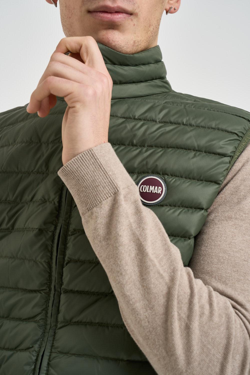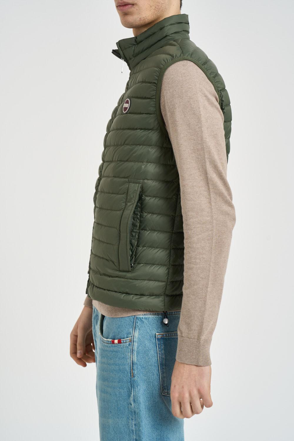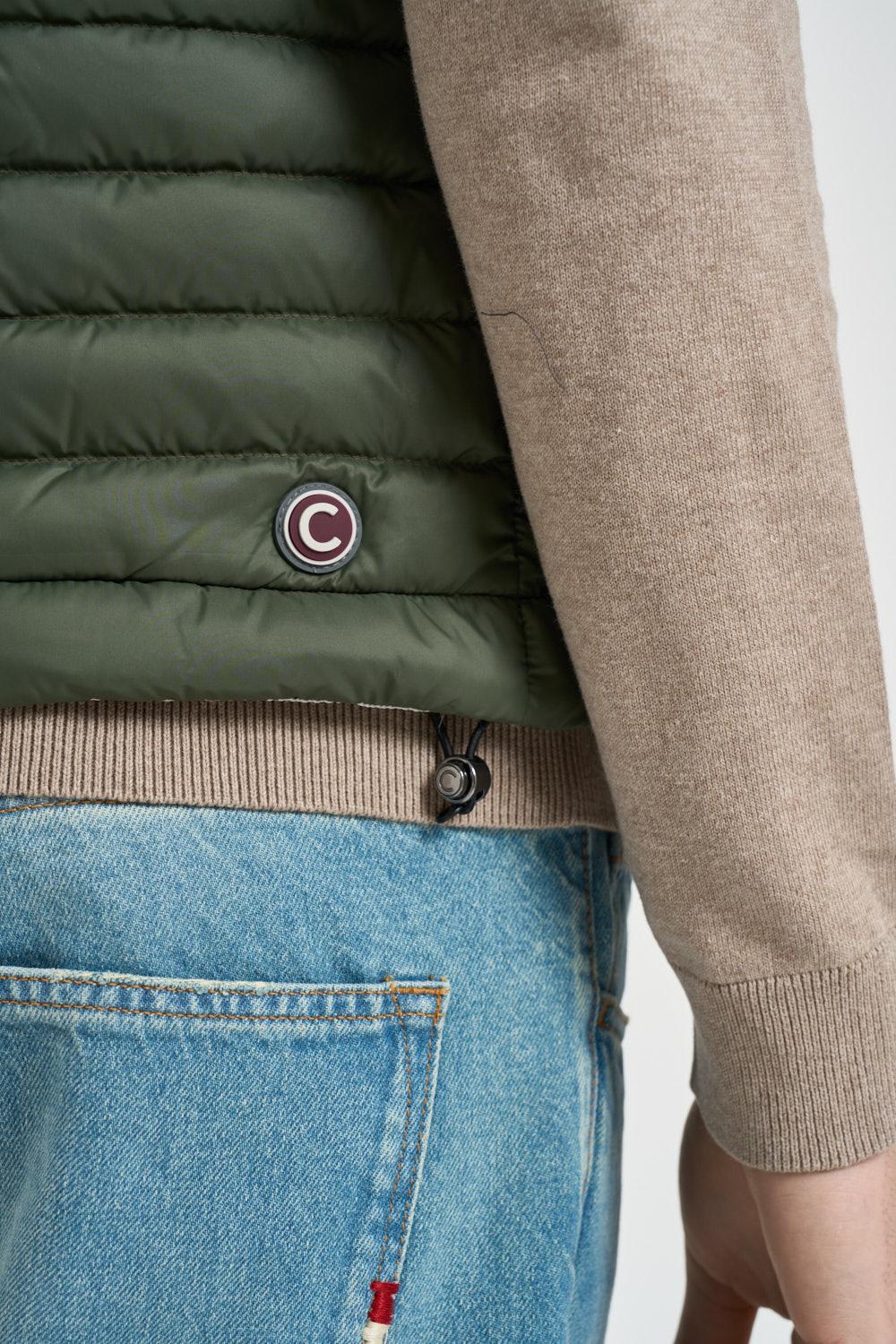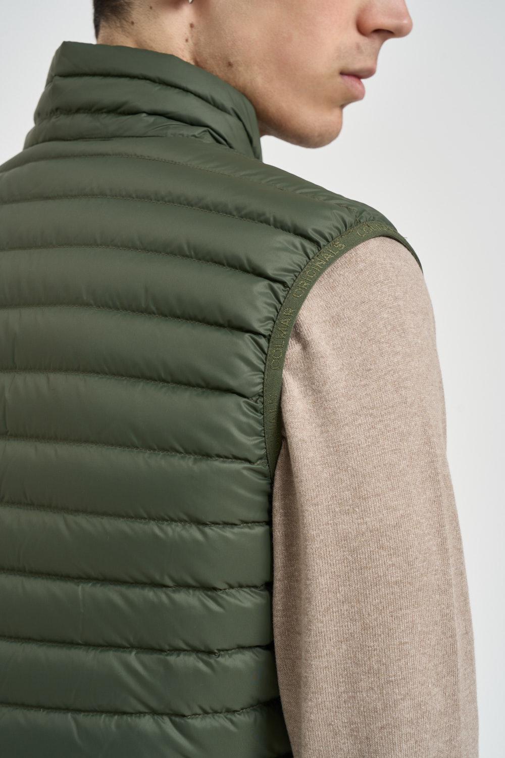 COLMAR Gilet uomo piumino trapuntato verde. Modello dalla finitura morbida e opaca, con fodera a contrasto, imbottitura leggera in piuma certificata, collo alto, giromanica in elastico nastrato, chiusura centrale e tasche a filo con zip a scomparsa, logo gommato a rilievo patch sulla manica lunga e sul retro bordo e fondo regolabile da coulisse. Composizione:100% poliammide. Imbottitura: 90% piumino 10% piuma. Il modello è alto 190 cm e indossa la taglia 50.