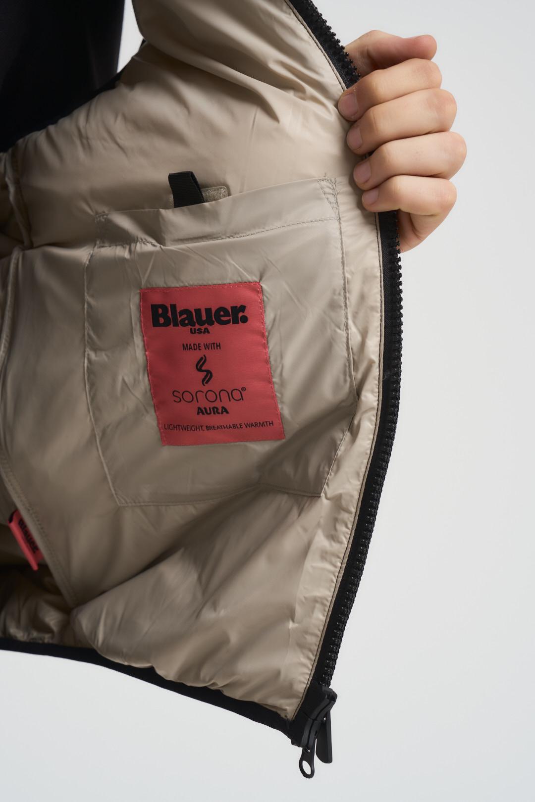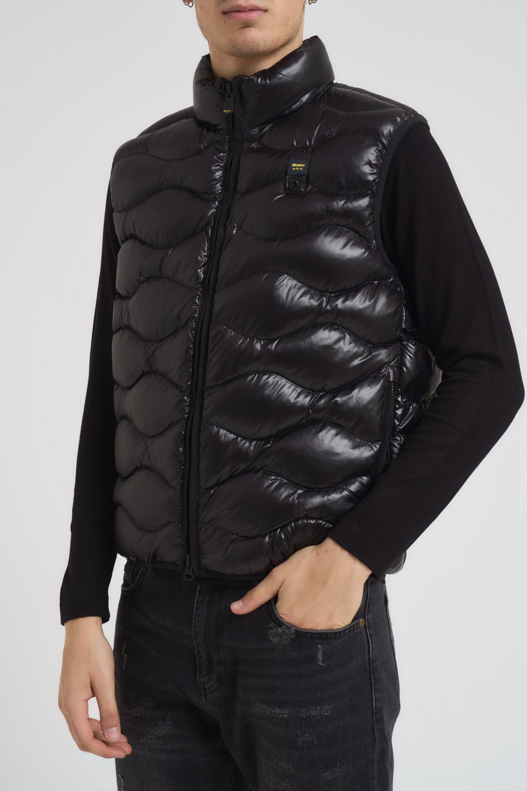 BLAUER Gilet uomo trapuntato a onde blu. Modello realizzato in nylon micro rip, imbottito ovatta Sorona® Aura con chiusura con zip nascosta. Tasche con zip nascosta e tasche interne con velcro e passante con logo. Il modello è alto 190cm e indossa la taglia L.