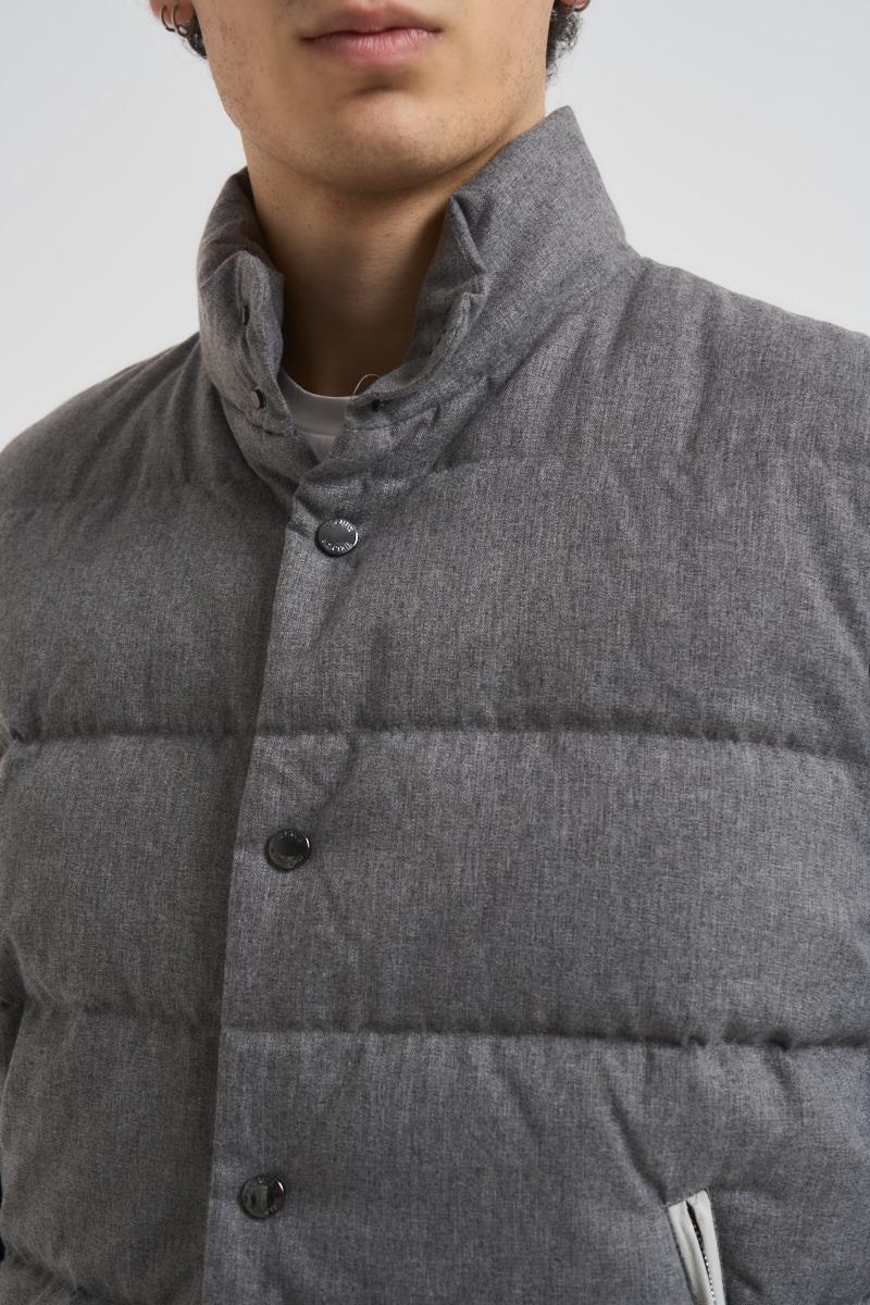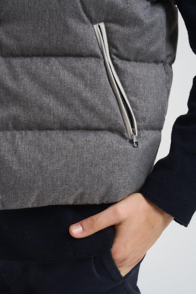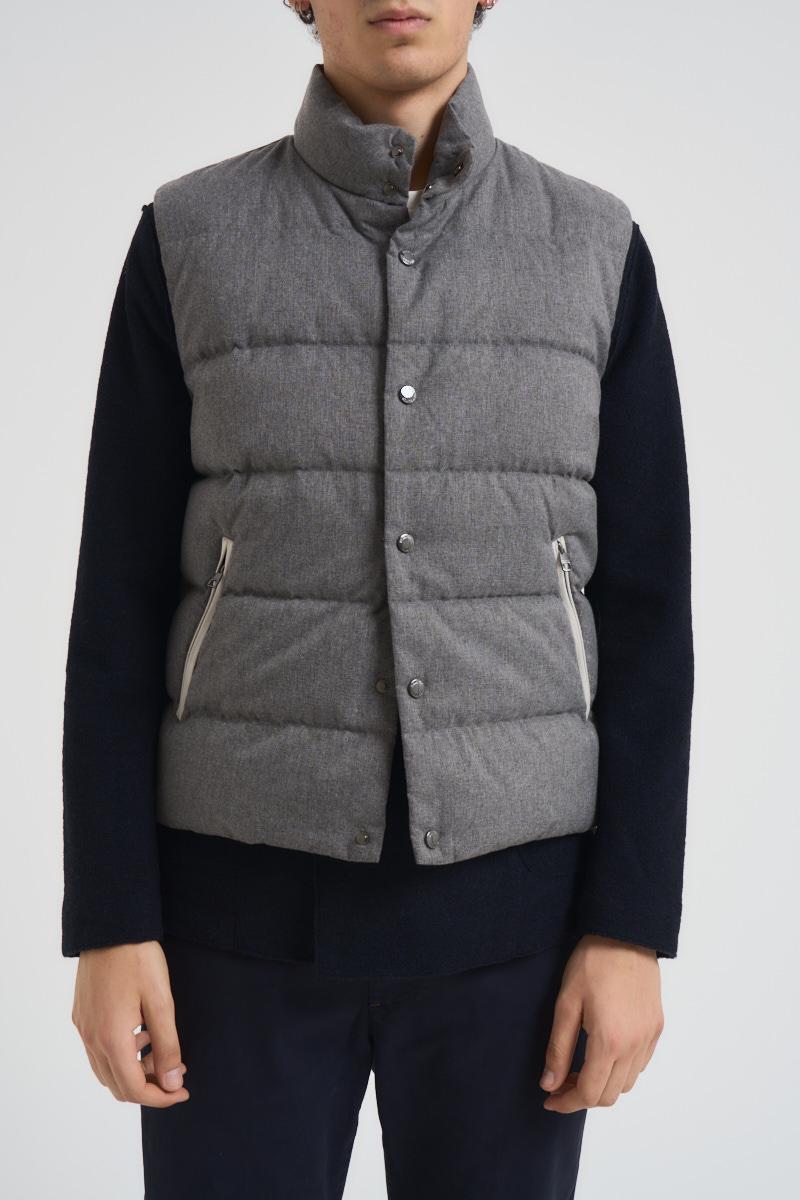 HELMUR Gilet uomo trapuntato grigio. Modello con chiusura a bottoni, due tasche laterali con zip, mezzo collo, tasca interna con zip. Composizione: 100% poliestere. Imbottitura: 50% piumino 50% piuma. Il modello è alto 190 cm e indossa la taglia 50.