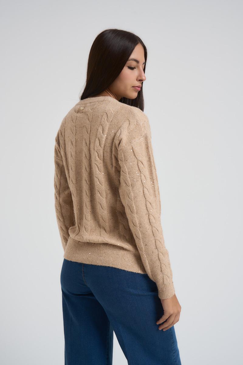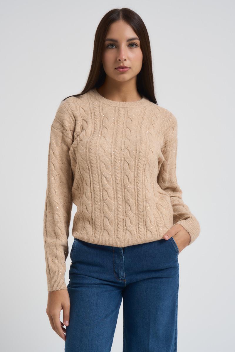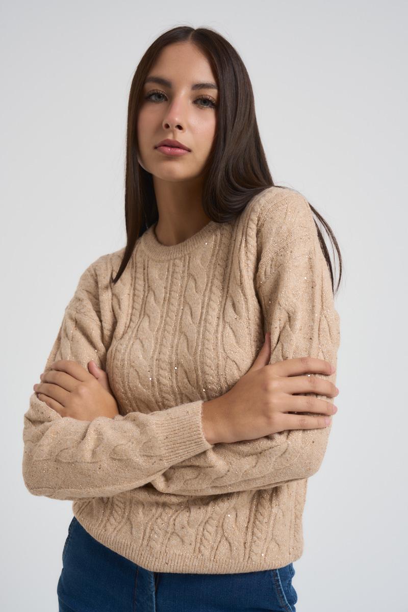 MARKUP Girocollo trecce e paillettes donna cammello. Modello in misto lana con lavorazione a trecce. Composizione: 57% Acrilico 40% Poliestere 3% Elastan. La modella è alta 176 cm e indossa la taglia S.