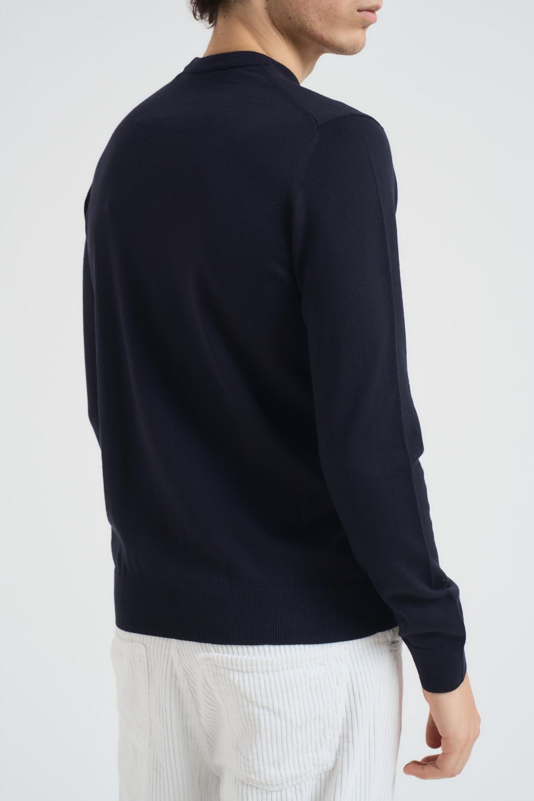 ALPHA STUDIO Girocollo uomo in lana blu. Modello a maniche lunghe in lana merinos. Collo, polsi e fondo a costine. Slim fit. Composizione: 100% Lana Merinos. Il modello è alto 190 cm e indossa la taglia 48.