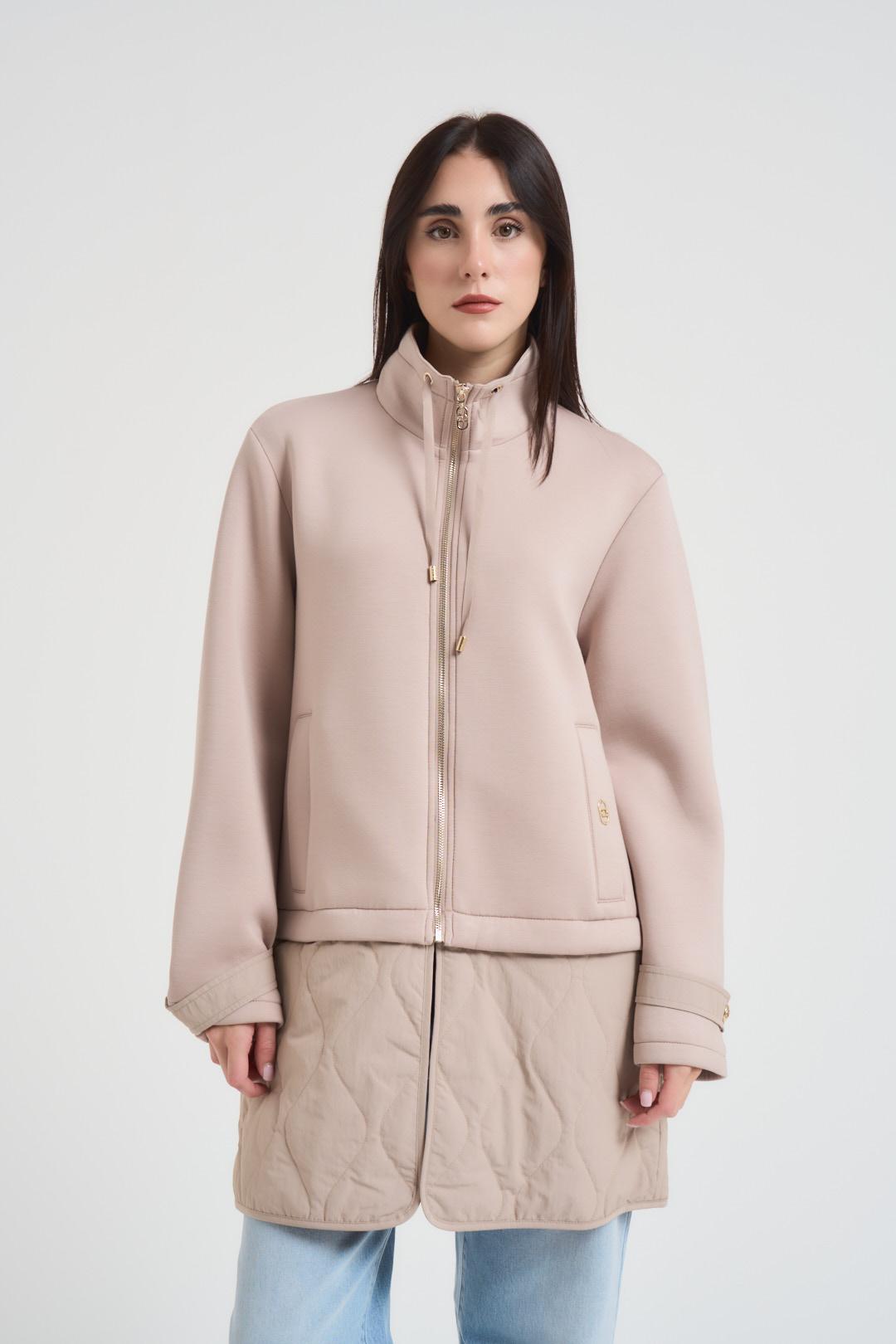 LIU JO SPORT Giubboto donna in Scuba beige. Modello con inserto rimovibile in nylon trapuntato e logo in metallo. Collo alto con coulisse. Polsi con cinturino. Tasche laterali. Chiusura con zip e tirazip logato. Regular fit. Composizione: 80% Viscosa 14% Poliammide 6% Elastan. La modella è alta 175 cm e indossa la taglia S.