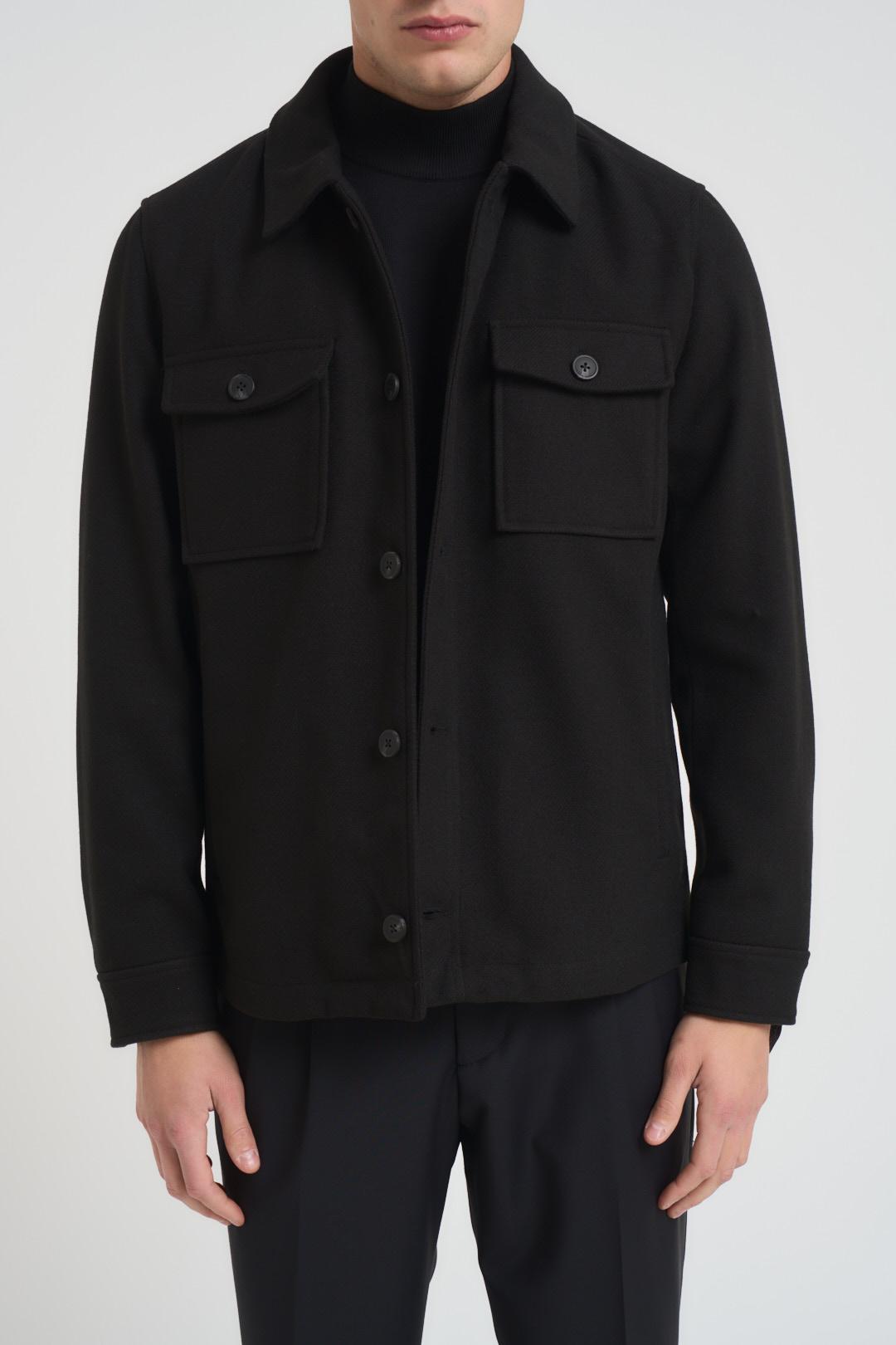 HAMAKI-HO MILANO Giubbotto a camicia uomo nero. Modello con chiusura a bottoni, due tasche a patta sul davanti e bottoncino. Manica lunga con chiusura con bottone su polso. Composizione: 60% poliestere 20% acrilico 20%rayon. Il modello è alto 190cm e indossa la taglia L.