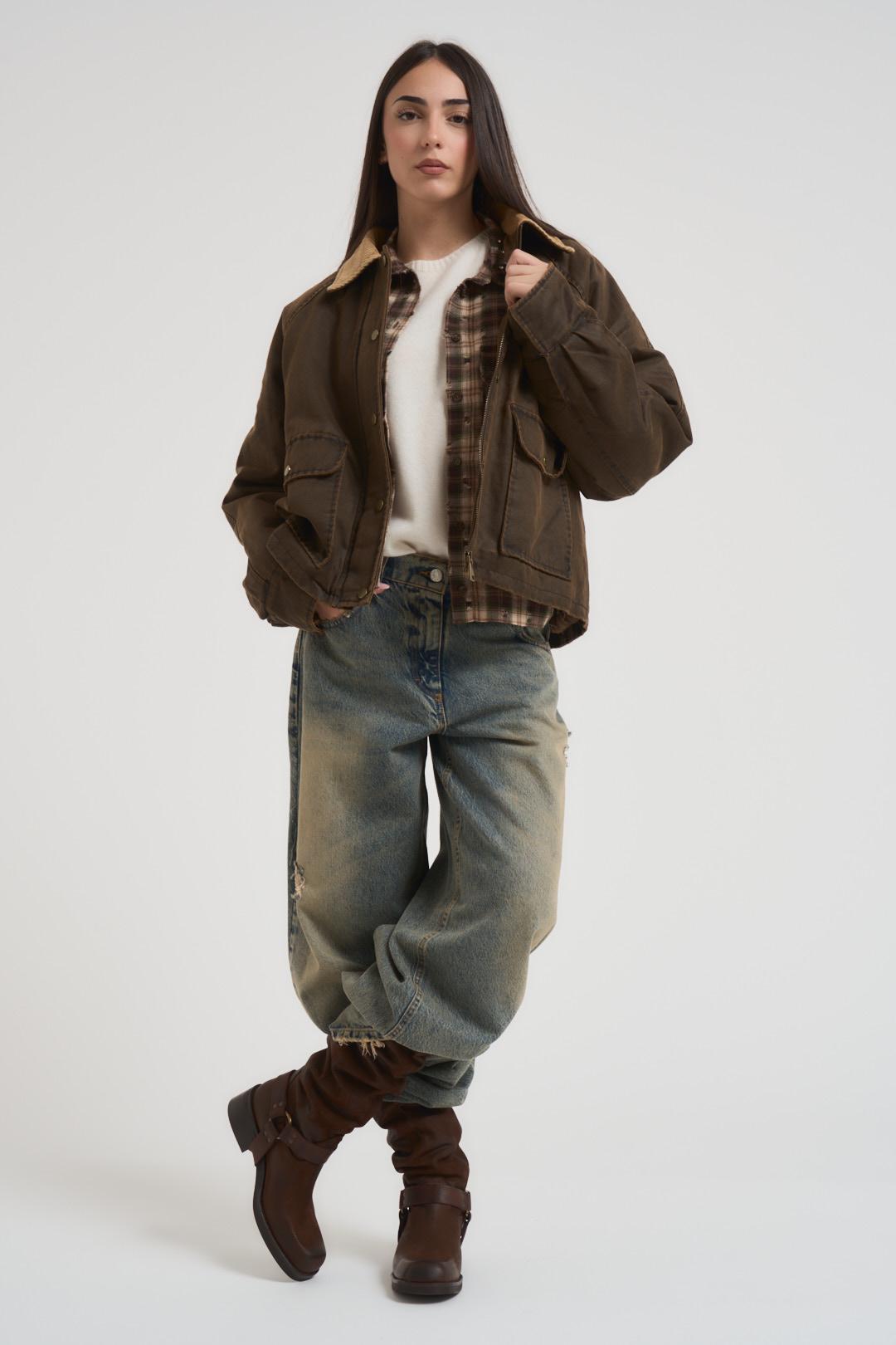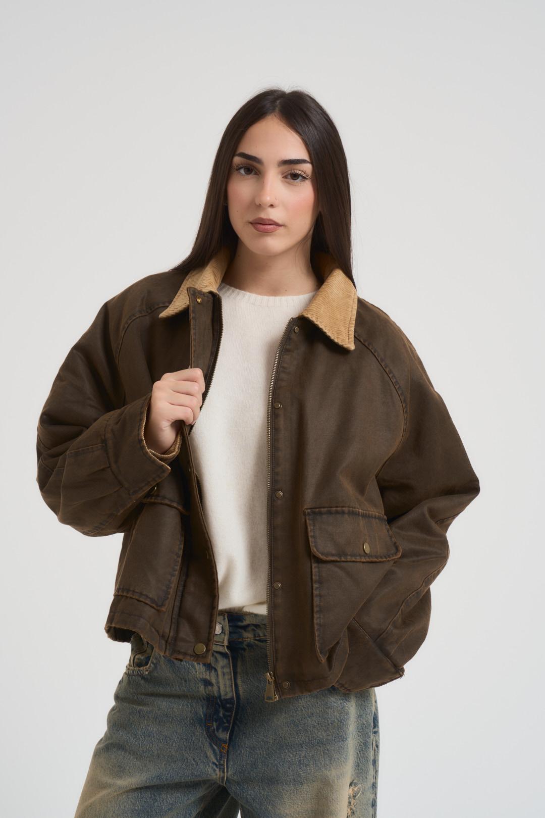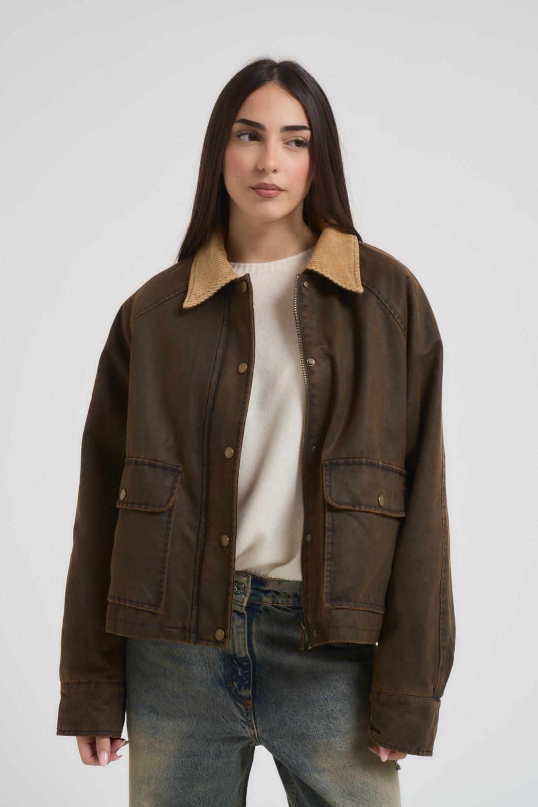 SUSY MIX Giubbotto donna con colletto in velluto marrone. Modello con due tasche con patta laterali, chiusura con zip e bottoni automatici. Composizione: 70%Poliestere 30%Cotone. La modella è alta 172 cm e indossa la taglia unica.
