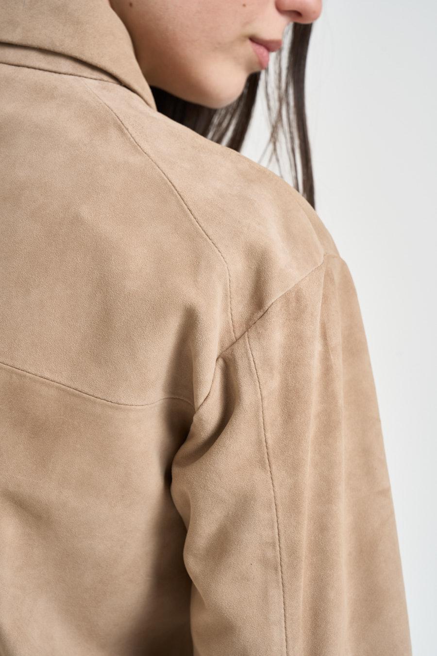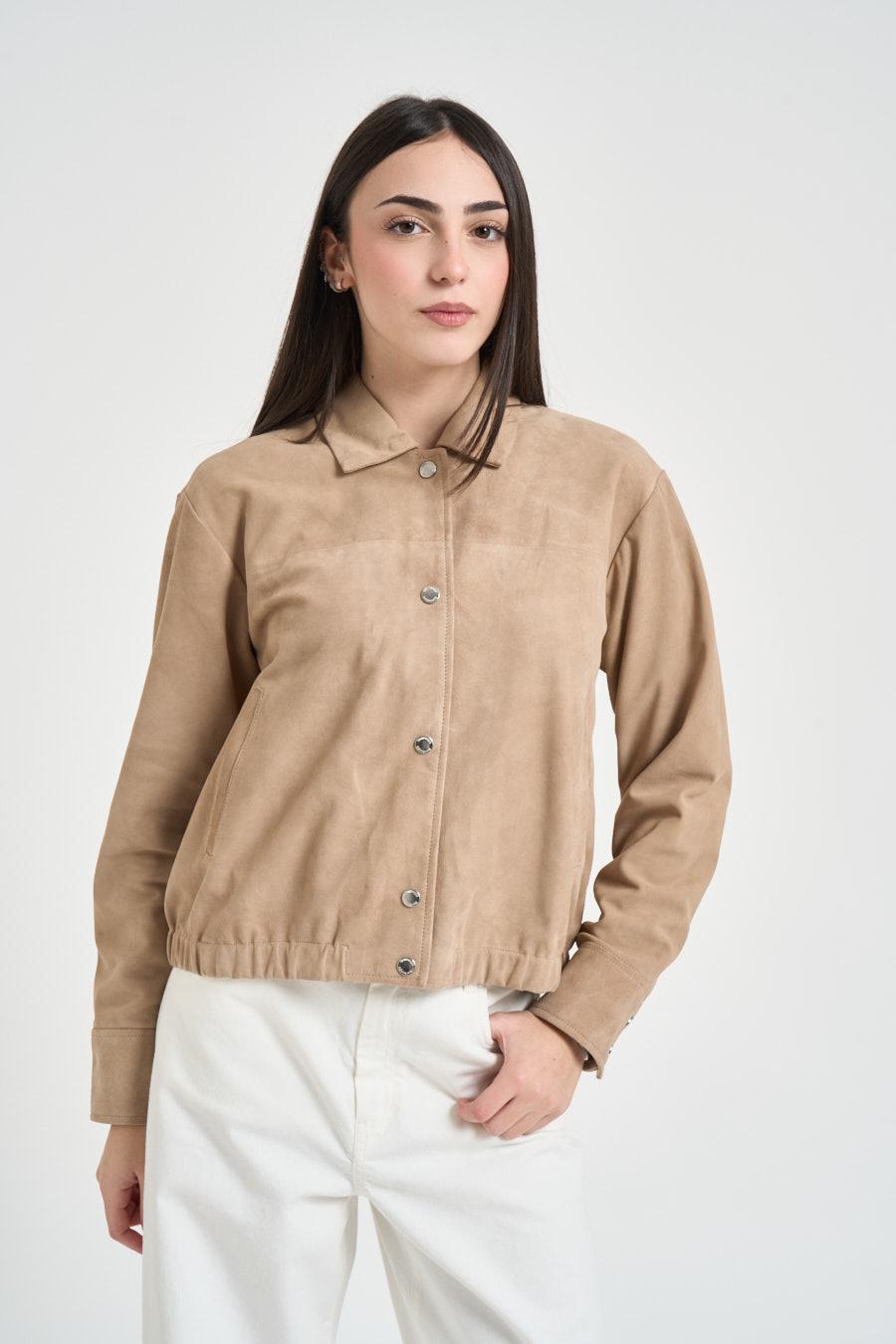 BOOMBOGIE Giubbotto donna con colletto sabbia. Modello corto, maniche lunghe, chiusura frontale con bottoni a pressione metallici e colletto classico. Tasche laterali a filetto e fondo leggermente elasticizzato per una vestibilità confortevole. Composizione: 100% pelle. La modella è alta 172cm e indossa la taglia 2.