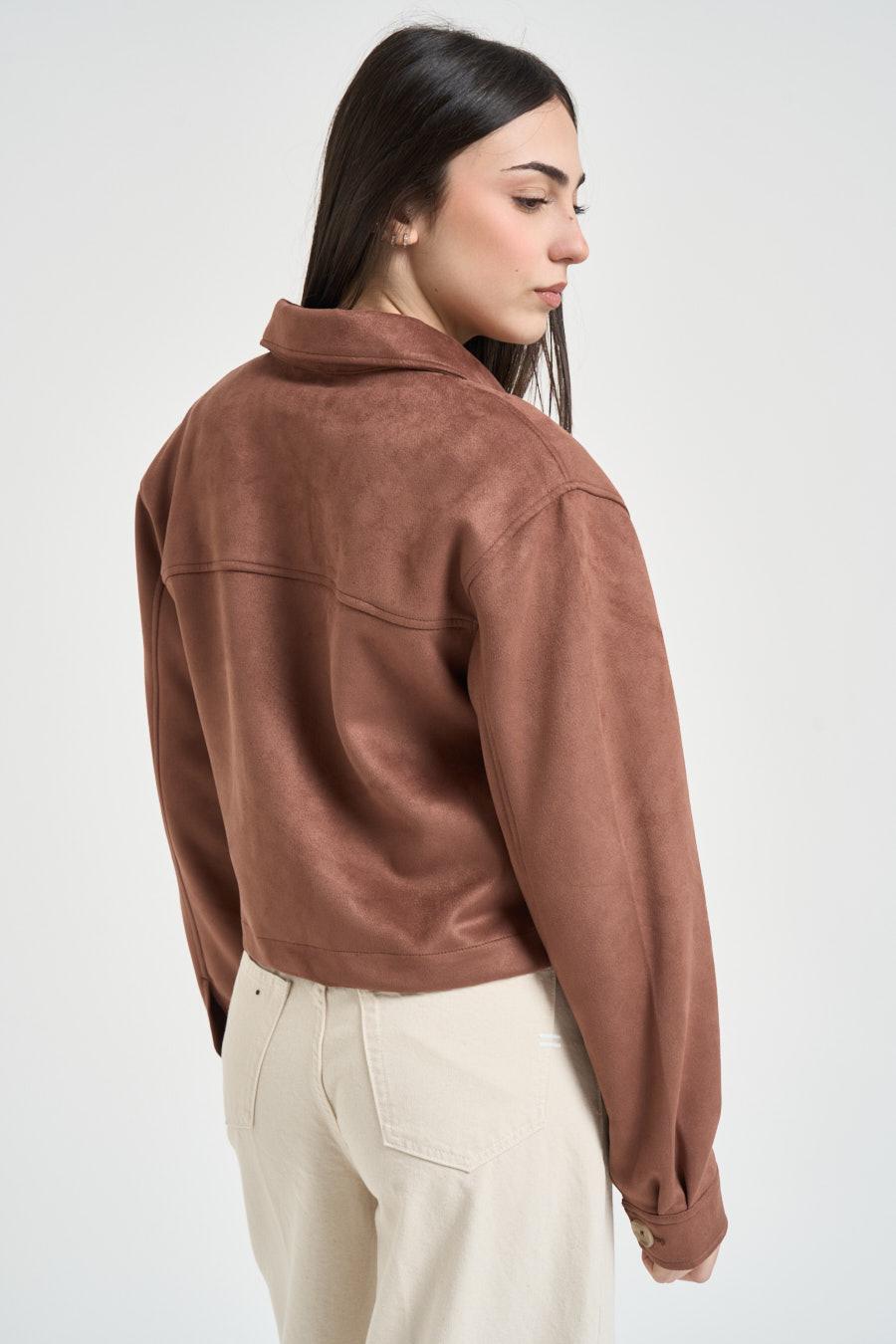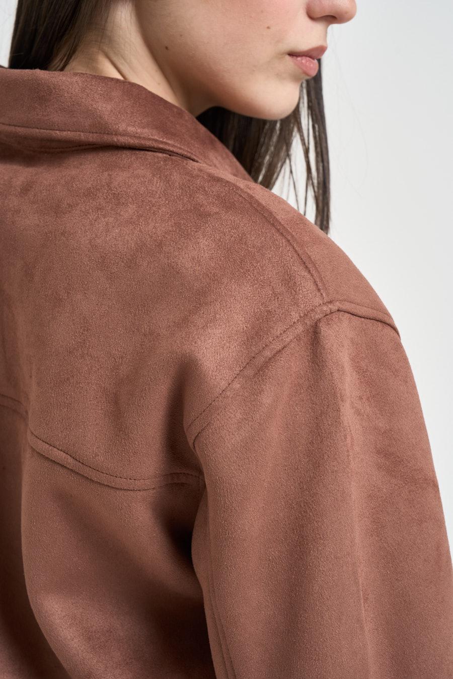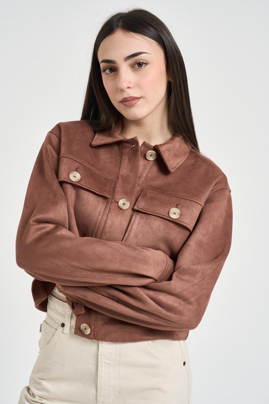 ONLY Giubbotto donna in suede marrone. Modello realizzato in tessuto effetto suede. Struttura con colletto classico e chiusura frontale con bottoni a vista. Il capo presenta due tasche applicate sul petto con patta e bottone. Linea leggermente boxy. Maniche lunghe con polsini regolabili tramite bottone. Composizione: 95%poliestere 5%elastane. La modella è alta 172 cm e indossa la taglia S.