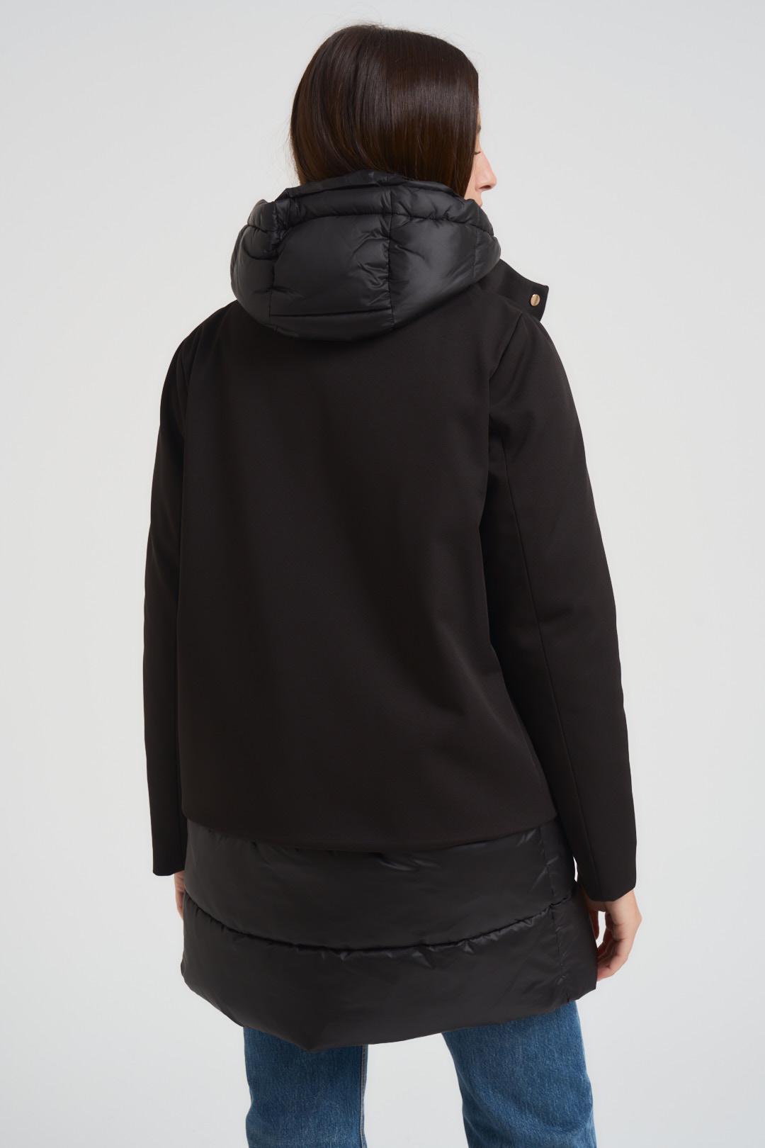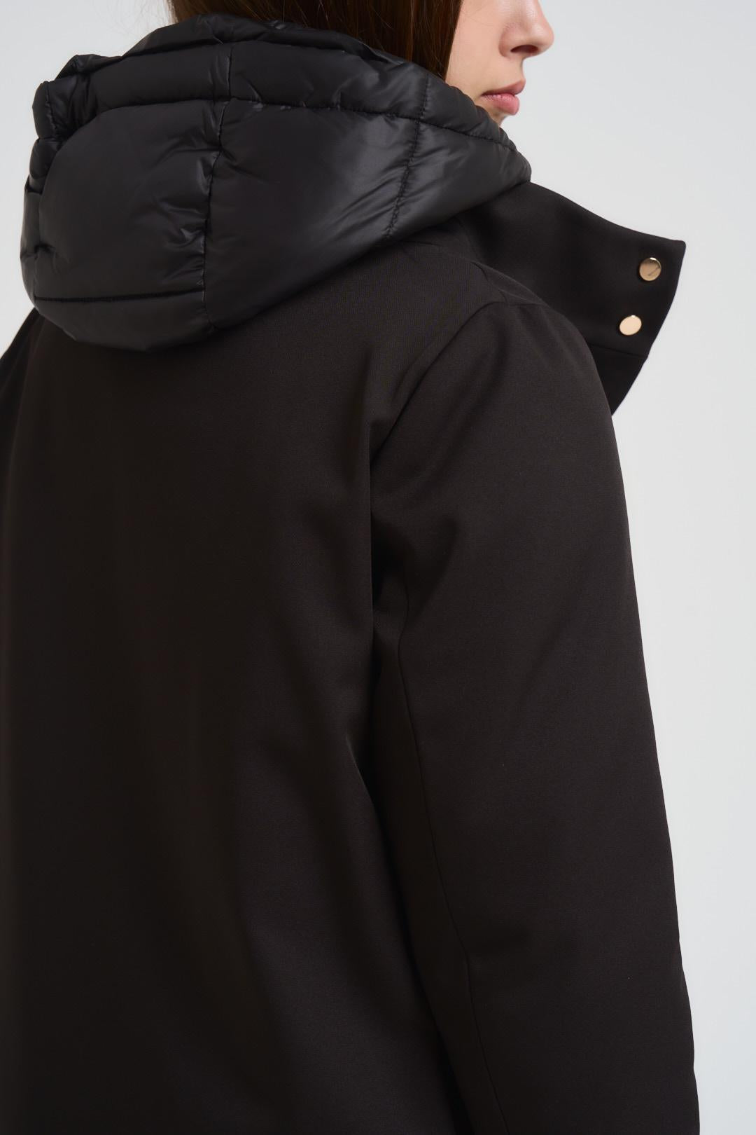 ADIMARI Giubbotto donna midi con pettorina nero. Modello con pettorina con chiusura frontale con bottoni a pressione e manica lunga. Due tasche a filetto. Collo alto. Piumino sottostante con collo alto e chiusura frontale con zip. Cappuccio con coulisse regolabile. Composizione: nylon e poliestere. La modella è alta 176 cm e indossa la taglia S.
