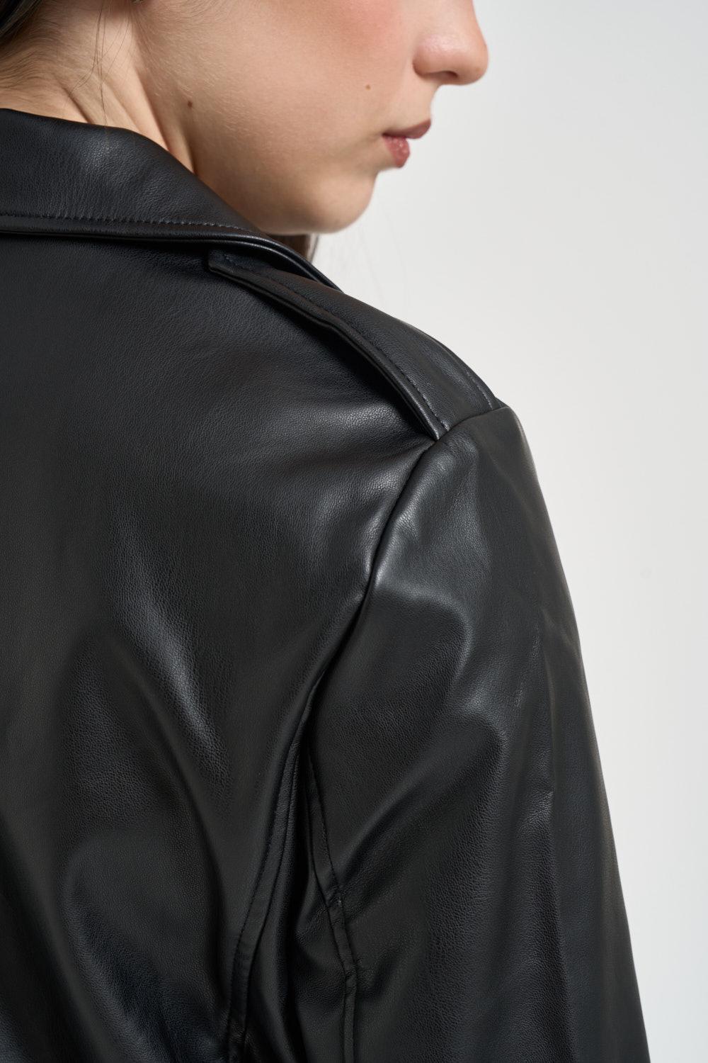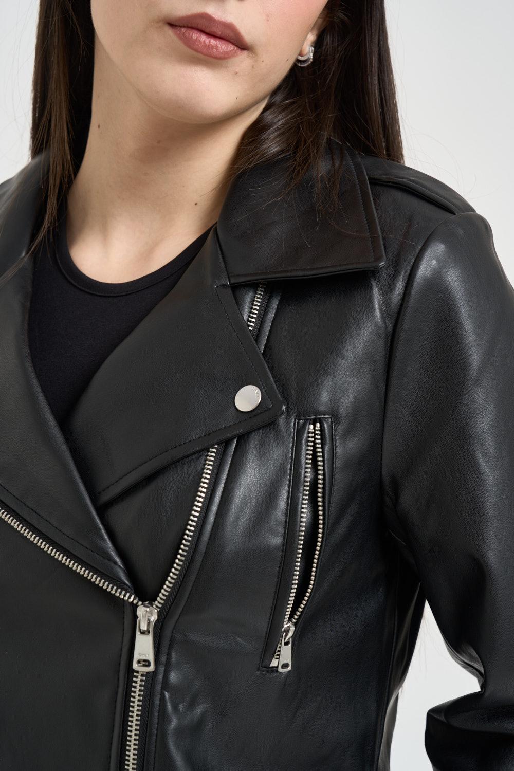 ONLY NOOS Giubbotto donna ecopelle nero. Modello biker realizzato in similpelle liscia con linea leggermente cropped. Collo con revers ampi, chiusura frontale con zip asimmetrica in metallo e dettagli con bottoni automatici. Tasche frontali con zip e zip decorativa sul petto. Maniche lunghe con finitura liscia e fondo dritto. Composizione: 100% poliestere. La modella è alta 172cm e indossa la taglia S.