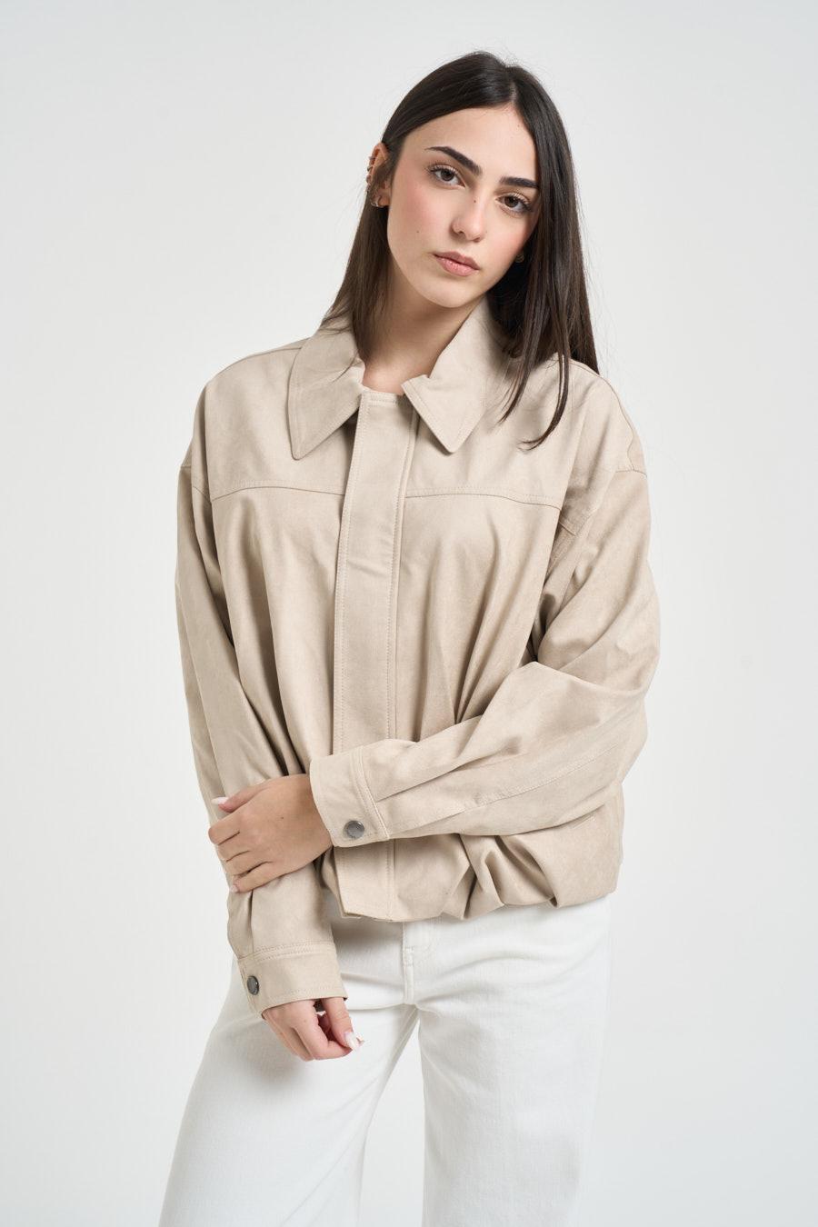 GRACE AND MILA Giubbotto donna vita arricciata beige. Modello realizzato in tessuto effetto suede. Chiusura frontale con cerniera. Colletto classico, chiusura frontale nascosta. Spalle leggermente scese per un fit rilassato e moderno. Maniche lunghe con polsini regolabili tramite bottone. Composizione: 90% Poliestere, 10% Elastane. La modella è alta 172 cm e indossa la taglia S.