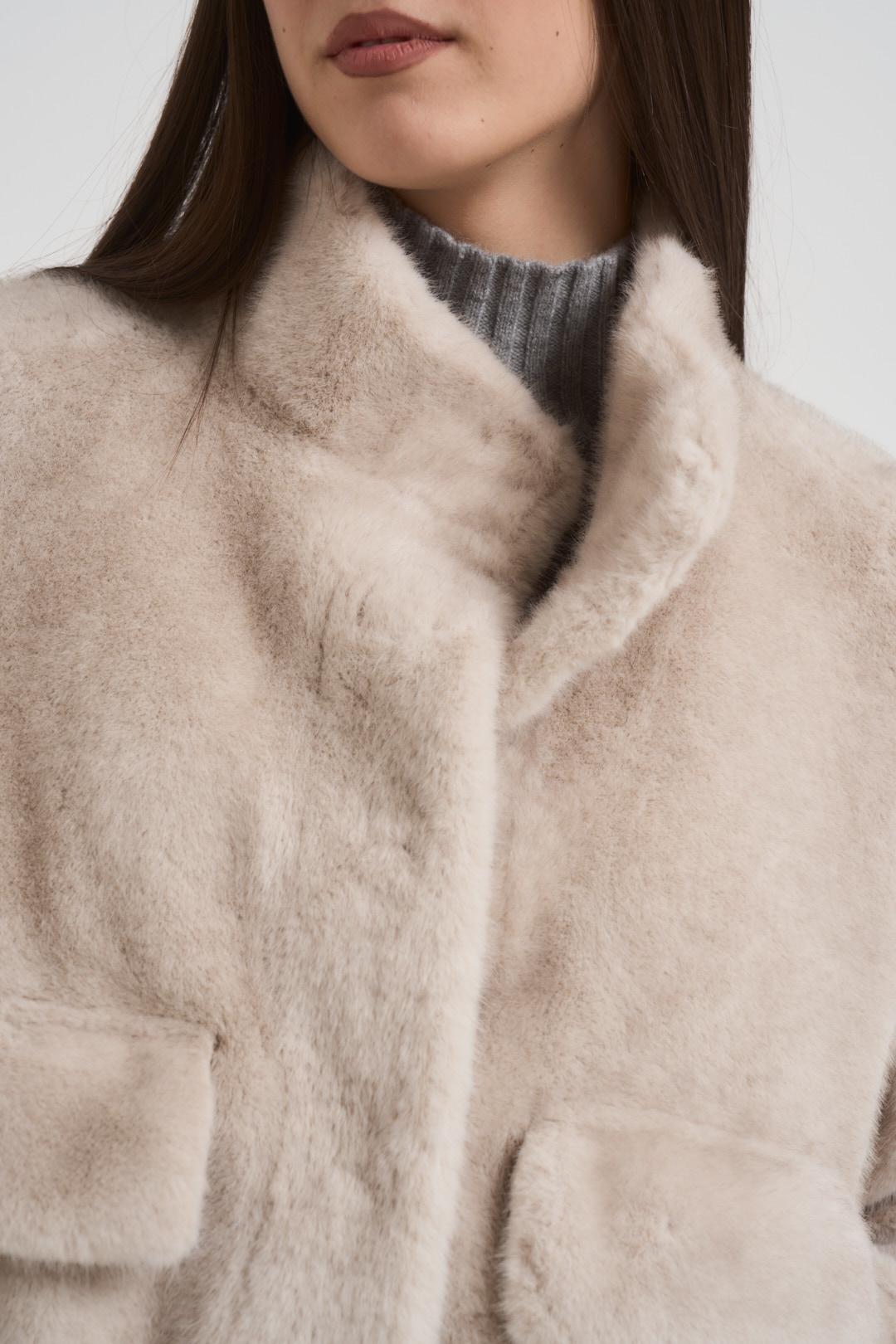 VITTO Giubbotto ecopelliccia donna beige. Modello chiusura con bottoni nascosti, collo alto, 2 tasche frontali con patta, polsini e orlo elasticizzati. Composizione: 100% poliestere. La modella è alta 172 cm e indossa la taglia S.