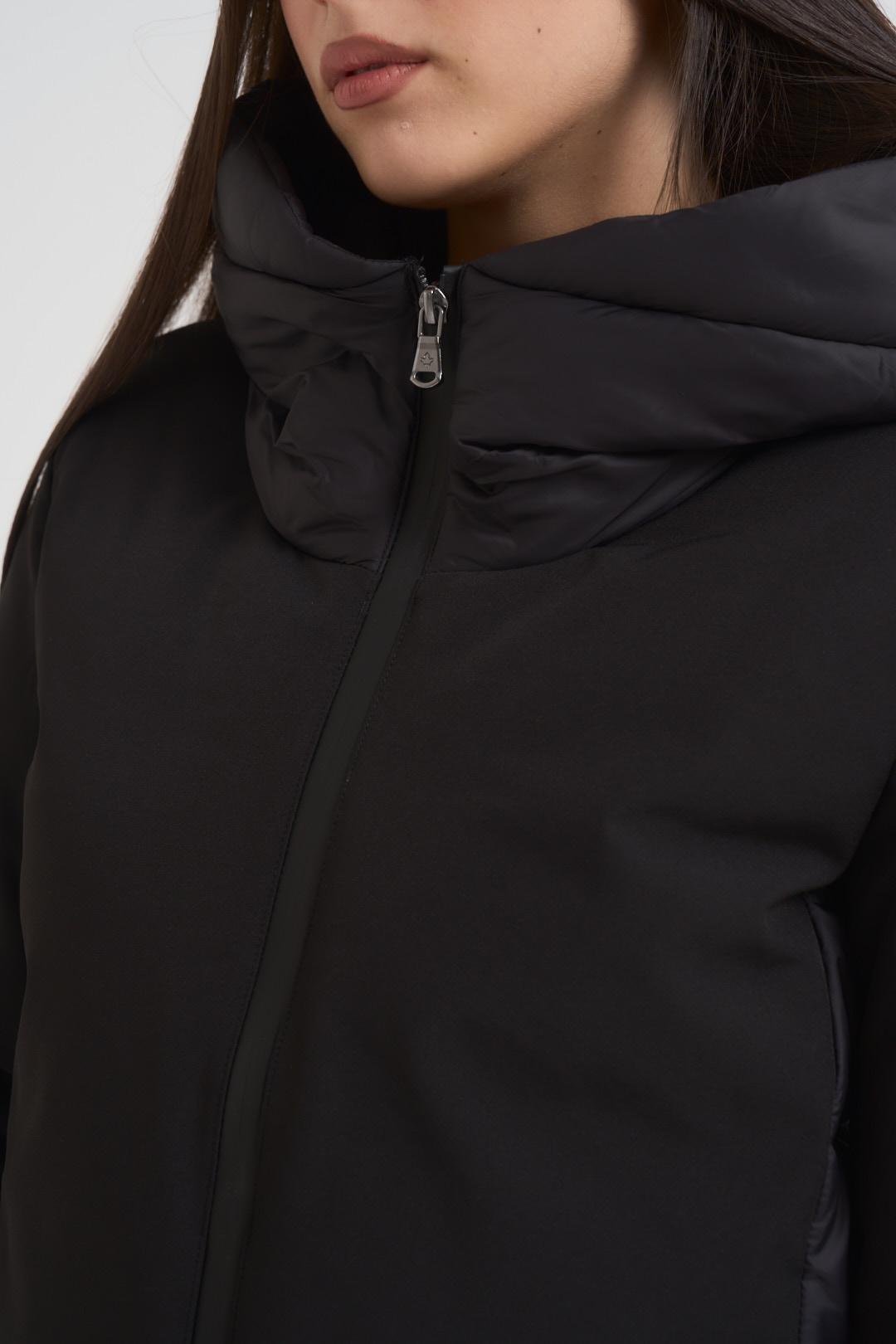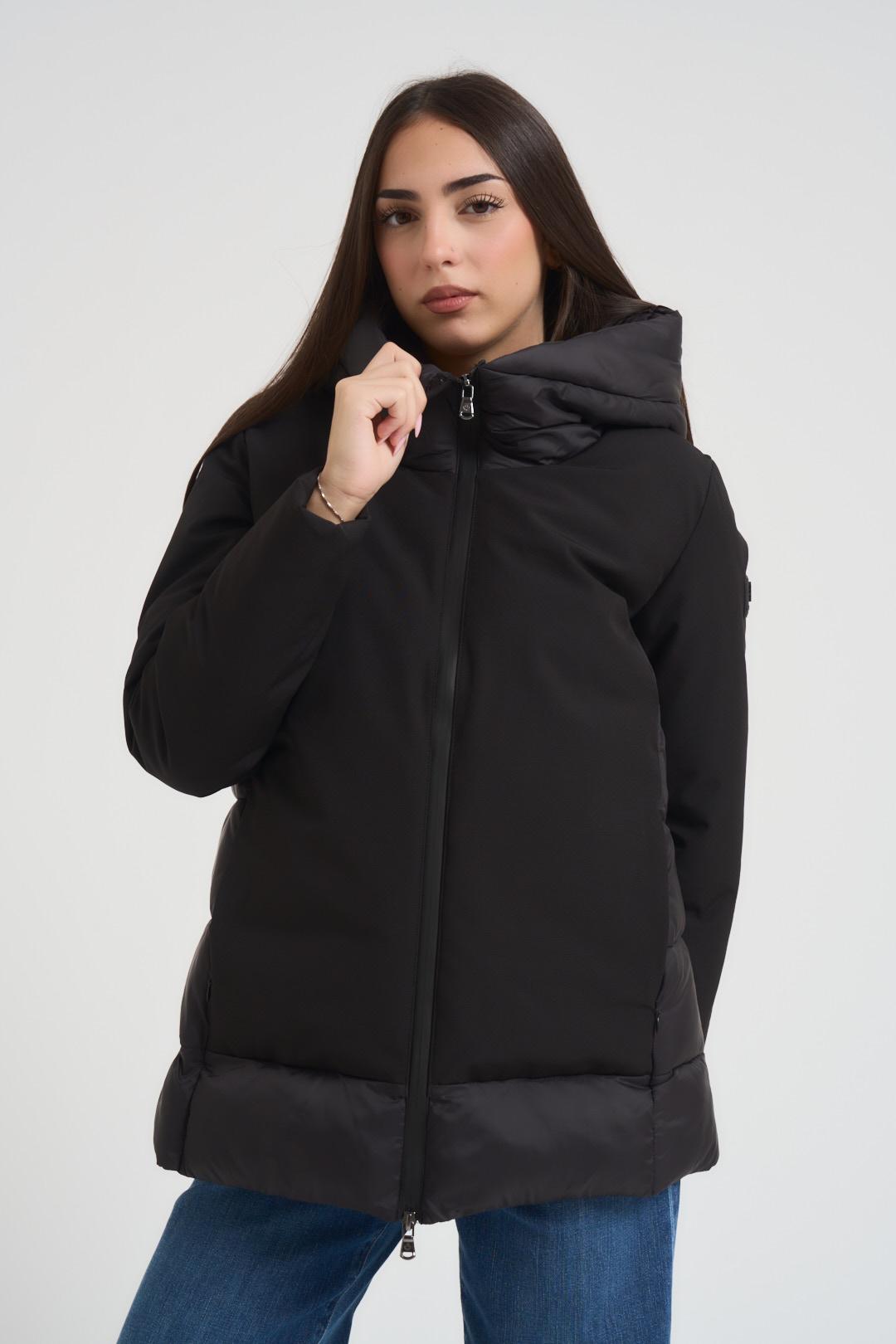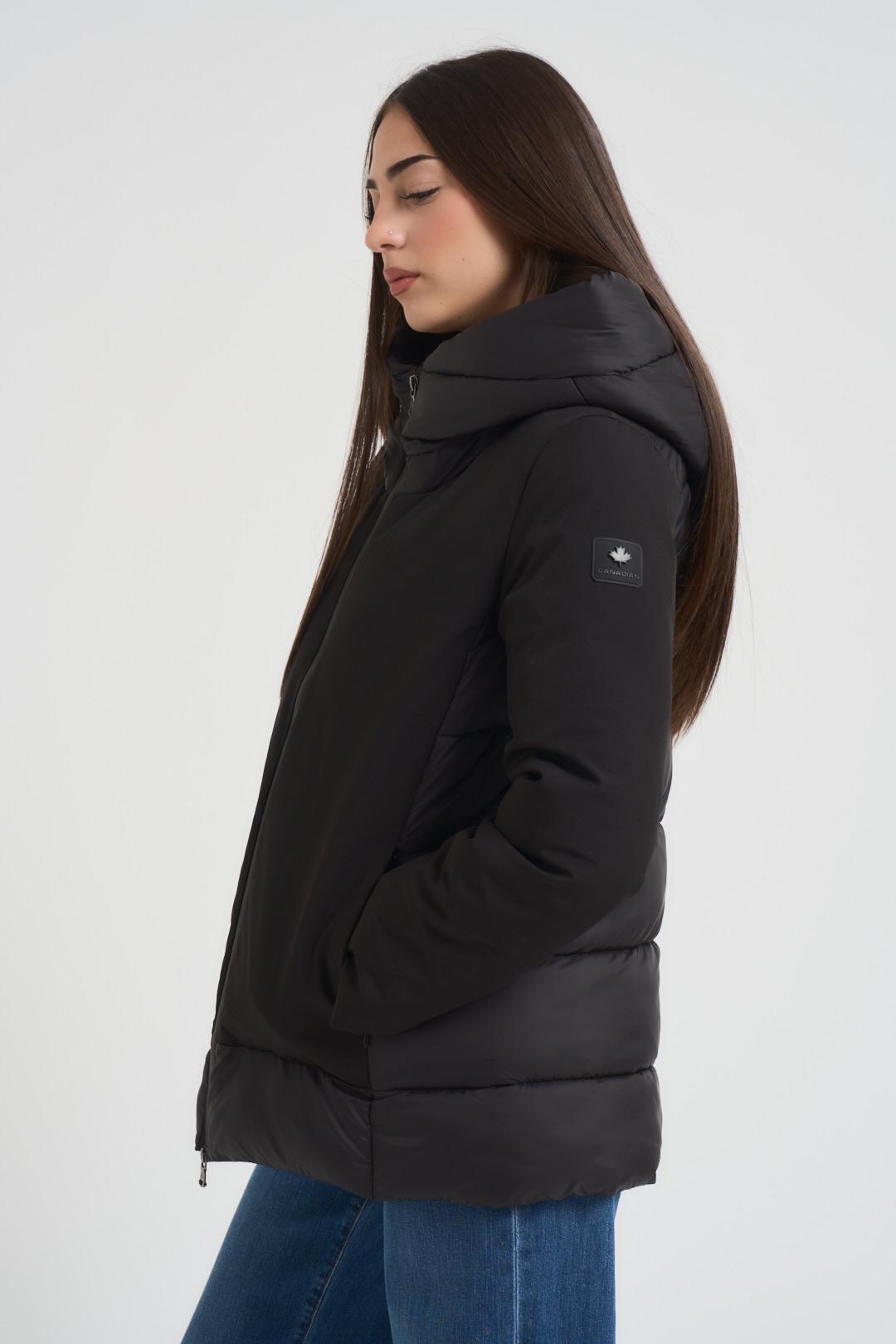 CANADIAN Giubbotto Lytton donna lunghezza tre quarti nero. Modello impermeabile. Imbottito sul retro e liscio davanti. Parte anteriore e maniche elasticizzate. Finitura Bionic idrorepellente. Chiusura con zip nascosta. Due tasche esterne. Compoizione: 90% Poliestere 10% Elastane. La modella è alta 172 cm e indossa la taglia S.