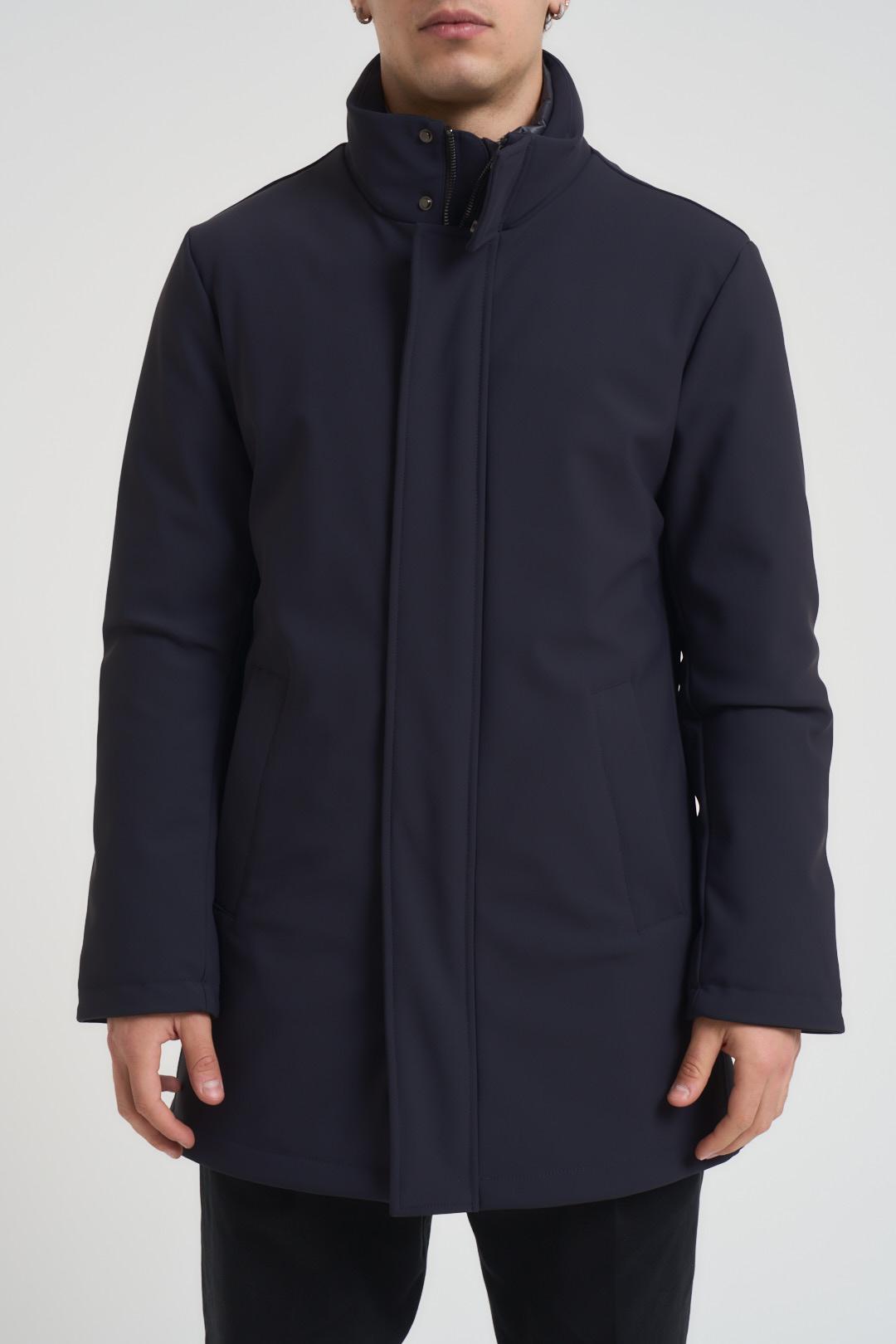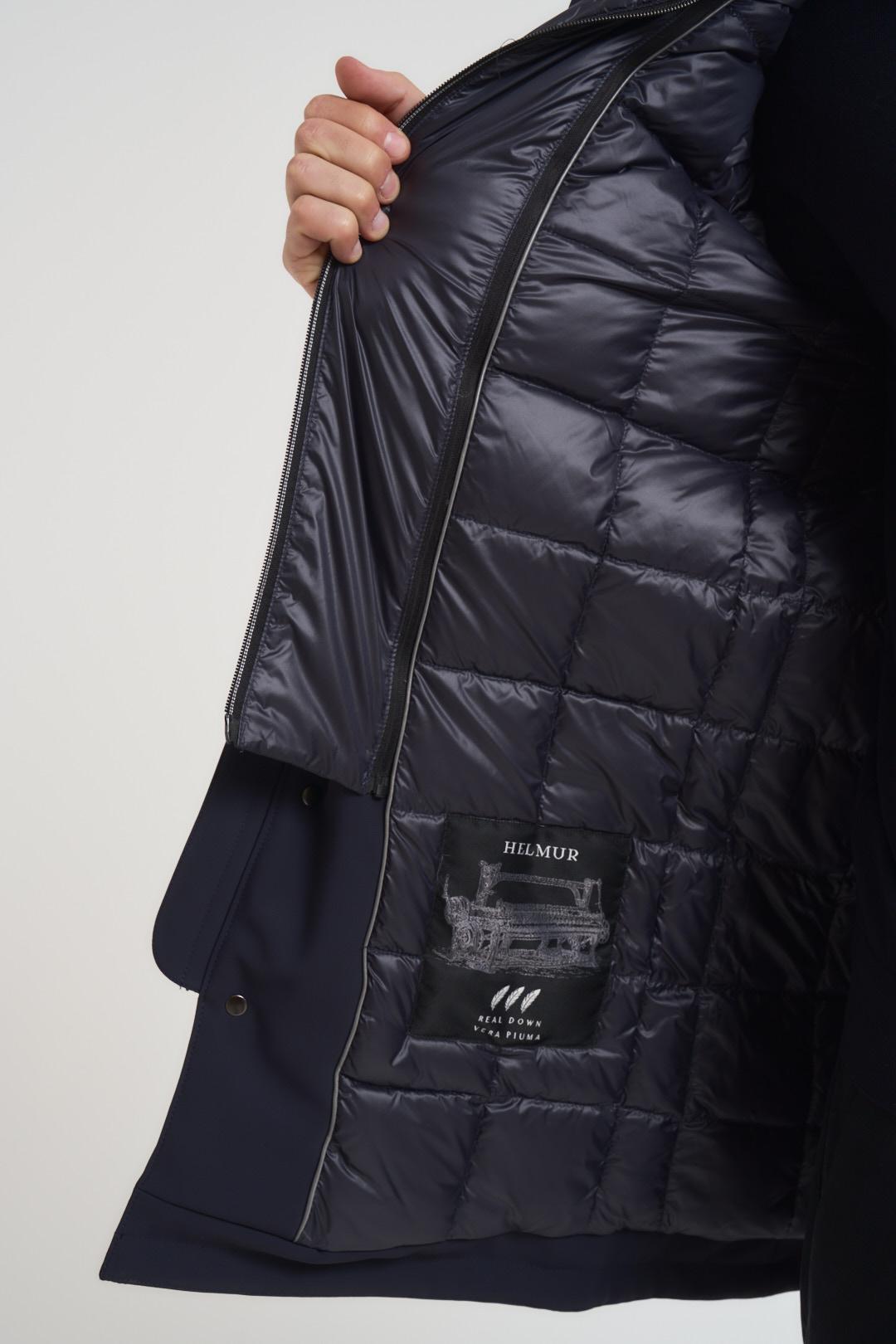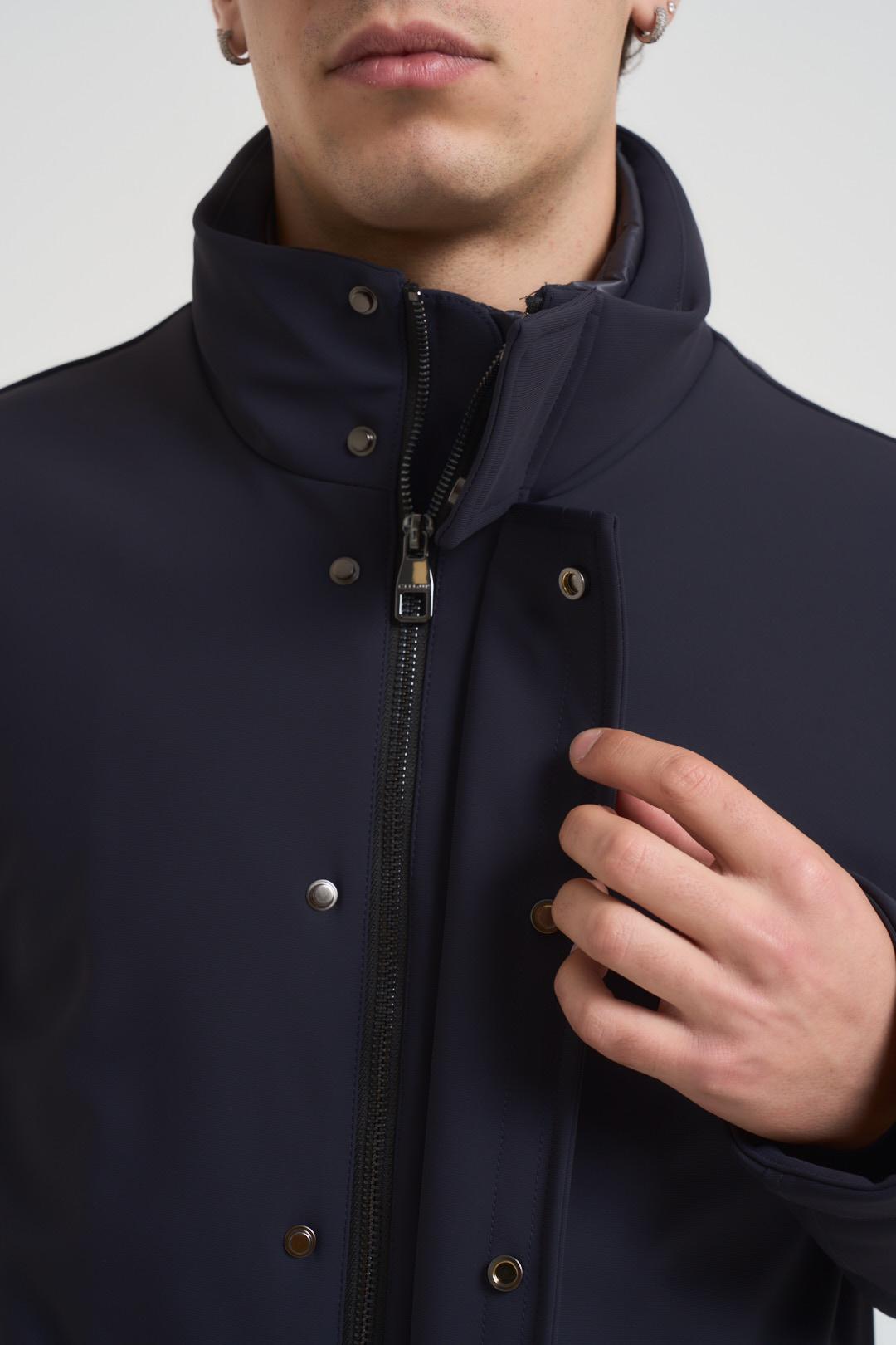HELMUR Giubbotto uomo collo alto blu notte. Modello con chiusura con zip e bottoni automatici. Manica lunga. Collo alto. Tasche a filo. Pettorina removibile tramite zip. Interno trapuntato. Composizione: 95% poliestere, 5% elastane. Il modello è alto 190 cm e indossa la taglia 50.