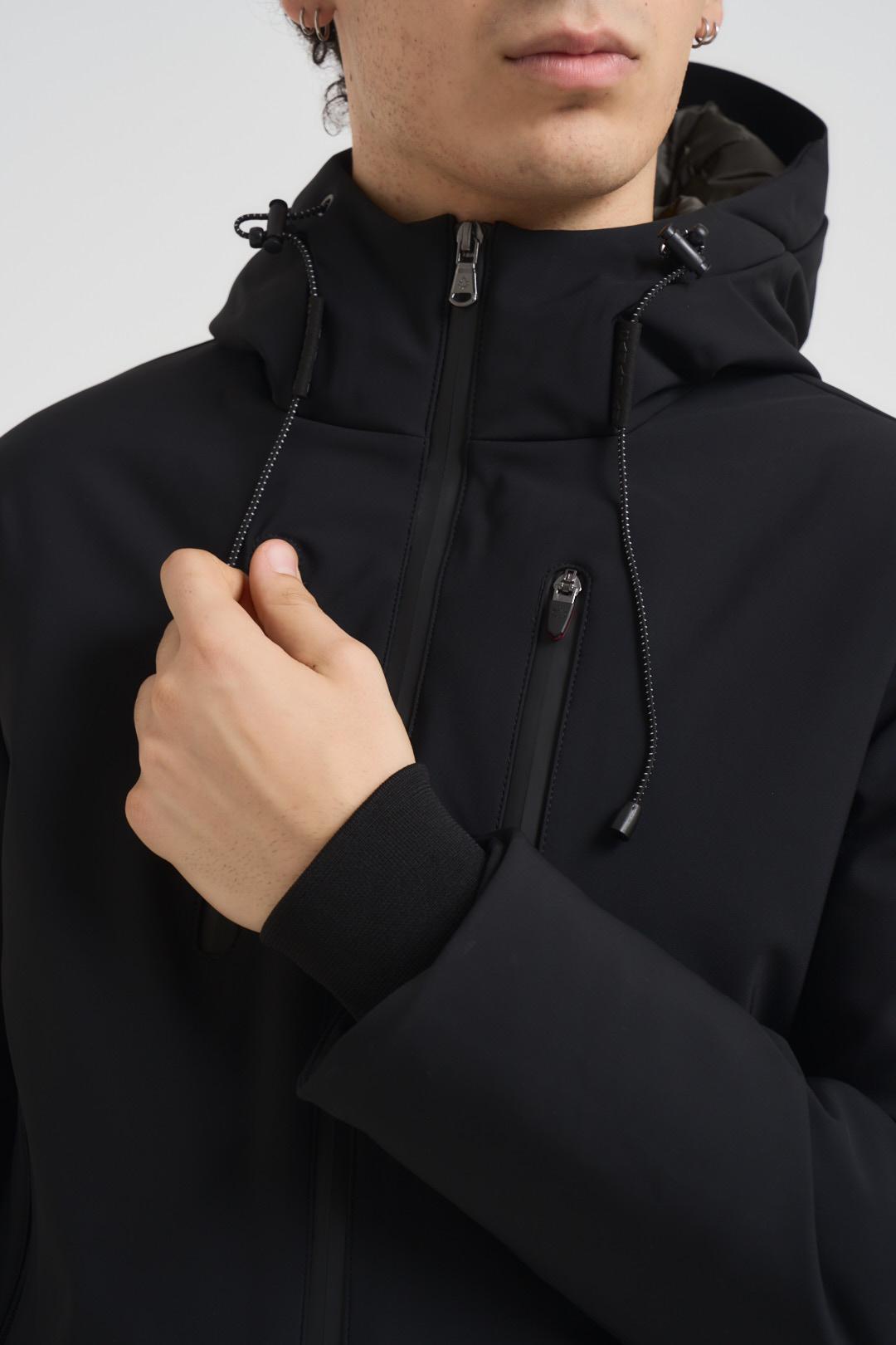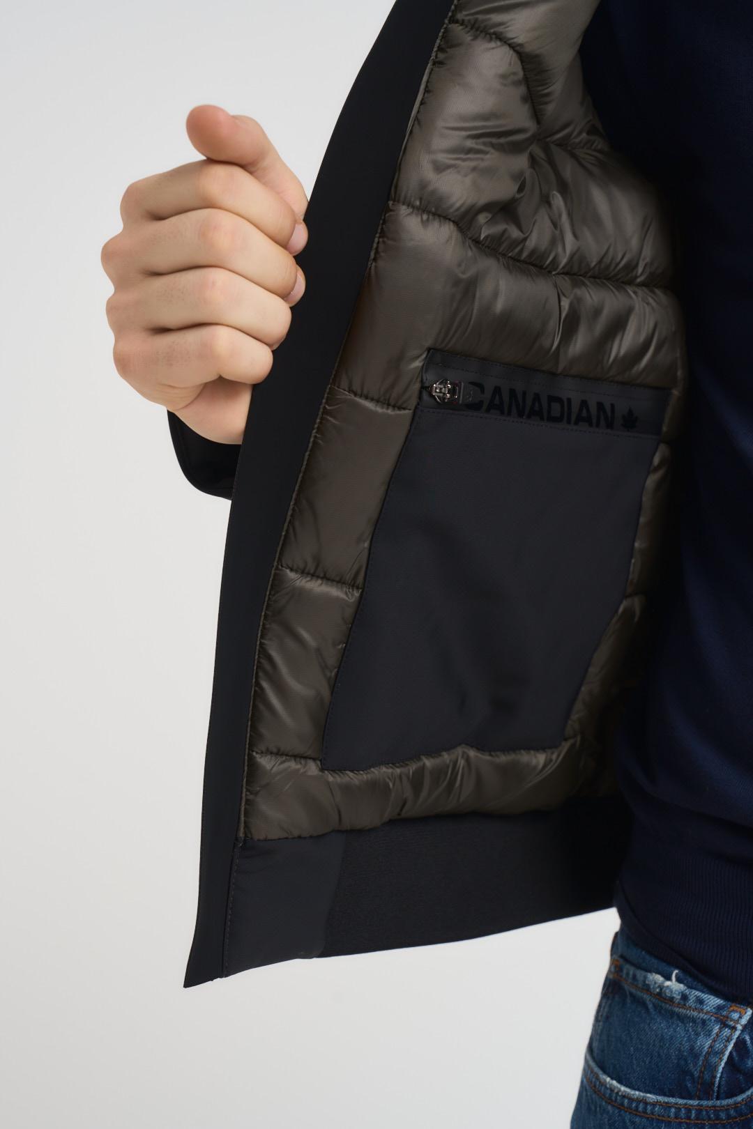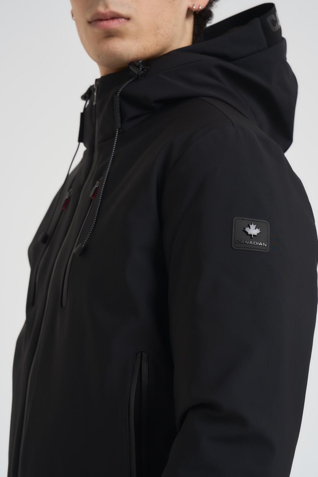 CANADIAN Giubbotto uomo con cappuccio. Giubbotto con tessuto tecnico, tinta unita, collo con cappuccio, maniche lunghe, imbottitura sintetica, chiusura con zip, multitasche. Colore: nero. Il modello è alto 190 cm e indossa la tg L.