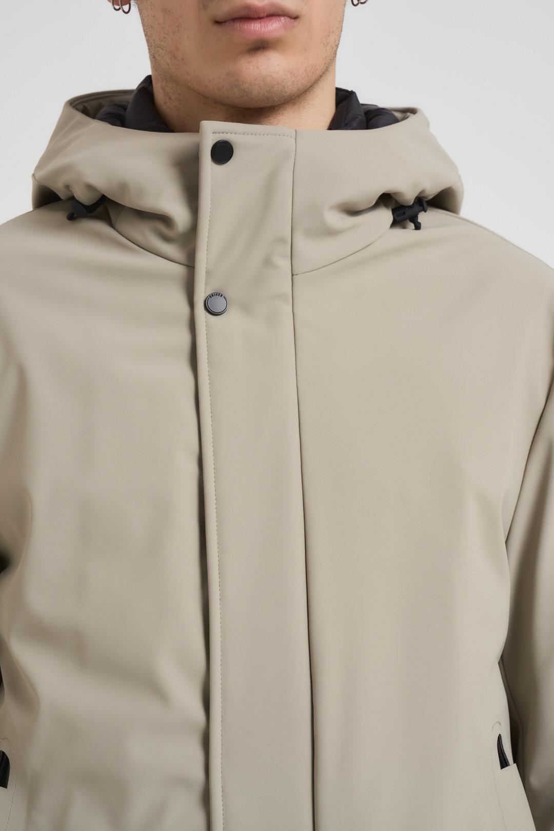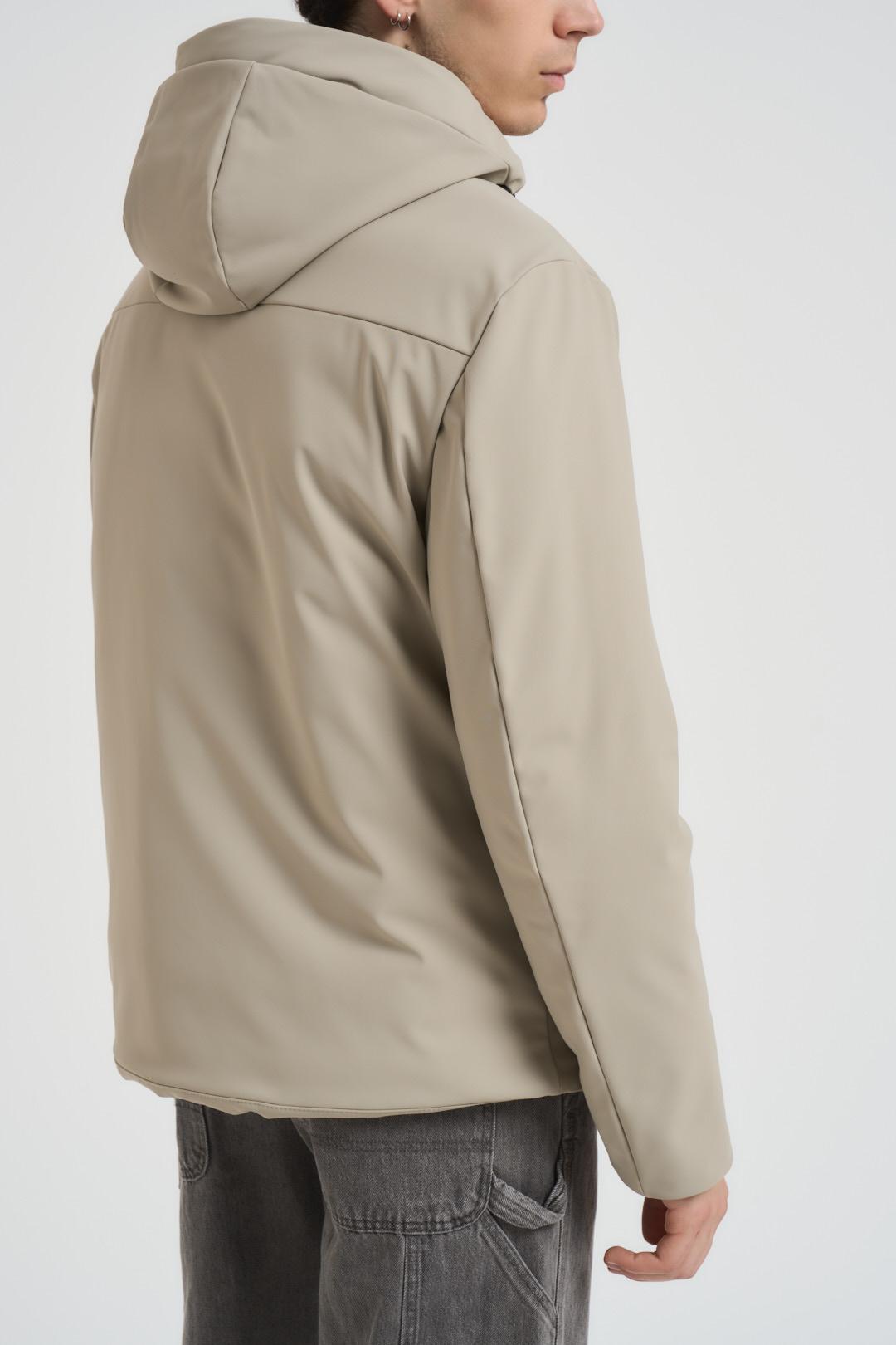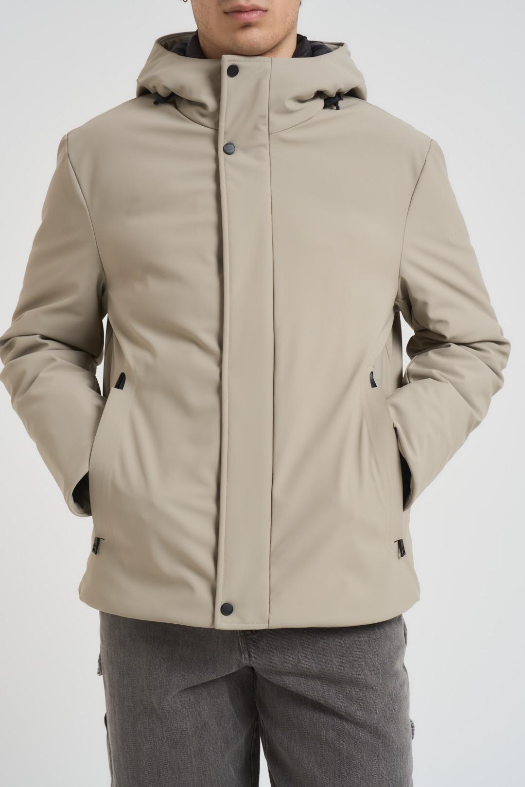SSEINSE Giubbotto uomo con cappuccio grigio chiaro. Modello corto, con chiusura a zip e due tasche a filetto. Composizione: 100% nylon. Il modello è alto 190cm e indossa la taglia L.