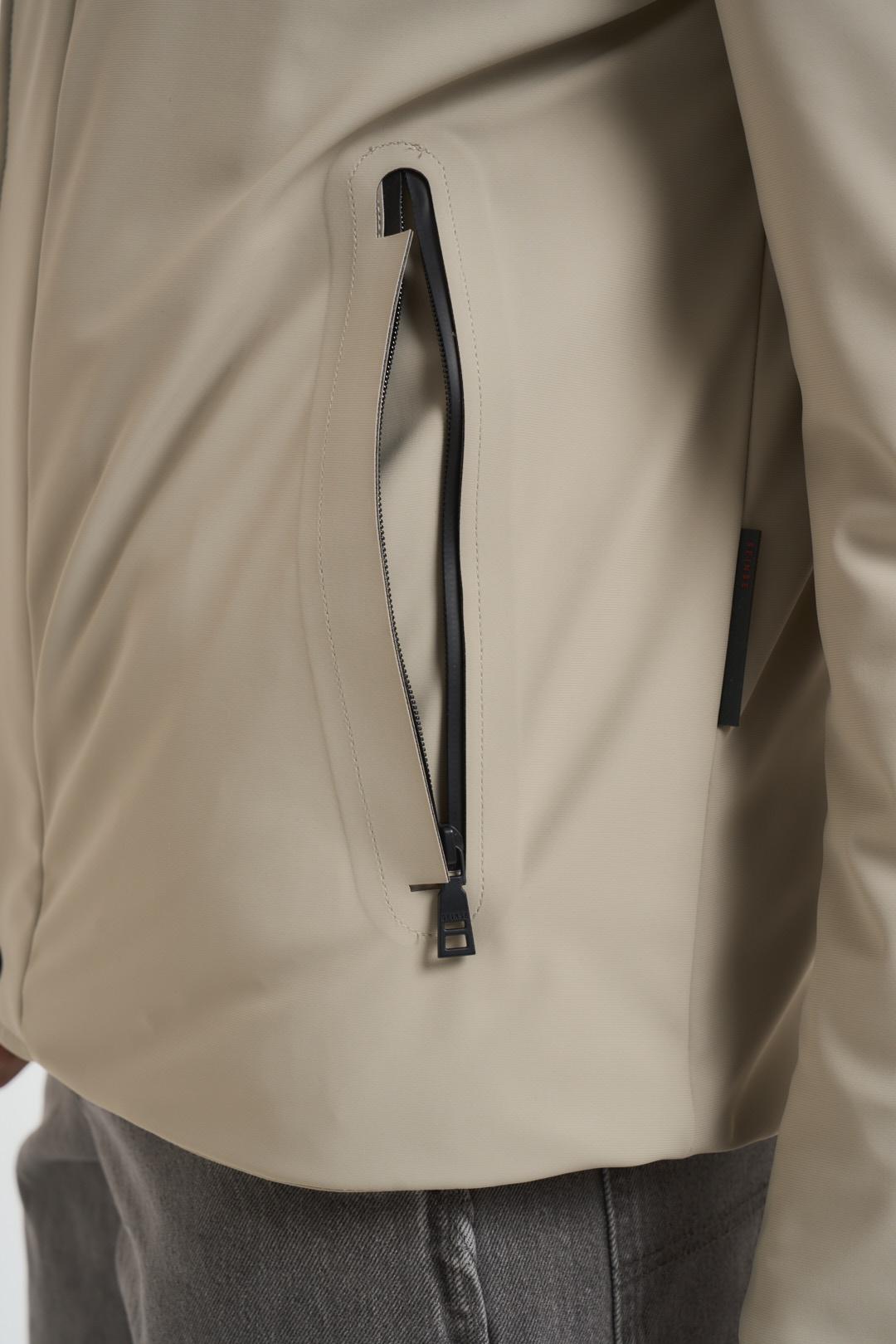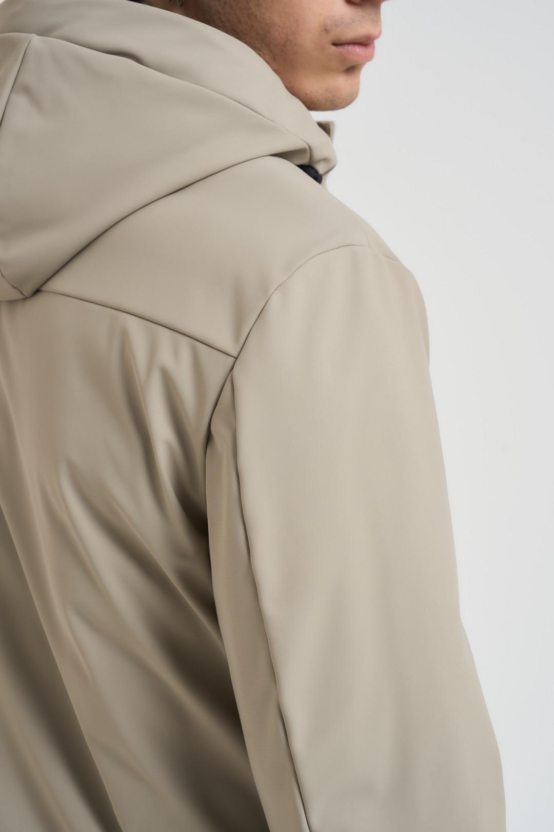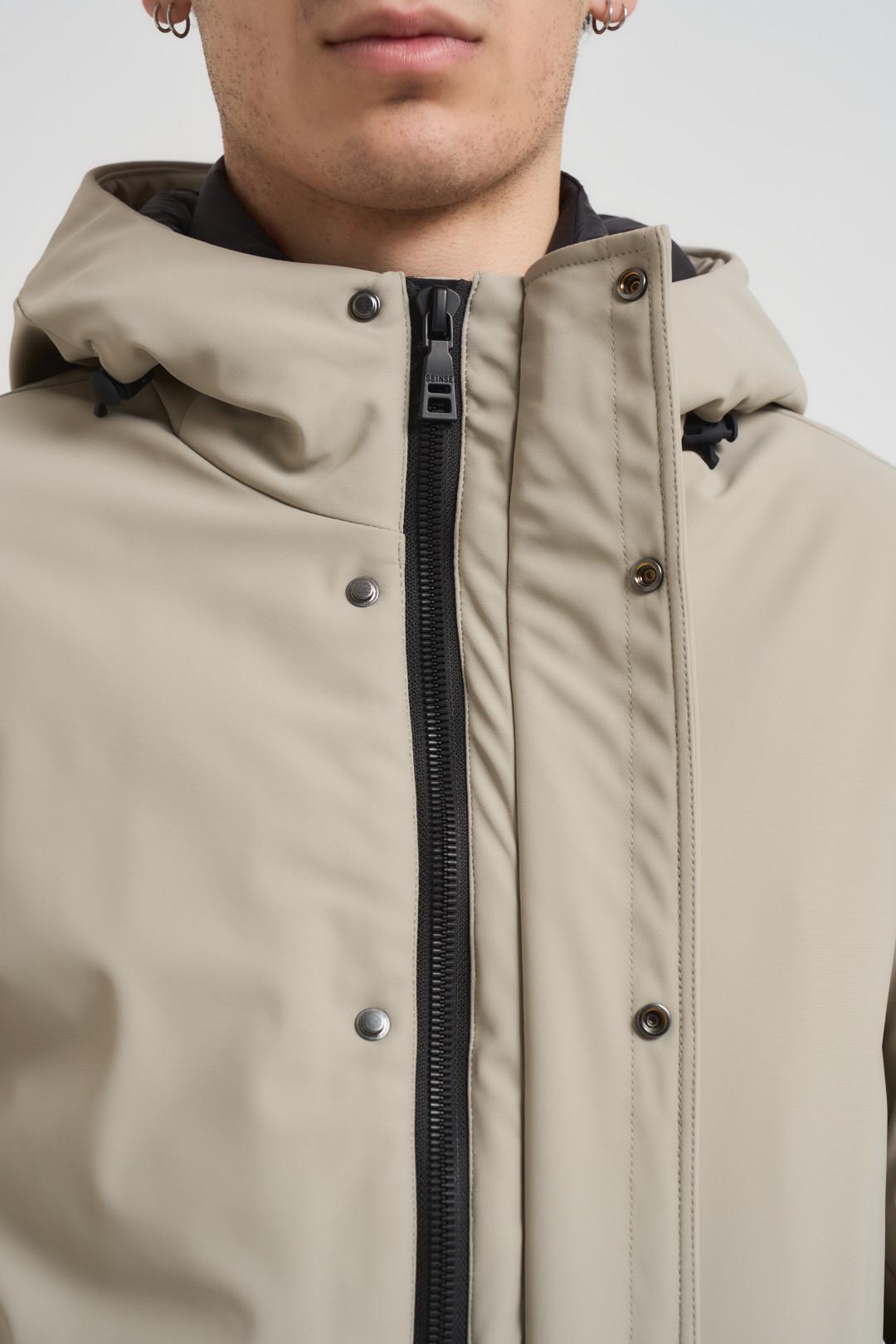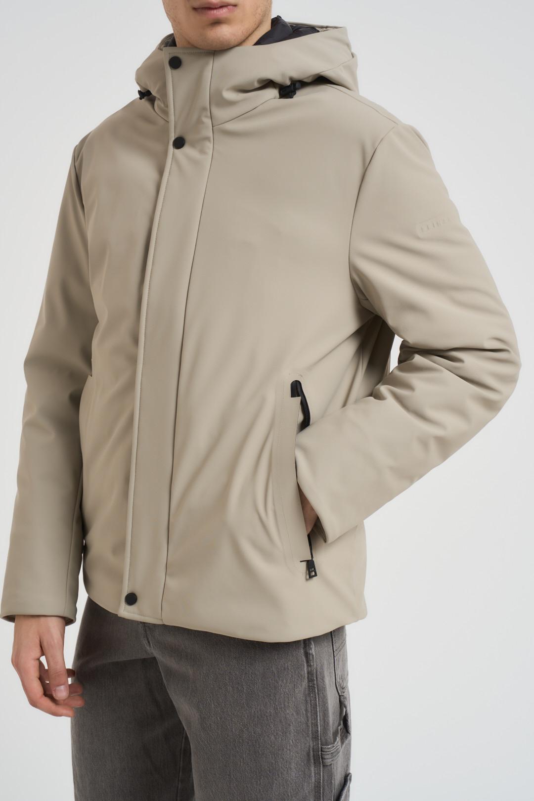 SSEINSE Giubbotto uomo con cappuccio grigio chiaro. Modello corto, con chiusura a zip e due tasche a filetto. Composizione: 100% nylon. Il modello è alto 190cm e indossa la taglia L.